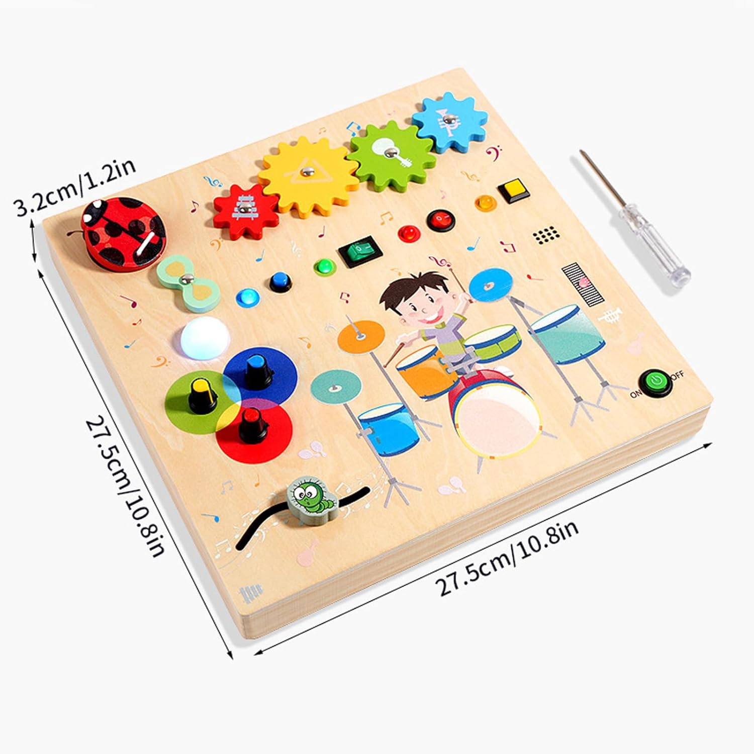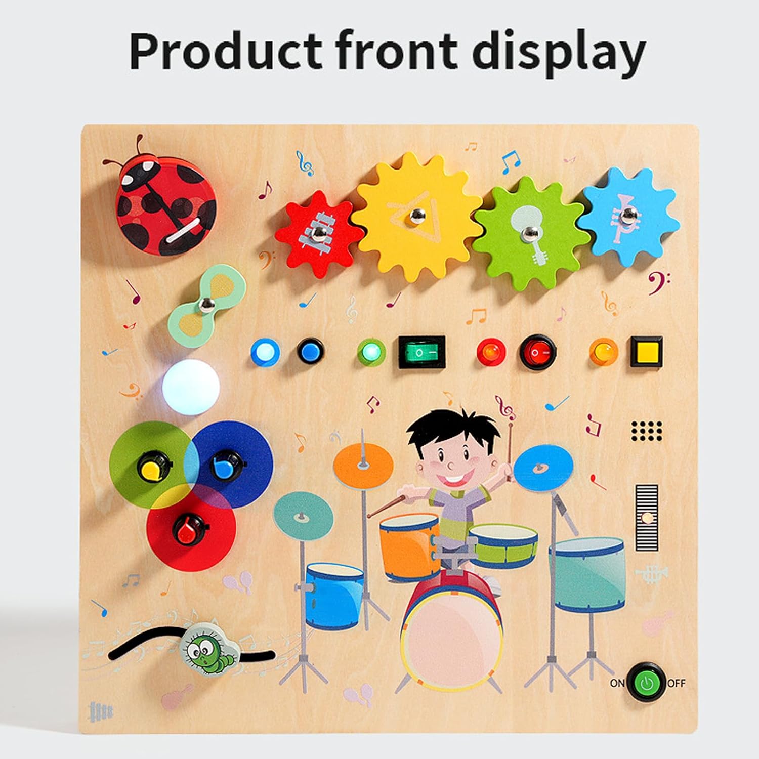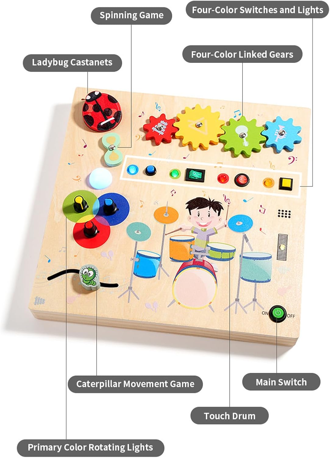 Materiale in legno: realizzato in compensato e plastica selezionati, questa scheda sensoriale è e ideale per bambini e bambini piccoli da giocare senza preoccupazioni. Modello di tamburo: il giocattolo presenta il modello di batteria, simulando l'effetto della batteria reale. Questo aiuta a migliorare la percezione musicale dei bambini fin dalla tenera età. Accattivante design della luce a LED: le luci a LED incorporate sono progettate per attirare l'attenzione dei bambini, aggiungendo un'esperienza visiva divertente e coinvolgente al loro tempo di gioco. CONSIGLIO DI ATTIVITÀ: questo consiglio di attività sensoriale incoraggia i bambini a sviluppare la coordinazione oculare a mano e scatenare la loro immaginazione attraverso il gioco interattivo. Educazione precoce: questa tavola sensoriale in legno è un giocattolo ideale per l'istruzione precoce dell'asilo. Coltiva le mani e l'immaginazione dei bambini.