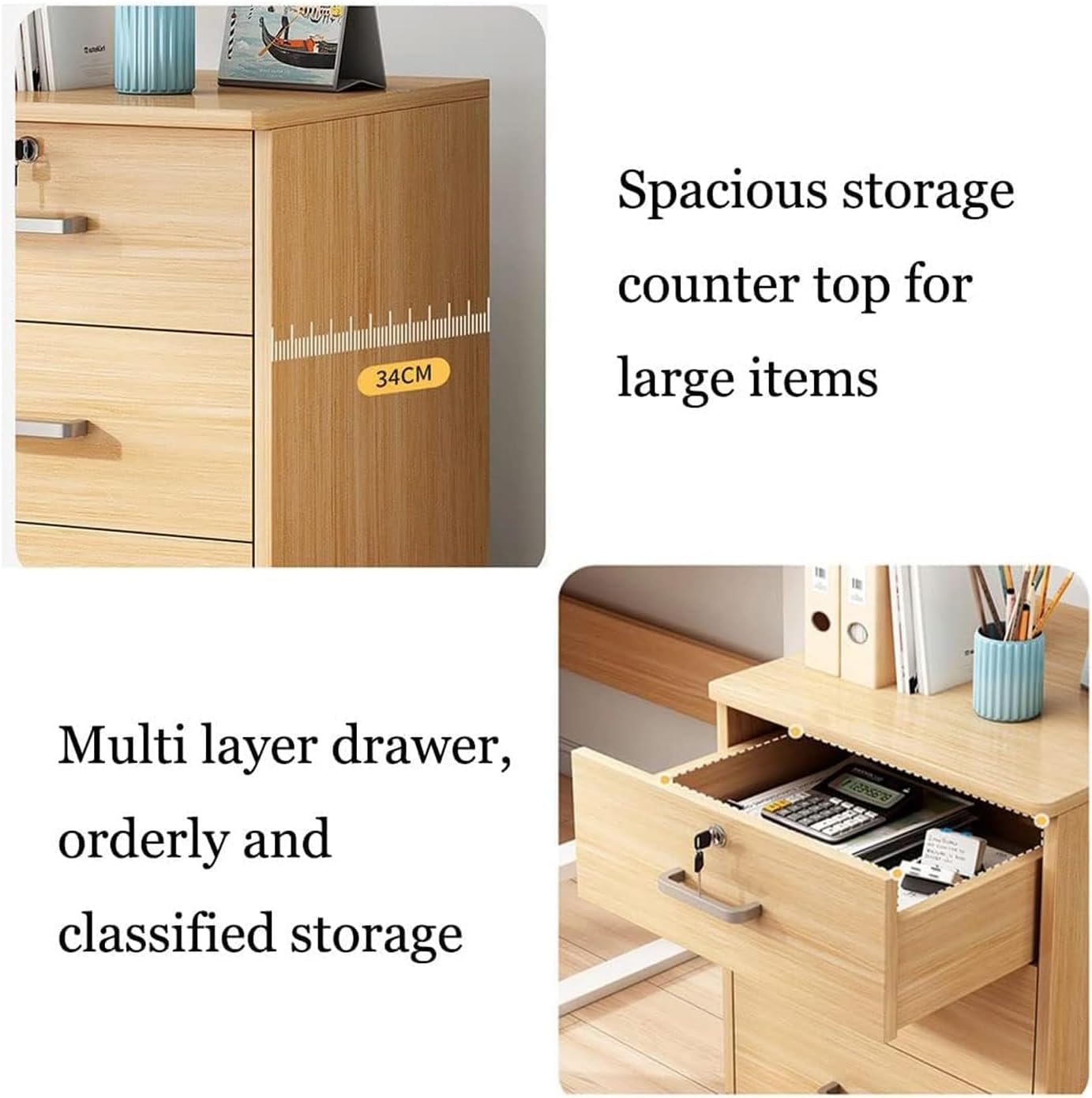 Robusta struttura del pannello a densità: realizzato con pannello a densità di alta qualità, questo schedario combina resistenza con un aspetto elegante e moderno, garantendo un utilizzo duraturo in qualsiasi ambiente di ufficio domestico. Cassetti con chiusura di sicurezza: include tre cassetti con chiusura a chiave, ciascuno con una capacità di carico di 44 libbre, che forniscono uno spazio sicuro e organizzato per riporre documenti importanti e oggetti personali Capacità per carichi pesanti: con una capacità di carico totale di 330 libbre, questo armadio è progettato per supportare un peso significativo, rendendolo adatto per riporre file pesanti e forniture per ufficio Mobilità migliorata: dotato di quattro ruote frenanti universali, l'armadio offre una mobilità fluida e può essere facilmente spostato o bloccato in posizione, fornendo flessibilità e stabilità nel tuo spazio di lavoro Compatto e funzionale: misurazione 37 cm (L) x 34 cm (L) x 59 cm (A), questo mobile compatto scivola facilmente sotto la maggior parte delle scrivanie, ottimizzando lo spazio di lavoro e fornendo ampio spazio di archiviazione.
