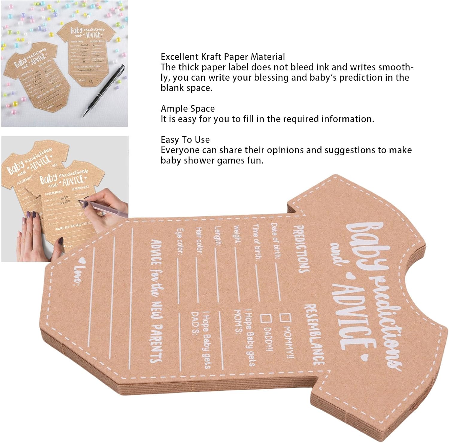 Materiale di carta Kraft eccellente: realizzato con carta kraft spessa e non sanguinante, queste schede di previsione del bambino assicurano una scrittura slick senza sanguinare a inchiostro. Questa qualità consente ai nuovi genitori di annotare facilmente i loro desideri e previsioni per il loro piccolo, creando un ricordo duraturo che possono fare tesoro per gli anni a venire. Design affascinante: le schede di consulenza per baby shower sono progettate a forma di tutina adorabili, fornendo ampio spazio per scrivere informazioni essenziali e messaggi sinceri. Questo design giocoso non solo rende le carte visivamente accattivanti, ma aggiunge anche un elemento divertente alla doccia o alla celebrazione, incoraggiando gli ospiti a partecipare. Uso versatile: con un retro vuoto disponibile per ulteriori suggerimenti o singoli messaggi, queste carte dei giochi per baby shower soddisfano i requisiti di tutti. Permette un'esperienza coinvolgente nelle docce per bambini, in cui gli ospiti possono condividere liberamente le loro intuizioni, consigli e benedizioni, rendendo l'evento interattivo e memorabile. Memorabili ricordi: queste carte per le decorazioni per baby shower sono adatte per preservare i ricordi. Dopo la nascita del bambino, i nuovi genitori possono rivisitare questi messaggi e previsioni sinceri, creando un viaggio sentimentale su cui guardare indietro, pieno di amore e risate man mano che la famiglia cresce. Ampia applicazione: che si tratti di una baby shower, di una festa di rivelazione di genere o di una celebrazione di compleanno, queste carte di consulenza per il matrimonio sono una buona aggiunta a qualsiasi evento. Non servono solo come arredamento affascinante, ma anche come oggetti di gioco coinvolgenti, migliorando l'atmosfera gioiosa, fornendo agli ospiti un modo per contribuire al futuro del bambino in modo significativo.