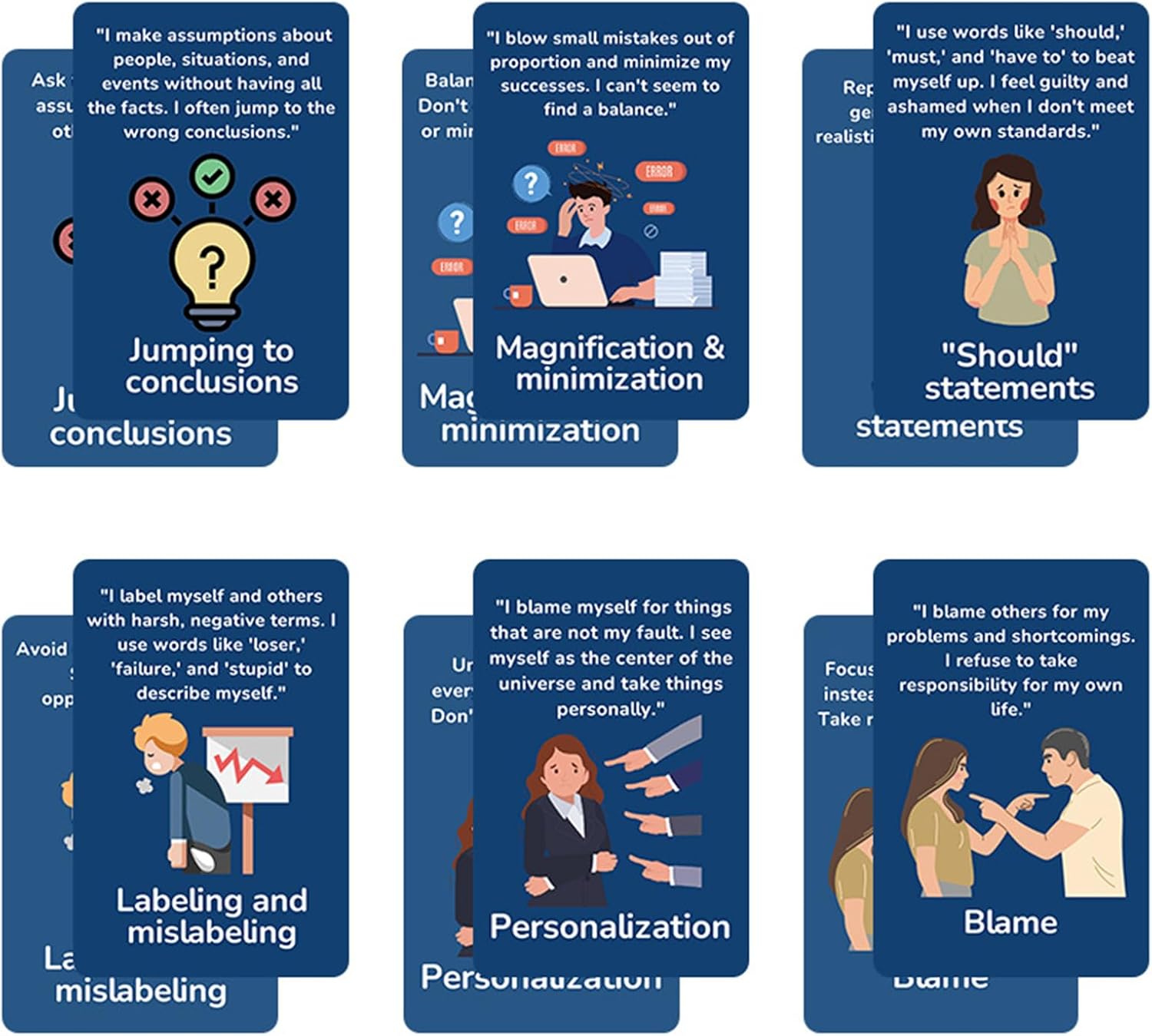 Portatili e facili da usare: con un design delle dimensioni della mano, le carte offrono assistenza mentale istantanea e portatile, adattabili a varie configurazioni senza compromettere la facilità d'uso. Chiarezza durevole: la laminazione resistente allo strappo, combinata con la sicurezza degli angoli arrotondati, fornisce una protezione affidabile contro usura e sporco, garantendo una visibilità sostenuta e comfort dell'utente per lunghi periodi. Mentalità di crescita interattiva: promuove modelli di pensiero positivi con le carte, combinando tecniche di apprendimento delle abilità e mentalità di crescita in un formato altamente interattivo che consente un coinvolgimento prolungato degli utenti durante il gioco. Copertura della sfida olistica: progettata per fornire supporto alla salute mentale, unisce adolescenti e adulti attraverso un progressivo che consente rilevanza e assistenza in varie fasi e scenari della vita. supporto per lo sviluppo delle competenze: con risorse basate su , queste carte offrono agli utenti tattiche di regolazione delle emozioni, approcci di gestione dello stress e strategie di miglioramento della comunicazione per navigare efficacemente nelle complessità della vita.