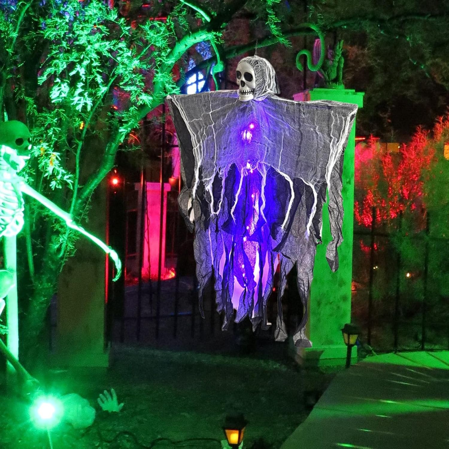 Installazione flessibile: consente una facile installazione con il gancio regolabile incluso per ringhiere, alberi e pareti. La connessione di alimentazione nascosta garantisce un'installazione pulita e opzioni di posizionamento flessibili senza cavi visibili. Effetti di luce speciali: la funzione di sfarfallio simula il movimento spettrale, dona una profondità inquietante con effetti di luce dinamici e impressiona con un eccellente design di illuminazione multistrato per la decorazione di Halloween. Integrazione dei fendinebbia: le prese d'aria consentono un flusso continuo di nebbia per giochi di luci atmosferici che creano una magica atmosfera di Halloween. Resistenza agli agenti atmosferici: il rivestimento speciale offre un'eccellente protezione dal sole e dalla pioggia, mantiene forma e luminosità durante l'uso esterno a lungo termine. Decorazione del giardino e del corridoio: con la struttura fluttuante 3D e la sorgente luminosa integrata, questo scheletro crea un effetto luminoso spettrale. Ideale per effetti notturni suggestivi in ambienti esterni o corridoi.