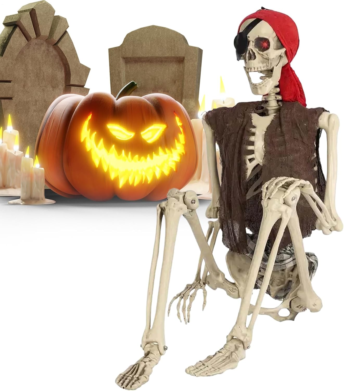 Posizionamento flessibile: i giunti regolabili dello scheletro pirata consentono di piegare gli arti flessibili per posare seduti o sdraiati, semplificando l'integrazione in corridoi, cortili o altri luoghi di ispirazione con display creativo Arricchisci Ambiance: l'atteggiamento espressivo e il look ricco di dettagli garantiscono un'esperienza thrilly e allegra durante le feste a tema pirata o Halloween e favoriscono l'interazione Effetto istantaneo: completamente assemblato e immediatamente utilizzabile per eventi a tema pirata, questo scheletro può essere facilmente posizionato su verande, alberi, prati o sedie e dona immediatamente un'atmosfera pirata autentica senza alcuna preparazione Design unico: lo scheletro dei pirati con fascia rossa e benda per gli occhi e vestiti sbriciolati creano un'atmosfera affascinante e spaventosa. Perfetto per decorazioni per casa spaventosa e feste di Halloween. Aumenta l'effetto immersivo di ogni scenario spaventoso grazie ai dettagli autentici e all'aspetto esposto alle intemperie. Durevole e resistente: i materiali di alta qualità e la lavorazione stabile consentono un uso duraturo dello scheletro dei pirati in diverse condizioni, ideale per un uso continuo all'interno o all'aperto con una lunga durata