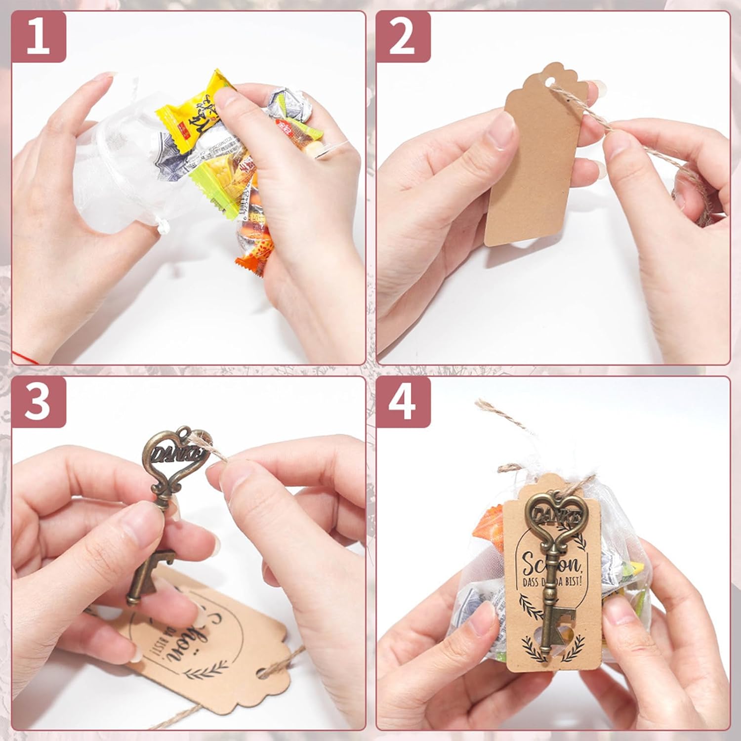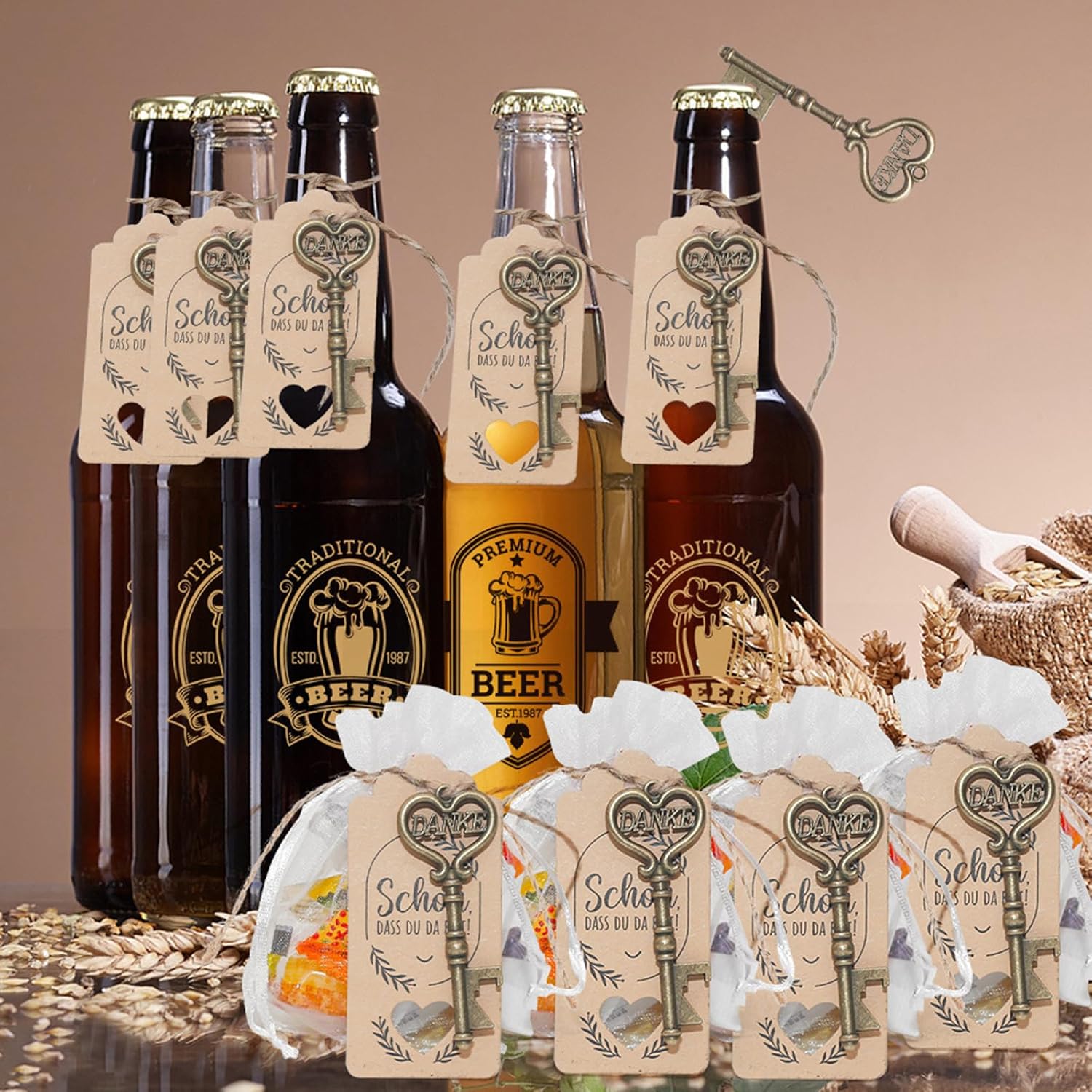 Matrimonio per apribottiglie Bulks: il nostro apribottiglie sfuso viene fornito con 50 x per apribottiglie, etichette desideri, corde, sacchetti di organza (la capacità può contenere 4-6 caramelle), regali caldi e unici adatti per matrimoni, anniversari o addio al nubilato regali di apprezzamento per gli ospiti, la quantità appropriata può soddisfare le vostre esigenze principalmente di festa Set di bomboniere per feste: il set di bottiglie viene fornito con etichette dei desideri per consentire di scrivere nome, data e auguri, parole di gratitudine, far sentire i tuoi ospiti dolci, questi sono perfetti per matrimoni, anniversari, baby shower e varie feste a tema, decorare bene la tua festa Premium Gli apribottiglie sono realizzati in lega di zinco qualificata, bordo rotondo lucidato senza sbavature, ben tagliato e non facile da rompere, non sbiadisce, antigraffio con prestazioni Retro per apribottiglie: apribottiglie con tecnologia elettroplaccata, senza piombo e antiruggine, caratterizzato da parole scheletro di ringraziamento, design retrò unico antigraffio è per decorazioni a tema varietà, per personalizzare e migliorare il profilo della tua festa Ampia gamma di occasioni: i nostri apribottiglie possono essere perfettamente applicati in varie occasioni come matrimoni, ristoranti, hotel, riunioni commerciali e un'ampia gamma di utilizzo per varie feste e banchetti