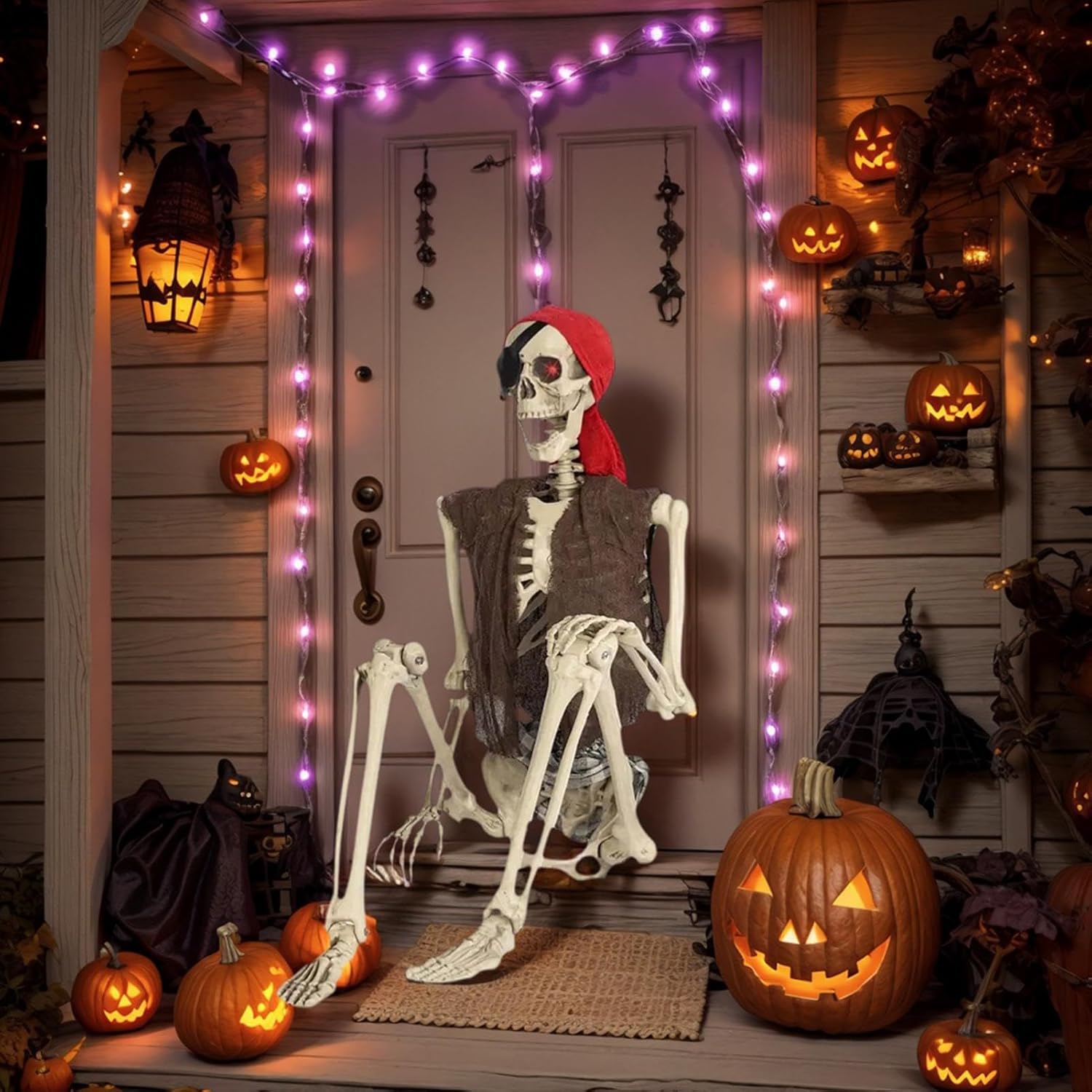 Angoli di visualizzazione: con giunti regolabili, questo scheletro di pirata consente la flessione naturale degli arti per posizioni sedute o sdraiate realistiche, ideale per decorazioni creative in interni, corridoi o cortili senza necessità di assemblaggio Intensifica l'esperienza: con pose realistiche e aspetto accattivante, questo elemento decorativo diffonde un'atmosfera spettrale e gioiosa unica e incoraggia attività congiunte alle feste a tema Facile posizionamento: appositamente progettato per un utilizzo rapido e senza sforzo senza montaggio, questo scheletro di pirata è ideale pronto all'uso per il posizionamento su portici, alberi, prati o sedie in qualsiasi festa pirata festiva Dettagli realistici: la fascia rossa e la benda sull'occhio conferiscono allo scheletro un aspetto da pirata realistico. Gli abiti laceri contribuiscono a creare un'autentica sensazione inquietante. Ideale per feste a tema o produzioni domestiche spaventose con un livello di dettaglio e un effetto impressionante. Costruzione resistente alle intemperie: il versatile scheletro del pirata combina proprietà resistenti alle intemperie con una struttura robusta per un utilizzo senza soluzione di continuità all'interno e all'esterno, nonché opzioni di decorazione di lunga durata