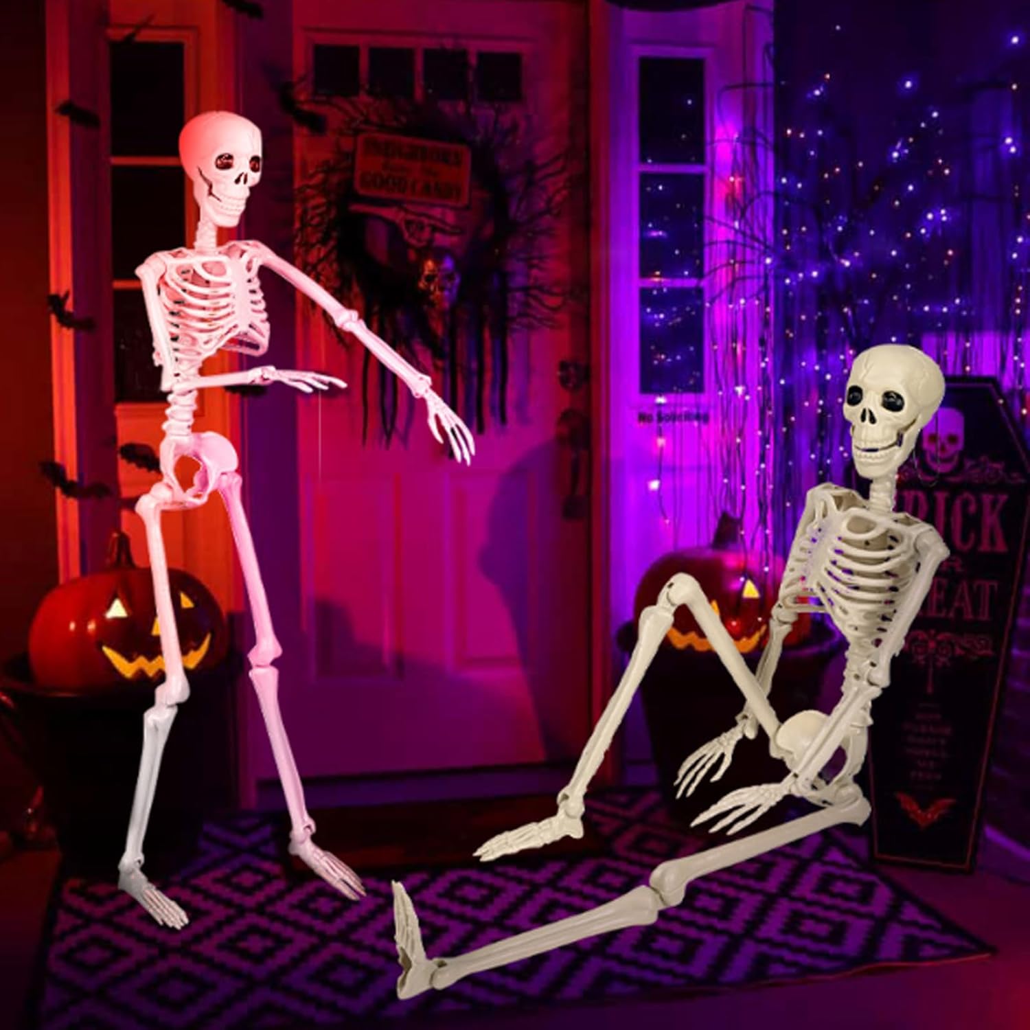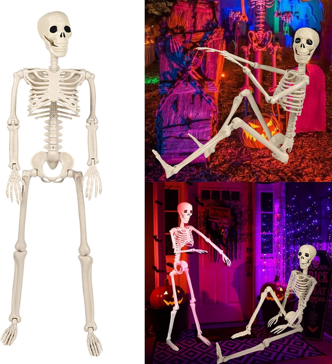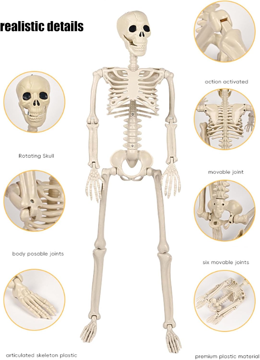 Migliora la tua decorazione di Halloween con lo scheletro realistico, dotato di giunti mobili disegni. Realizzato in plastica, questo scheletro a corpo intero è posizionabile, permettendoti di piegarlo in varie posizioni ossessionanti per la tua celebrazione. Adatto per educatori, artisti e studenti di medicina, questo scheletro serve come modello anatomico accurato per l'apprendimento o come oggetto di scena agghiacciante per esposizioni a tema. Trasforma qualsiasi spazio in una scena agghiacciante; adatto per case infestanti, feste di Halloween o ambienti educativi come studi d'arte. Con le sue parti facili da montare e l'opzione di sospensione, questo scheletro realistico è essenziale per creare aria inquietante questa stagione di Halloween.