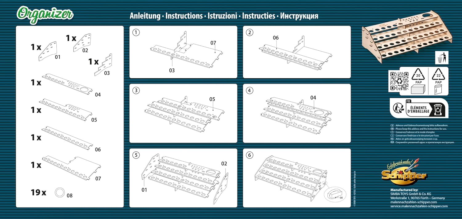 Semplice: possibilità di conservazione di alta qualità per vasini, pennelli, vernici finali e penne per dotting. Schipper Pratico: facile da assemblare per un organizzatore stabile e il modo perfetto per conservare le cose più importanti Qualità: l'organizer è realizzato in legno di tiglio e ha una dimensione di 19 x 39 x 10 cm Possibilità di riporre gli accessori per dipingere con i numeri, in modo che tutto sia a portata di mano Produttore tedesco: Schipper offre un'ampia scelta di motivi per adulti e bambini. La qualità viene portata al livello successivo e la tecnica della pittura è quasi impossibile da vedere