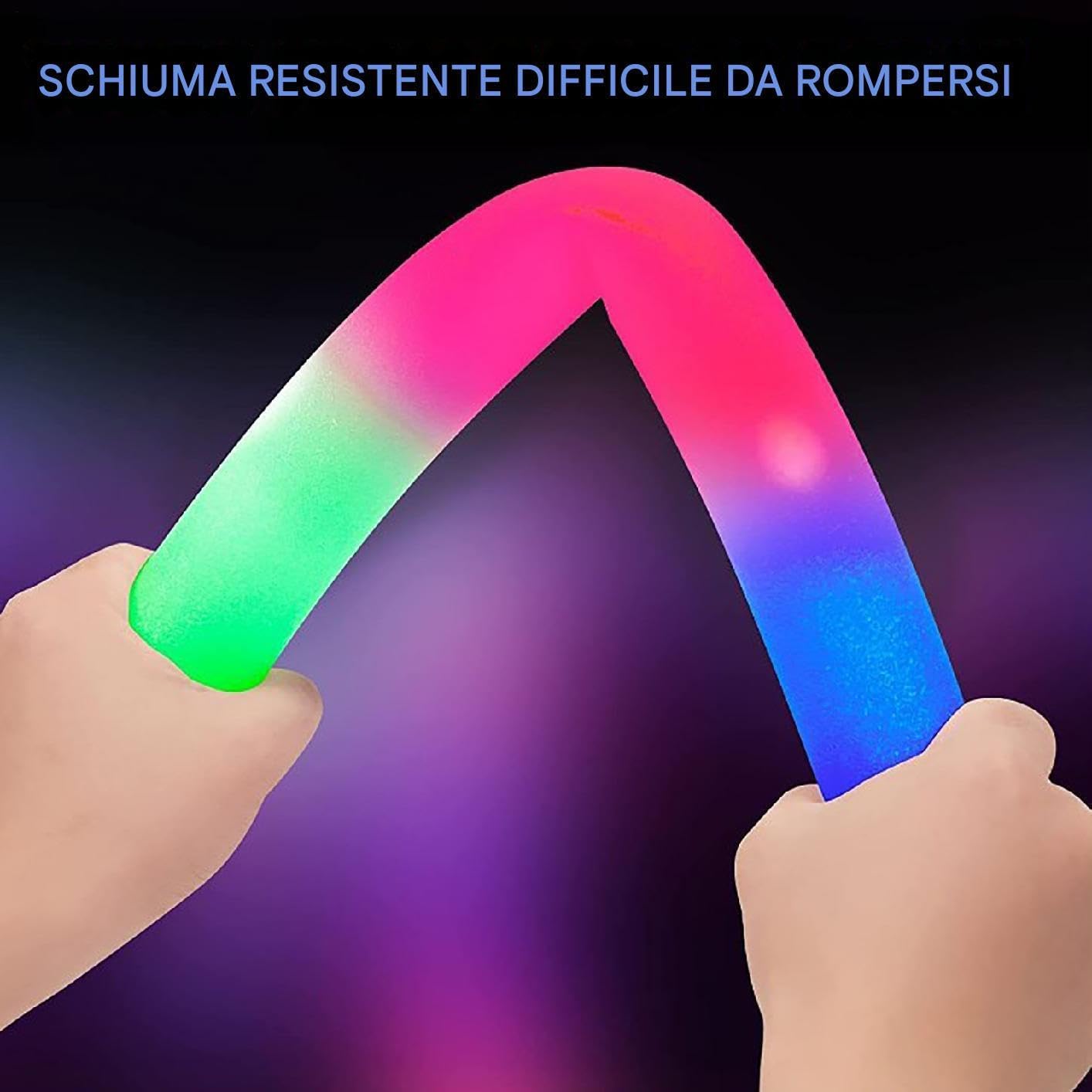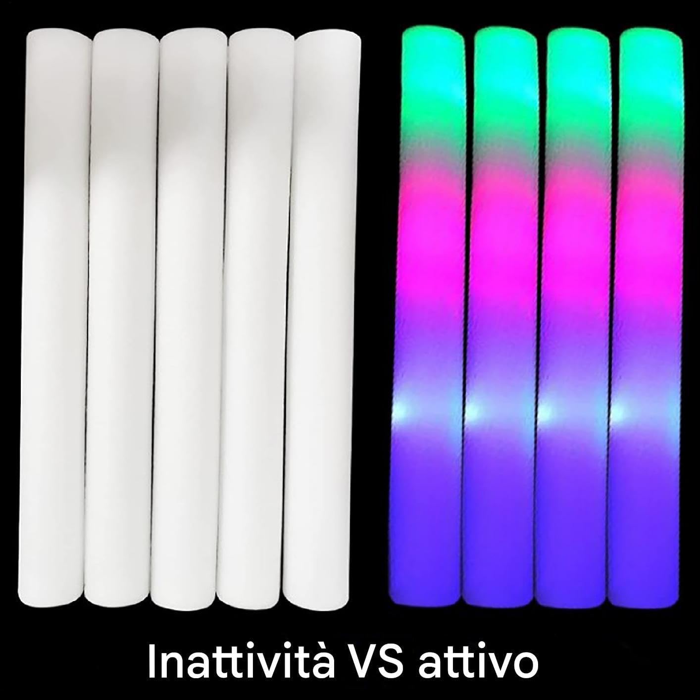 MIGLIORA L'ATMOSFERA: questi vibranti bastoncini di schiuma offrono più intrattenimento e migliorano l'atmosfera di qualsiasi evento. Scegli tra 3 diverse modalità di illuminazione: lampeggiamento veloce, lampeggiamento lento e lampeggiamento alternato e premi il pulsante di accensione per provare il grande divertimento. Meravigliosamente progettato per migliorare l'atmosfera 'evento Ampia gamma di usi: aggiungi un po' di entusiasmo ai tuoi incontri con questi bastoncini luminosi in schiuma. Sono abbastanza versatili da poter essere utilizzati come giocattoli per eventi e sono un must per qualsiasi cosa, dalle feste di Natale e Halloween ai matrimoni e compleanni Brillantezza duratura: i nostri bastoncini luminosi in schiuma sono prodotti sotto severi controlli di qualità e sono realizzati con materiali durevoli che forniscono fino a 6 ore di luce . Puoi goderti il tuo evento senza preoccuparti che venga oscurato e continuare il divertimento fino al sorgere del sole Piacere portatile: ogni di schiuma ha un pulsante di accensione/spegnimento per il risparmio energetico e viene fornito con batterie sostituibili all'interno, garantendo un utilizzo e un divertimento più lunghi Schiuma : goditi un divertimento sicuro e duraturo con i nostri bastoncini luminosi in schiuma realizzati in materiale flessibile e robusto, adatti a bambini 3 anni in su. Mantieni l'evento in tutta tranquillità per tutta la notte