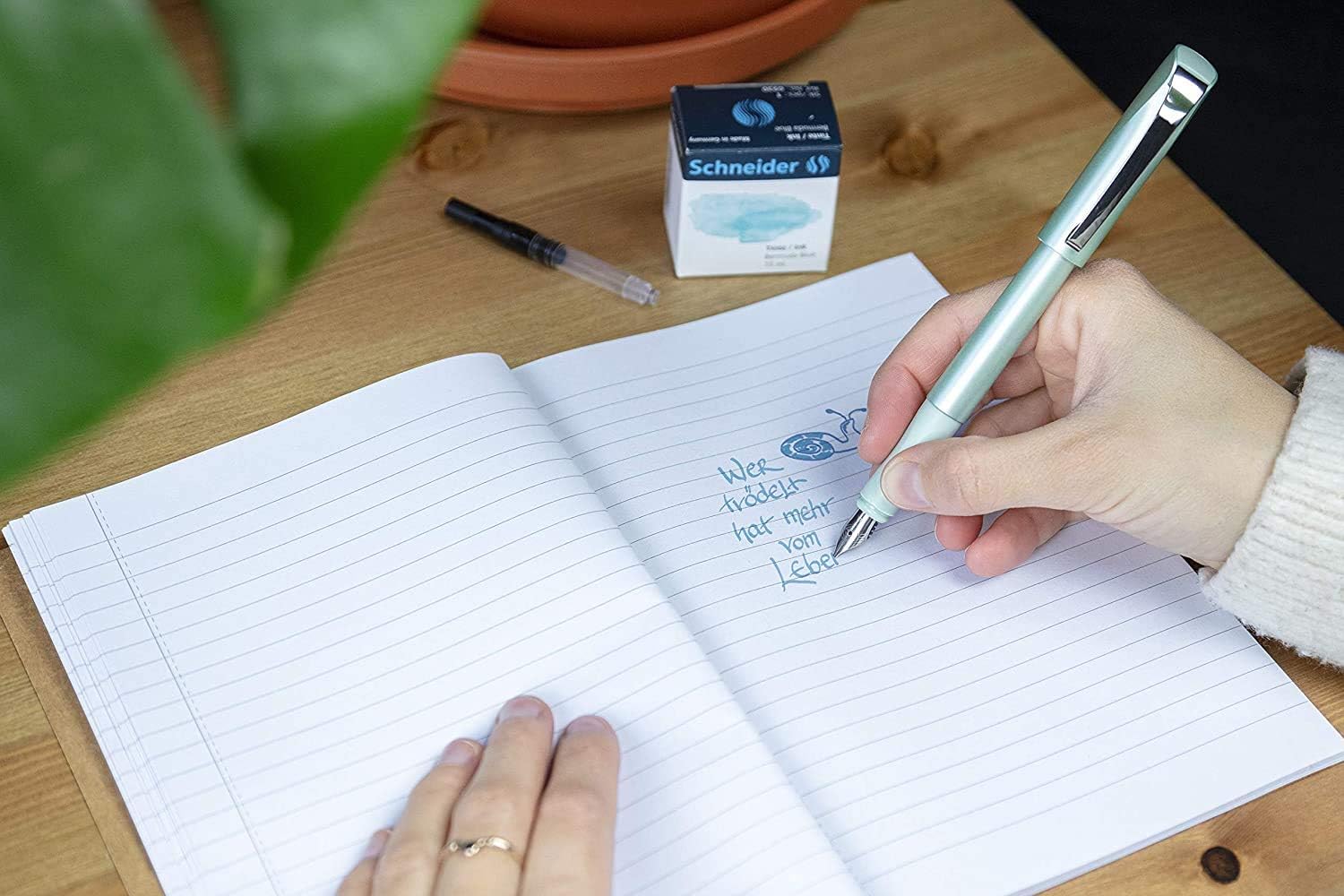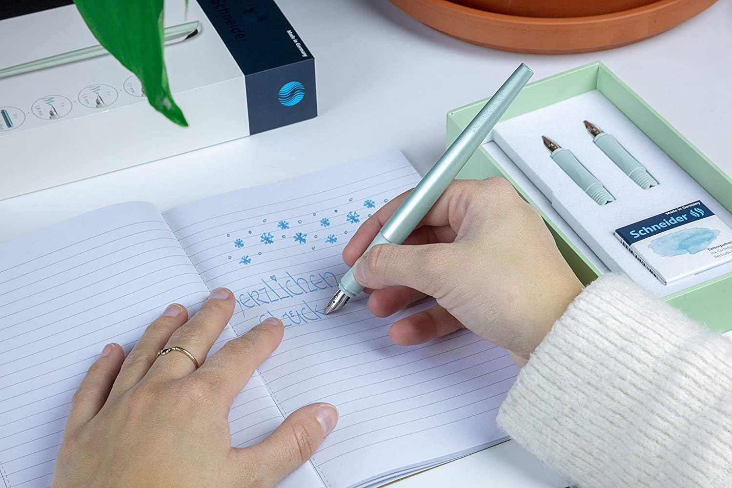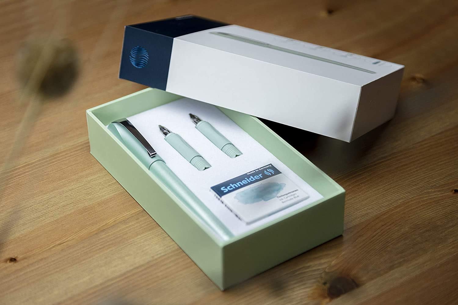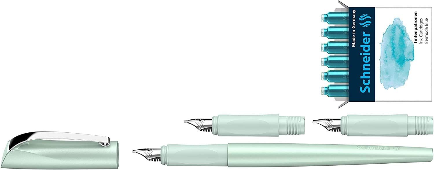 Con la penna stilografica Callissima avrai il meglio dalla tua scrittura a mano. L'inchiostro speciale color pastello offre nuove possibilità di progettazione, ad esempio per il vostro Bullet Journal Per teste creative che desiderano personalizzare la propria scrittura o stupire con la scrittura a mano calligrafica Il set regalo include una penna stilografica Callissima da 1,1 mm e due parti frontali (1,5 e 1,8 mm). Il manico lungo e l'impugnatura ergonomica sono comodi da tenere in mano La penna stilografica si adatta a tutte le cartucce standard. Inoltre può essere ricaricata tramite un convertitore e un contenitore di inchiostro ecologico Contenuto della confezione: set penna stilografica Schneider Callissima menta, pennino 1,1 mm, inserti frontali aggiuntivi da 1,5 mm e 1,8 mm, con 6 cartucce d'inchiostro: Bermuda Blue
