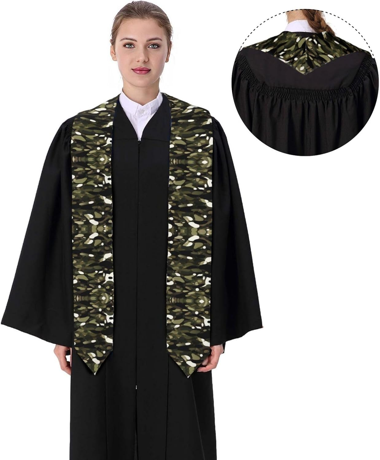 Questo nastro astratto per scialle di laurea mimetica è realizzato in raso colorato di alta qualità, leggero, ha un buon drappeggio, è lucido e non si deforma facilmente. Lo squisito design del motivo rende lo scialle molto adatto per abiti da laurea, senza scivolare. Questo è un importante regalo di laurea, che è molto adatto per parenti, figli, figlie, amici e sorelle. Design ad angolo acuto su entrambe le estremità, con una rottura nel mezzo