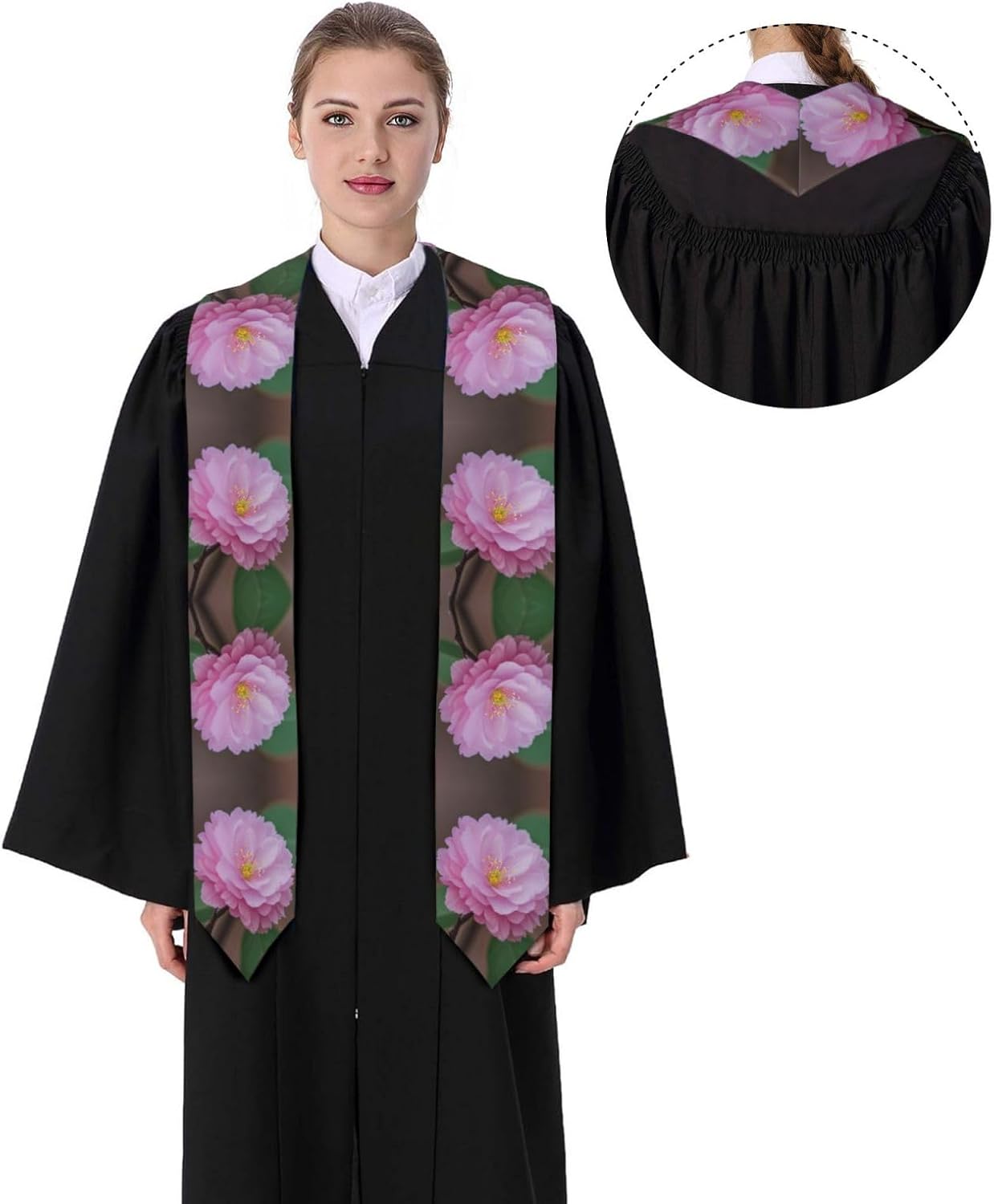 Questo nastro per scialle di laurea in fiore di mandorlo è realizzato in raso colorato di alta qualità, leggero, ha un buon drappeggio, è lucido e non si deforma facilmente. Lo squisito design del motivo rende lo scialle molto adatto per abiti da laurea, senza scivolare. Questo è un importante regalo di laurea, che è molto adatto per parenti, figli, figlie, amici e sorelle. Design ad angolo acuto su entrambe le estremità, con una rottura nel mezzo