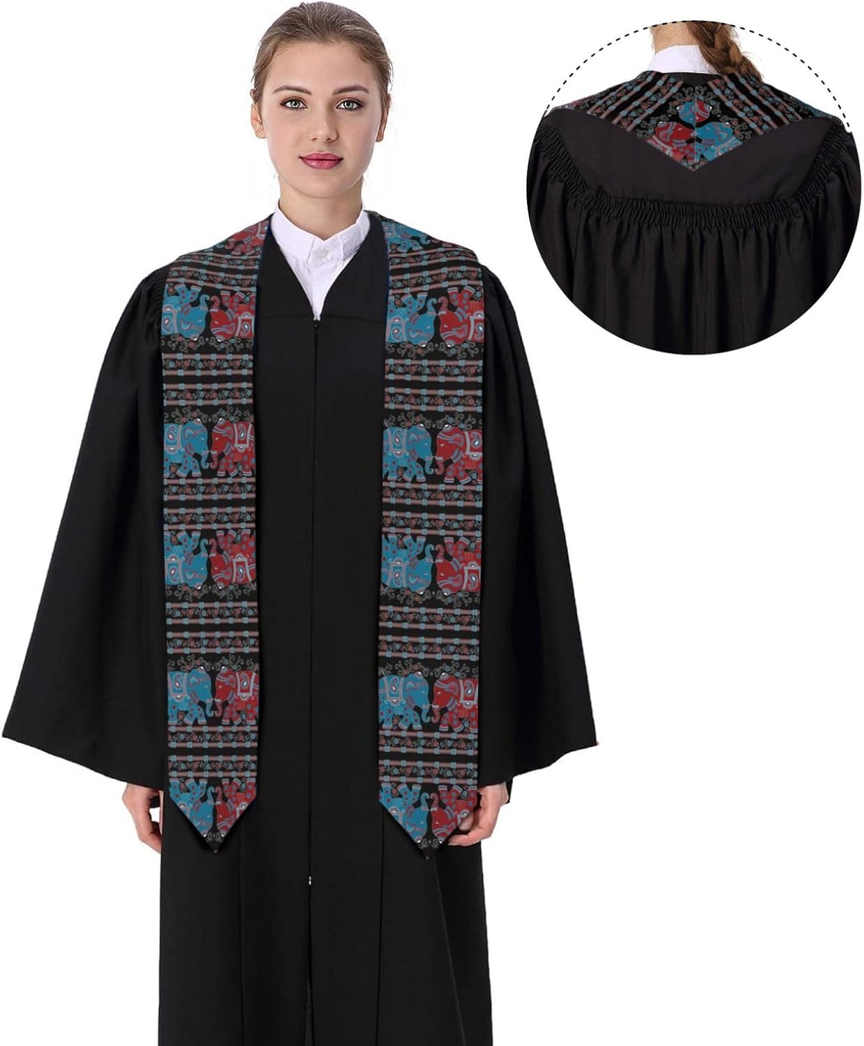 Questo nastro per scialle di laurea con elefante viola è realizzato in raso colorato di alta qualità, leggero, ha un buon drappeggio, è lucido e non si deforma facilmente. Lo squisito design del motivo rende lo scialle molto adatto per abiti da laurea, senza scivolare. Questo è un importante regalo di laurea, che è molto adatto per parenti, figli, figlie, amici e sorelle. Design ad angolo acuto su entrambe le estremità, con una rottura nel mezzo