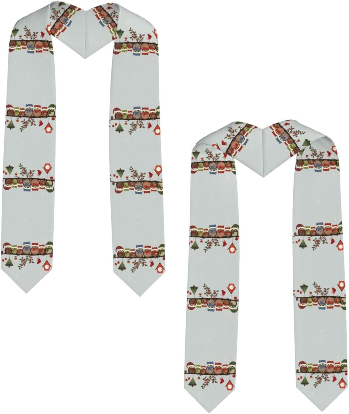Questo simpatico nastro per scialle di laurea con gufi natalizi sul ramo è realizzato in raso colorato di alta qualità, leggero, ha un buon drappeggio, è lucido e non si deforma facilmente. Lo squisito design del motivo rende lo scialle molto adatto per abiti da laurea, senza scivolare. Questo è un importante regalo di laurea, che è molto adatto per parenti, figli, figlie, amici e sorelle. Design ad angolo acuto su entrambe le estremità, con una rottura nel mezzo