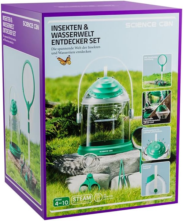 Descrizione del prodotto Kit per l'esplorazione del mondo acquatico e degli insetti. Come si comportano i pattinatori in acqua? E come si muove un insetto? Con il kit SCIENCE CAN Insect and Aquatic World Explorer, i piccoli ricercatori si immergono nell'affascinante mondo degli insetti a partire dai 4 anni. La stazione di osservazione consente di creare bruchi, scarafaggi, anatre d'acqua, ecc. da osservare in movimento o a casa. La stazione è composta da due stanze. La camera superiore è una camera di essiccazione e può essere facilmente rimossa. L'oblò nel coperchio permette ai bambini di fare osservazioni emozionanti anche al buio. La camera inferiore è impermeabile, perfetta per esplorare il mondo acquatico. La maniglia per il trasporto permette ai bambini di portarlo ovunque con te. Con l'attrezzatura di ricerca inclusa: guadino, cattura insetti, lente d'ingrandimento e pinzette, i bambini raccolgono piccoli insetti. Attraverso le ampie aperture gli animali vengono posizionati delicatamente nella stazione, dopo l'osservazione li rimuovono e li restituiscono alla natura – con i fori di ventilazione gli animali vengono riforniti d'aria in modo ottimale. I giocattoli scientifici SCIENCE CAN aiutano i bambini a scoprire ed esplorare il mondo in modo divertente. I nostri prodotti orientati al design si concentrano sulla trasmissione giocosa della conoscenza scientifica. Con i nostri prodotti i bambini si immergono nel micro e macrocosmo del nostro mondo. Ben pensati e sviluppati in modo non convenzionale, i giocattoli moderni sono autorevoli nella loro funzionalità e nel design rettilineo. La multifunzionalità di ogni prodotto ti mostra gli aspetti più svariati da scoprire, sempre con materiali di prima qualità. Scopri le meraviglie della natura. Come si comportano i pattinatori in acqua? E come si muove un insetto? Con il kit Science Can Insect and Aquatic World Exploration, i bambini dai 4 anni in su si immergono nell'affascinante mondo degli insetti. La stazione di osservazione consente di creare bruchi, scarafaggi, anatre d'acqua, ecc. da osservare in viaggio o a casa. La stazione è composta da due camere impilate una dentro l'altra. La camera superiore è una camera di essiccazione e può essere facilmente rimossa dalla parte inferiore. L'oblò nel coperchio permette ai bambini di fare osservazioni emozionanti anche al buio. La camera inferiore è impermeabile, perfetta per esplorare il mondo acquatico. Basta versare l'acqua fino al segno e il gioco è fatto. Lezioni di biologia in viaggio e a casa. Il kit contiene tutto ciò di cui i piccoli ricercatori hanno bisogno per iniziare il loro viaggio di scoperta. Con un guadino, un cattura insetti, una lente d'ingrandimento e una pinzetta raccolgono con cura piccoli insetti e animali acquatici in natura e poi li esaminano più da vicino nella stazione di osservazione. I numerosi fori di ventilazione in entrambe le camere garantiscono una circolazione dell'aria ottimale in modo che i piccoli animali si sentano a proprio agio e al sicuro durante le osservazioni. Oltre all'attrezzatura di ricerca inclusa, la stazione di osservazione è comoda anche per i viaggi grazie alla maniglia per il trasporto. In giardino, al parco o in gita nella natura, i bambini li portano ovunque con sé. E una volta terminate le osservazioni, rilasciano gli insetti e gli animali acquatici nel loro ambiente naturale. Sviluppa in modo divertente. Durante la ricerca e la scoperta, i bambini imparano a pensare come scienziati. Passo dopo passo, sono incoraggiati a pensare alla risoluzione dei problemi e a divertirsi esplorando ed esplorando l'affascinante mondo degli insetti e della vita acquatica. Materiali di alta qualità. La plastica resistente garantisce anni di gioco ed è particolarmente facile da pulire. Le diverse parti del kit esploratore si adattano particolarmente bene alle mani dei bambini. La manipolazione è un gioco da ragazzi, motivo per cui il kit offre l'attrezzatura perfetta per scoprire, esplorare e imparare. È quindi perfetto come regalo per ragazzi e ragazze dai 4 anni in su per compleanno, Pasqua o anche Natale. Kit di esplorazione da 5 pezzi con stazione di osservazione a 2 scomparti, guadino, lente d'ingrandimento, pinzetta, cattura insetti. Promuove il pensiero scientifico, la curiosità, l'immaginazione e suscita interesse per la biologia. Età: dai 4 ai 10 anni. Caratteristiche tecniche: Età consigliata: dai 4 ai 10 anni. Materiale: ABS. Richiede batterie: sì/non incluse. Batterie necessarie: 2 batterie AAA. Riferimento: 1601732022DE0001. Contenuto della confezione: kit per l'esplorazione del mondo acquatico e degli insetti. Kit per l'esplorazione del mondo acquatico e degli insetti. Come si comportano i pattinatori in acqua? E come si muove un insetto? Con il kit SCIENCE CAN Insect and Aquatic World Explorer, i piccoli ricercatori si immergono nell'affascinante mondo degli insetti a partire dai 4 anni. La stazione di osservazione consente di creare bruchi, scarafaggi, anatre d'acqua, ecc. da osservare in movimento o a casa. La stazione è composta da due stanze. La camera superiore è una camera di essiccazione e può essere facilmente rimossa. L'oblò nel coperchio permette ai bambini di fare osservazioni emozionanti anche al buio. La camera inferiore è impermeabile, perfetta per esplorare il mondo acquatico. La maniglia per il trasporto permette ai bambini di portarlo ovunque con te. Con l'attrezzatura di ricerca inclusa: guadino, cattura insetti, lente d'ingrandimento e pinzette, i bambini raccolgono piccoli insetti. Attraverso le ampie aperture gli animali vengono posizionati delicatamente nella stazione, dopo l'osservazione li rimuovono e li restituiscono alla natura – con i fori di ventilazione gli animali vengono riforniti d'aria in modo ottimale. I giocattoli scientifici SCIENCE CAN aiutano i bambini a scoprire ed esplorare il mondo in modo divertente. I nostri prodotti orientati al design si concentrano sulla t
