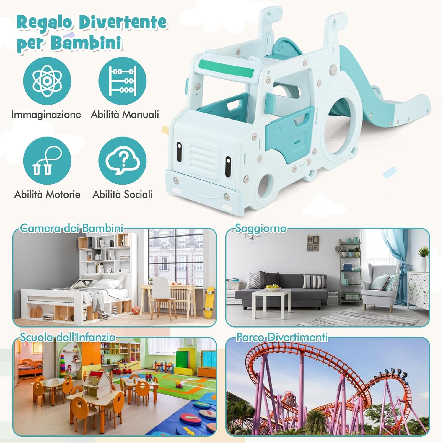 # Design multifunzionale 3 in 1 # Questo parco giochi multifunzionale per bambini comprende uno scivolo, una casetta a tema autobus e un tunnel per arrampicarsi, offrendo un divertimento senza fine ai bambini dai 18 mesi in su, promuovendo l'attività fisica e la coordinazione. Può ospitare fino a 3 bambini alla volta. # Casa a tema autobus per divertirsi alla guida # Questa casetta a tema autobus è progettata con un volante e un joystick simulati per offrire ai bambini un'esperienza di guida coinvolgente e realistica. Altre caratteristiche, come le porte apribili e i sedili spaziosi, offrono comfort e comodità ai piccoli piloti. # Caratteristiche di sicurezza avanzate # Questo set di arrampicata e scivolo per bambini è dotato di corrimano rialzati e zone di protezione per offrire un'esperienza di arrampicata e scivolo sicura, riducendo il rischio di cadute accidentali e fornendo un ambiente di gioco sicuro per i più piccoli. # Costruzione sicura e robusta # Questo scivolo per bambini a tema autobus è realizzato con materiali di alta qualità in PE e PP, resistenti e di facile manutenzione. Gli angoli arrotondati e lisci sono progettati per proteggere la pelle delicata dei bambini da lesioni accidentali. # Design pieghevole e salvaspazio # Lo scivolo indipendente può essere facilmente ripiegato per essere riposto e trasportato. Le dimensioni ripiegate sono 106 x 45,5 x 190 cm (L x P x A). Questo parco giochi multifunzionale è perfetto per il gioco in interni, come il soggiorno, la sala giochi, l'asilo, ecc.