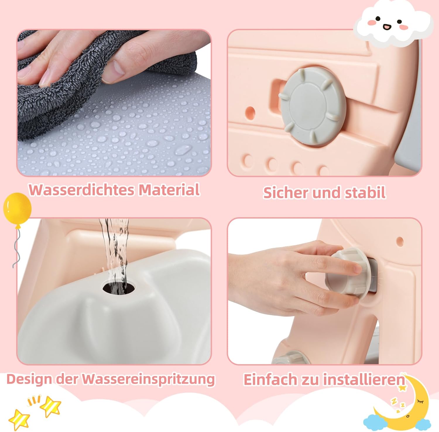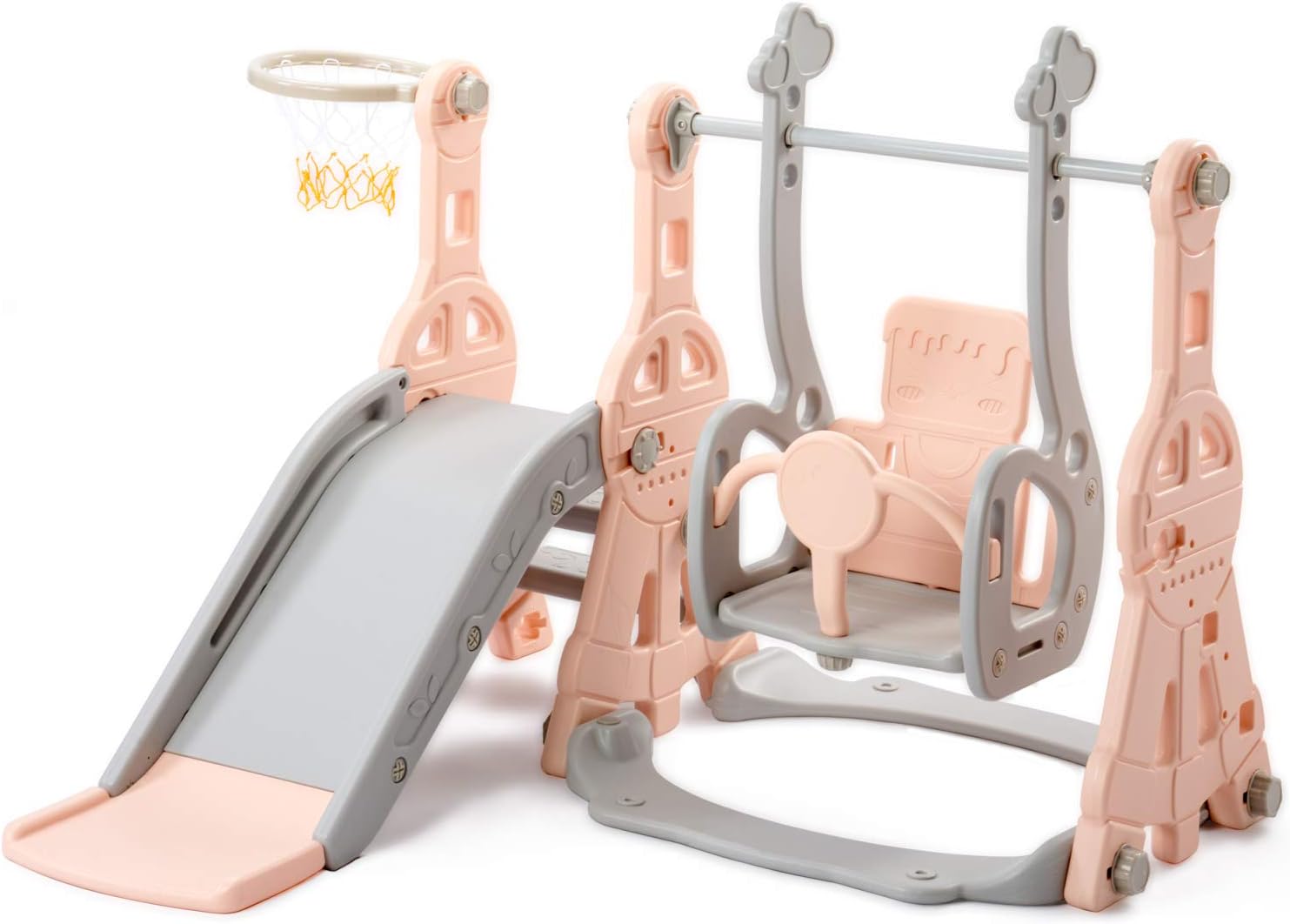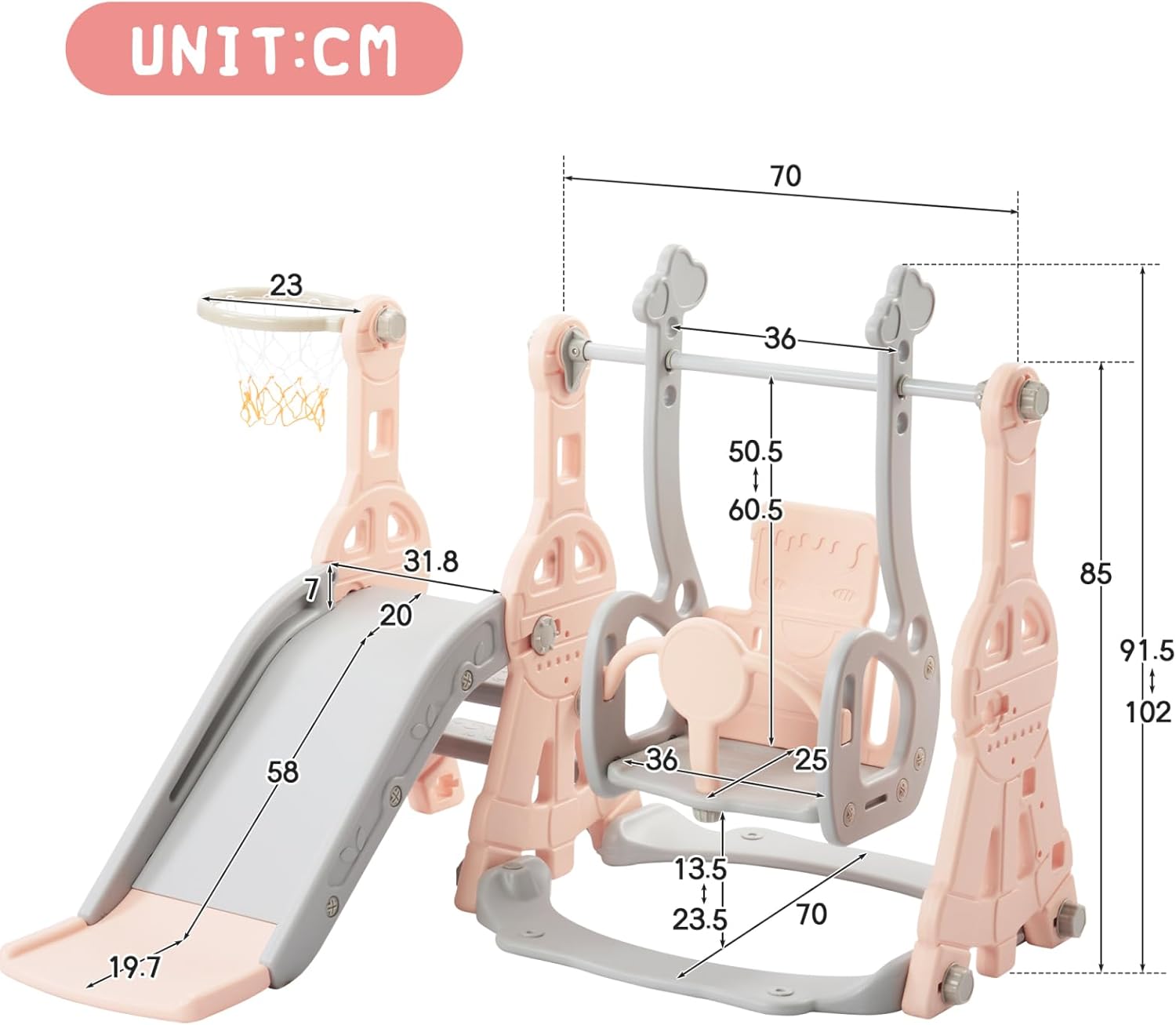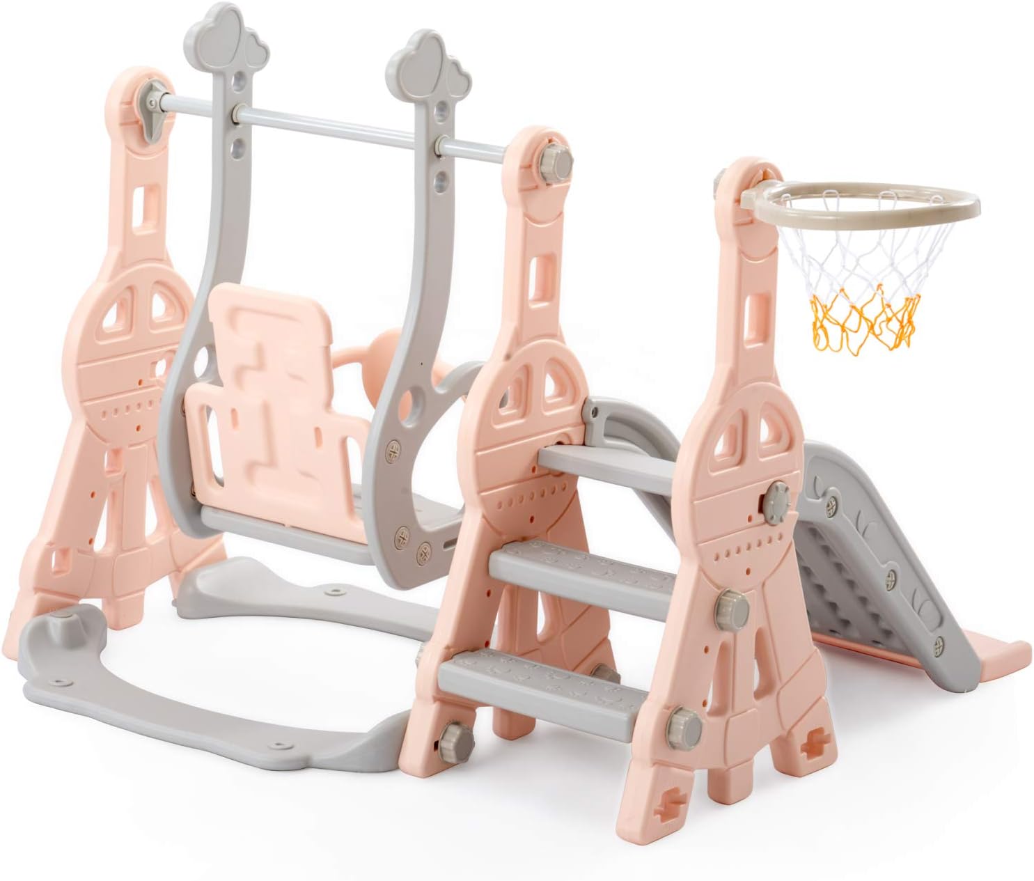 Molteplici possibilità di gioco, favoriscono la tua crescita: il dispositivo 4 in 1 con scivolo, scale, altalene e supporto da basket consente ai bambini di iniziare a fare sport a casa. Scivoli, scale, altalene e sfide di lancio: diverse scene allenano forza, equilibrio e coordinazione occhio-mano. Crescere giocosamente e rilasciare facilmente nuova energia. 【Protezione di sicurezza】La superficie della scala è rivestita a tre strati con texture antiscivolo, in modo che i bambini possano arrampicarsi in modo sicuro e antiscivolo. La parte inferiore dello scivolo è dotata di un design buffer che attutisce i fianchi e la colonna vertebrale, rendendo lo scivolamento più sicuro. L'altalena è dotata di una ringhiera di sicurezza a forma di T, che fissa saldamente il corpo e previene le cadute durante il gioco e lo scuotimento. Dai dettagli alla struttura, la sicurezza del tuo bambino è garantita in tutte le direzioni. Materiali di alta qualità, durevoli: utilizziamo polietilene ad alta densità (HDPE) secondo la norma EN71, inodore, robusto, durevole e giocabile. La superficie è liscia e senza sbavature, i bordi arrotondati e indolori. Anche durante la corsa, il salto e gli urti l'altalena è a prova di lesioni. Il fondo supporta l'iniezione d'acqua per aumentare il peso, aumentando la stabilità e rendendo il gioco più sicuro. Design ben progettato, regolazione flessibile: grazie alla pompa ad aria e al basket, si può iniziare immediatamente. Le istruzioni sono chiare e comprensibili e i dadi di plastica sono avvitati, in modo che l'altalena possa essere facilmente montata senza attrezzi. L'altezza del dondolo è regolabile in tre livelli e può essere regolata in modo flessibile in base alla crescita del bambino. I bambini di tutte le età possono divertirsi e un set può accompagnarli a lungo. Molteplici possibilità di utilizzo: il divertimento può iniziare in qualsiasi momento, sia in soggiorno che in giardino, l'altalena può essere facilmente integrata in diversi ambienti. Goditi il prato all'aperto nelle giornate di sole e gioca nel soggiorno nei giorni di pioggia. Affinché la felicità del bambino non sia limitata dal tempo e dall'ambiente, il parco giochi può essere cambiato in qualsiasi momento e un'infanzia divertente può iniziare in qualsiasi momento.