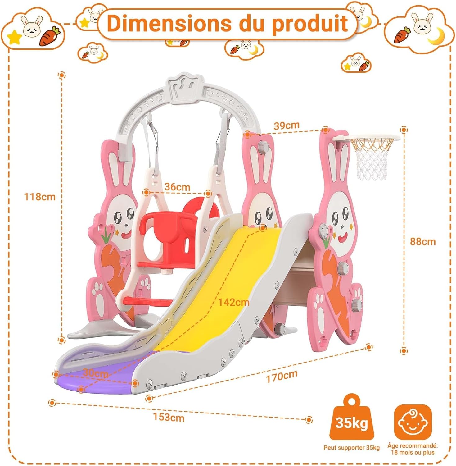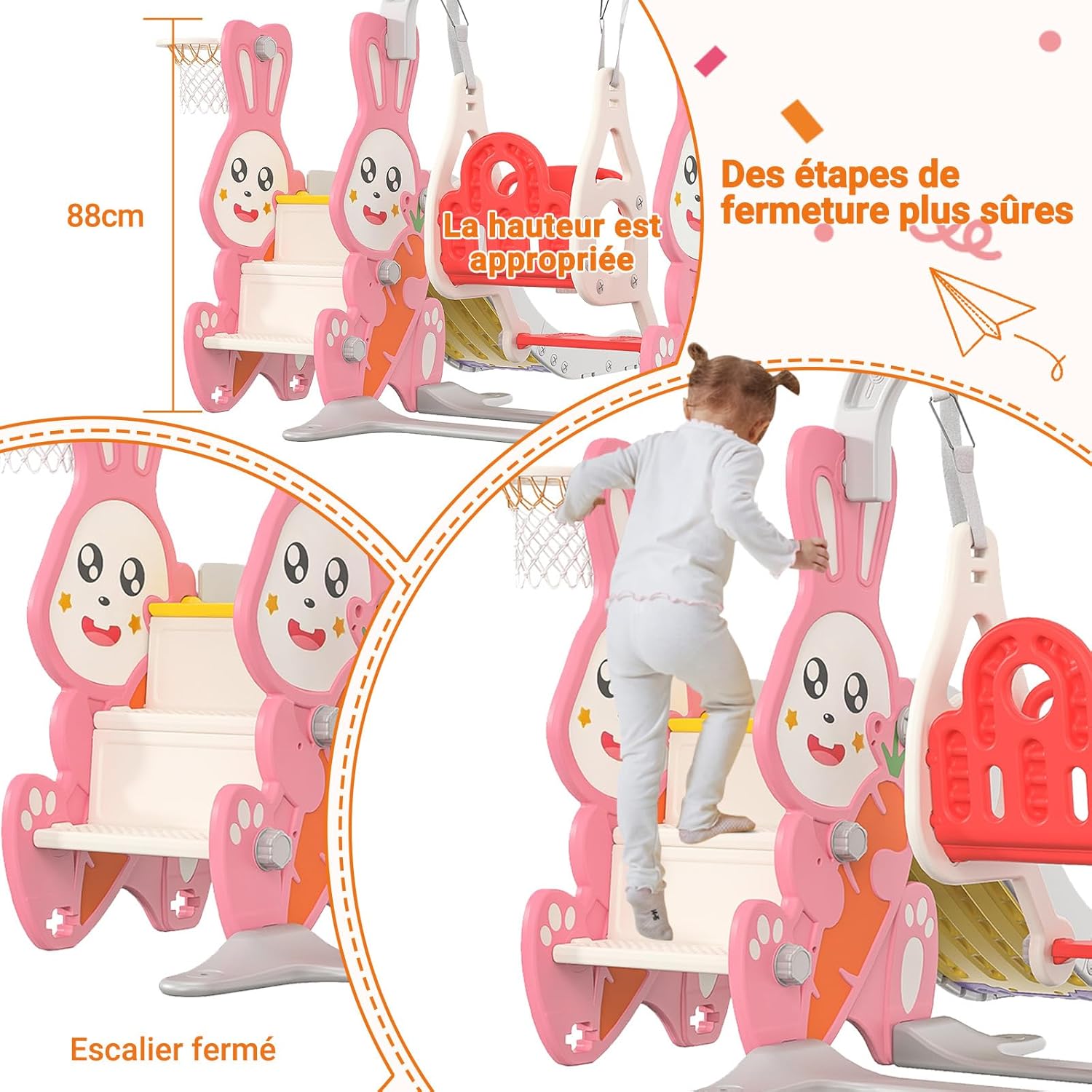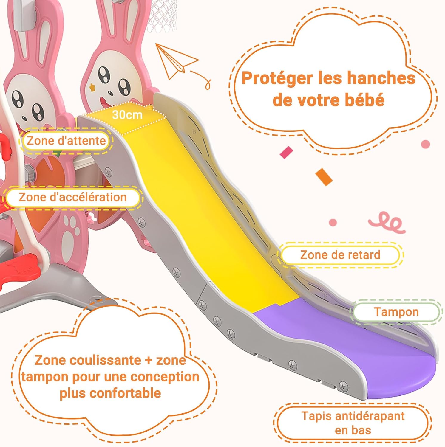 Design attraente e divertente per i bambini: questo scivolo per bambini combina una forma adorabile e colori vivaci per catturare l'attenzione dei piccoli. Perfetto per la cameretta dei bambini, sala giochi o giardino, stimola l'immaginazione e il divertimento. Il suo design leggero permette di spostarlo facilmente e installare uno spazio di gioco sicuro e divertente in qualsiasi stanza, per ore di risate. Materiali sicuri e durevoli: realizzato in plastica ultra resistente e non tossica, questo scivolo interno per bambini garantisce una sicurezza ottimale grazie ai suoi bordi arrotondati e al suo rivestimento liscio. Senza angoli acuti, protegge il tuo bambino da lesioni, creando un ambiente divertente e sicuro per un gioco quotidiano in tutta tranquillità. Sicurezza ottimale per un gioco senza graffi: questo scivolo esterno per bambini è dotato di gradini antiscivolo per una salita sicura, e lo scivolo gode di una superficie ammortizzante per una discesa morbida. Il bilanciere del bambino include un sistema di protezione T, che fornisce stabilità e sicurezza durante i giochi. Con il suo design spazioso, permette al bambino di giocare da solo o con gli amici in tutta tranquillità. Parco giochi multiuso 4 in 1: Questo parco giochi al coperto per bambini offre una combinazione unica di scivolo, altalena, scala e cestino da basket. Ideale per lo sviluppo delle capacità motorie e del coordinamento, promuove anche l'avventura e l'esplorazione. Questo scivolo per bambini e altalena è perfetto per mantenere il vostro bambino attivo mentre si diverte. Adatto per interni ed esterni: sia in sala giochi, giardino o cortile, questo scivolo esterno per bambini è facilmente montabile e smontabile. È ideale per uso interno in stanze dei bambini o asili nido ed è adatto anche all'aperto sul prato o in un parco. Questa è l'opzione ideale per compleanni o per occupare i piccoli in giornate di sole.