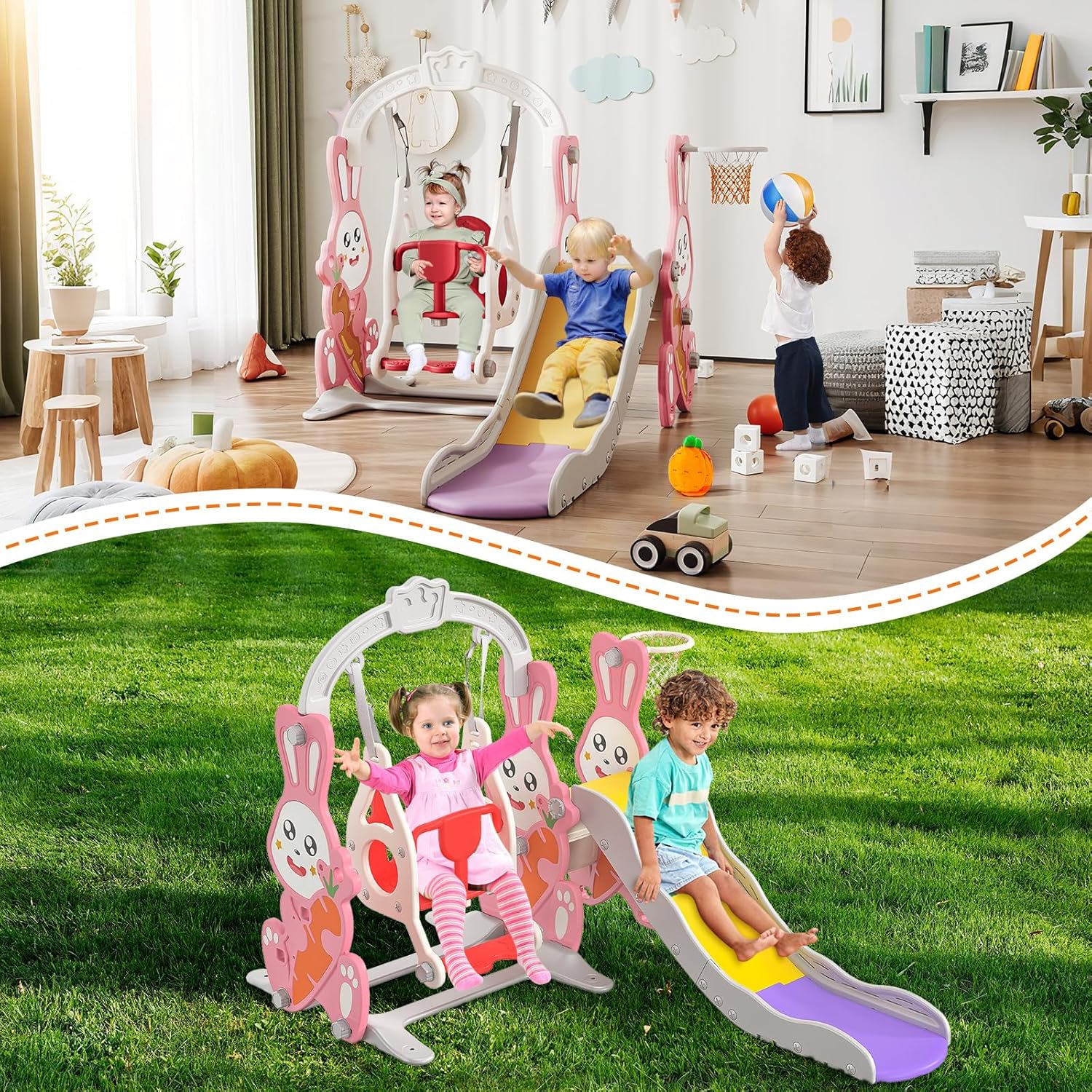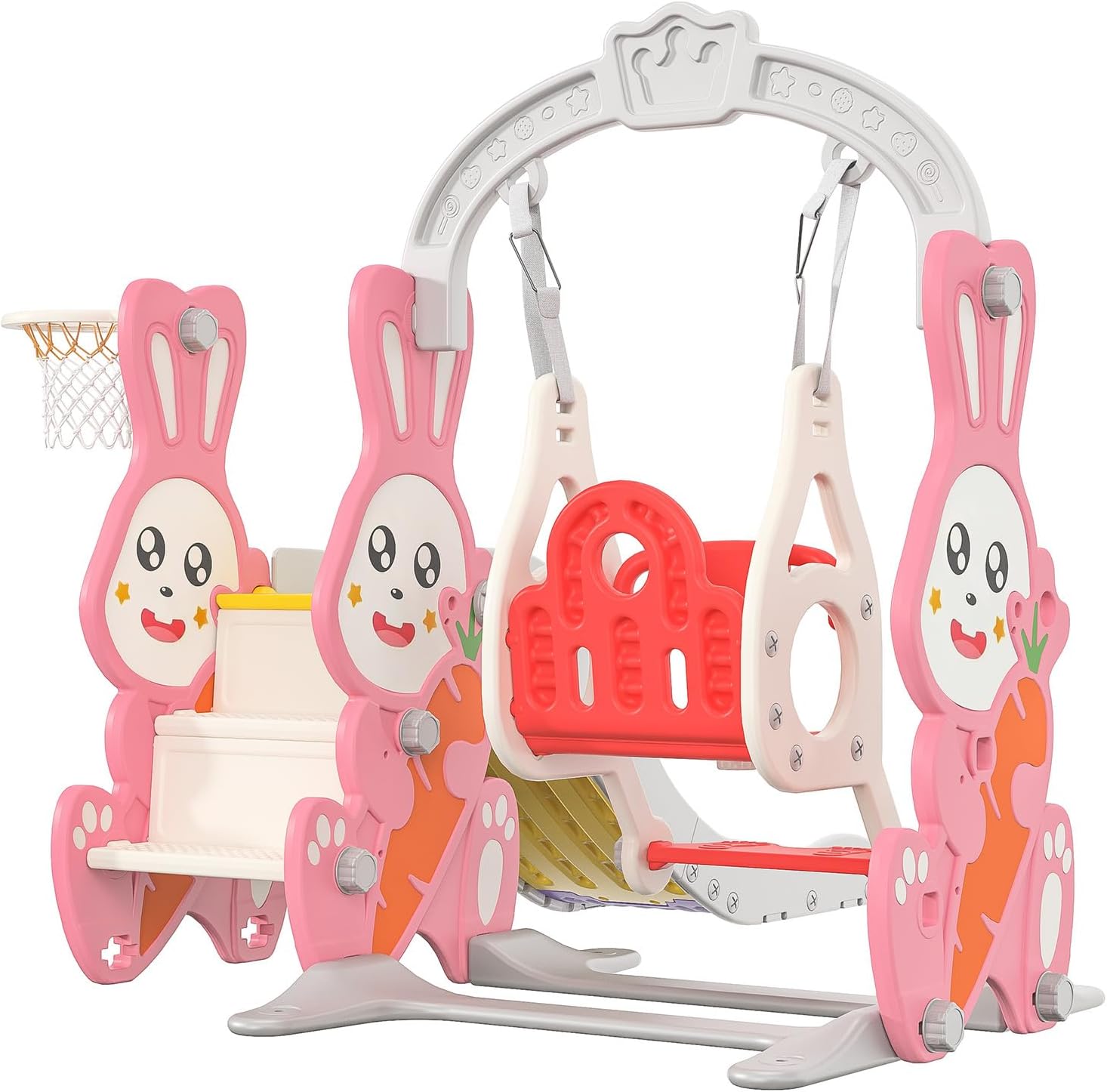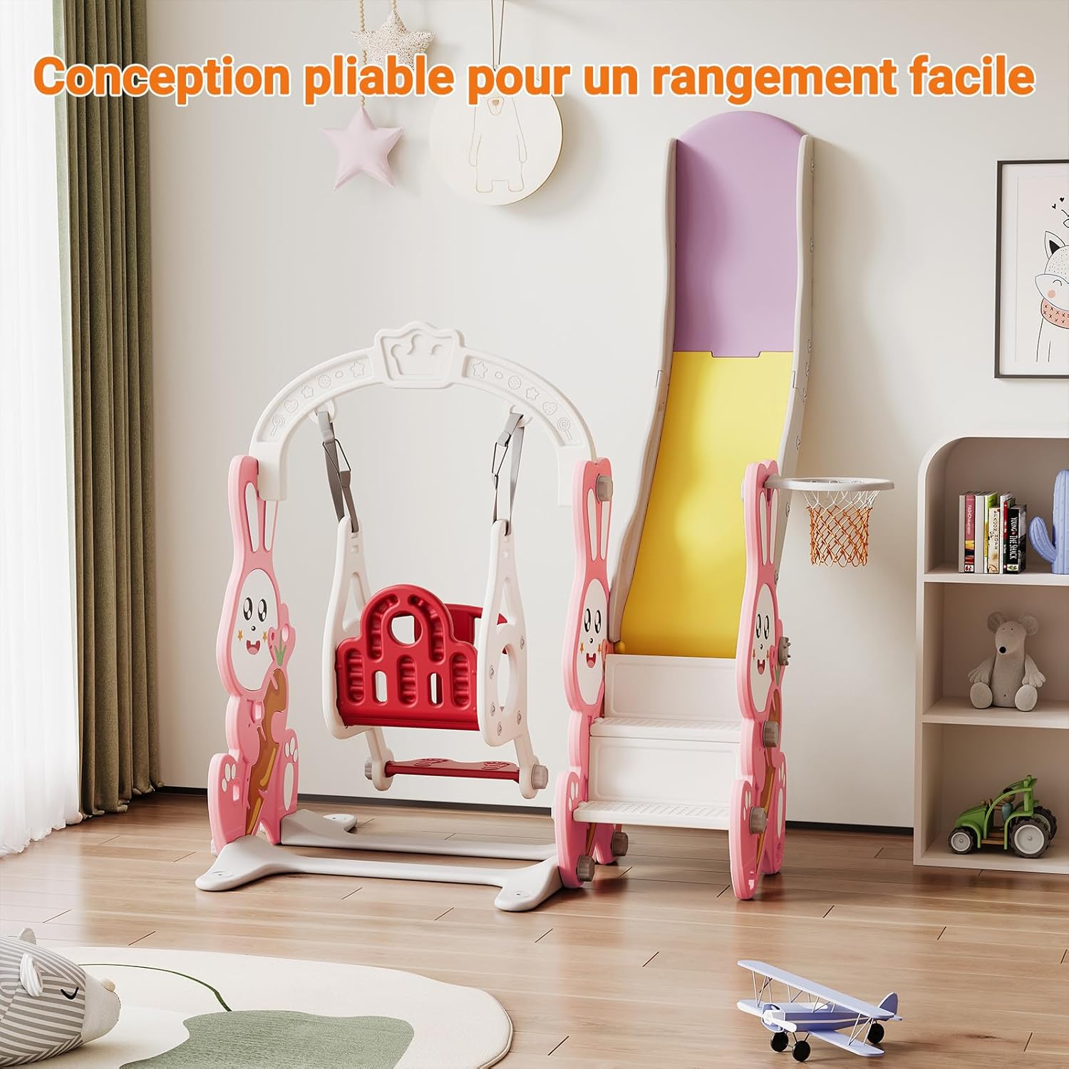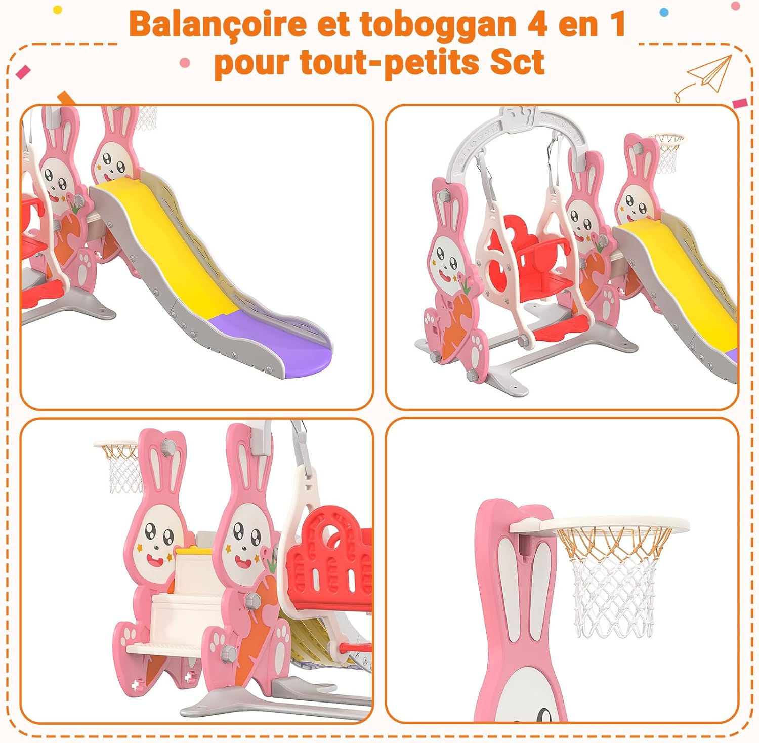 Design attraente e divertente per i bambini: questo scivolo per bambini combina una forma adorabile e colori vivaci per catturare l'attenzione dei piccoli. Perfetto per la cameretta dei bambini, sala giochi o giardino, stimola l'immaginazione e il divertimento. Il suo design leggero permette di spostarlo facilmente e installare uno spazio di gioco sicuro e divertente in qualsiasi stanza, per ore di risate. Materiali sicuri e durevoli: realizzato in plastica ultra resistente e non tossica, questo scivolo interno per bambini garantisce una sicurezza ottimale grazie ai suoi bordi arrotondati e al suo rivestimento liscio. Senza angoli acuti, protegge il tuo bambino da lesioni, creando un ambiente divertente e sicuro per un gioco quotidiano in tutta tranquillità. Sicurezza ottimale per un gioco senza graffi: questo scivolo esterno per bambini è dotato di gradini antiscivolo per una salita sicura, e lo scivolo gode di una superficie ammortizzante per una discesa morbida. Il bilanciere del bambino include un sistema di protezione T, che fornisce stabilità e sicurezza durante i giochi. Con il suo design spazioso, permette al bambino di giocare da solo o con gli amici in tutta tranquillità. Parco giochi multiuso 4 in 1: Questo parco giochi al coperto per bambini offre una combinazione unica di scivolo, altalena, scala e cestino da basket. Ideale per lo sviluppo delle capacità motorie e del coordinamento, promuove anche l'avventura e l'esplorazione. Questo scivolo per bambini e altalena è perfetto per mantenere il vostro bambino attivo mentre si diverte. Adatto per interni ed esterni: sia in sala giochi, giardino o cortile, questo scivolo esterno per bambini è facilmente montabile e smontabile. È ideale per uso interno in stanze dei bambini o asili nido ed è adatto anche all'aperto sul prato o in un parco. Questa è l'opzione ideale per compleanni o per occupare i piccoli in giornate di sole.