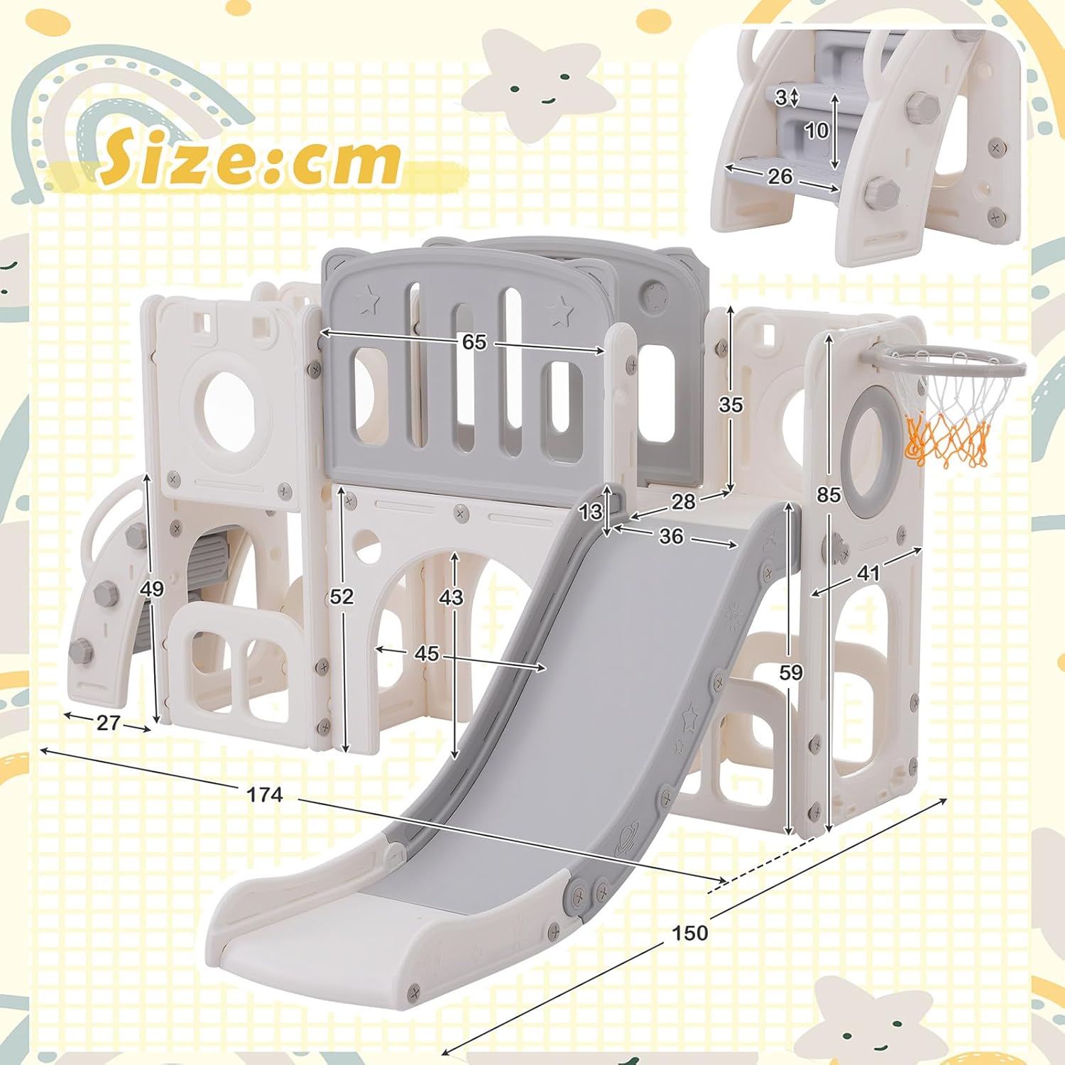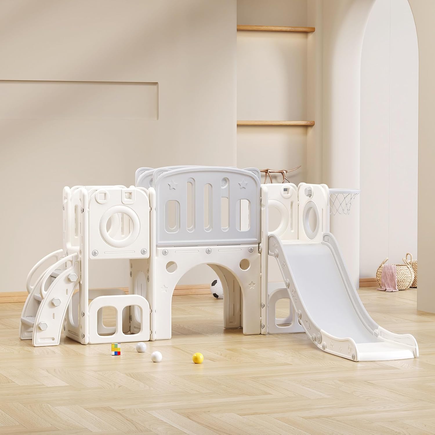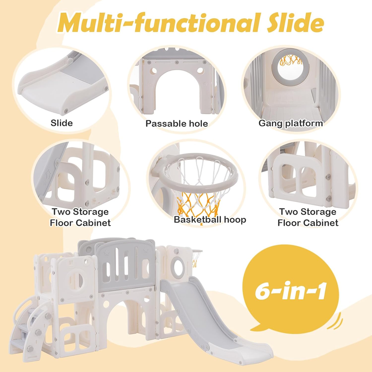 【Divertimento 6 in 1】Il nostro scivolo non offre solo divertimento scivoloso, ma anche un canestro da basket, una scala, due armadietti a pavimento per riporre gli oggetti e due piattaforme di accesso. Il gioco di perforazione integrato offre ulteriore varietà e sviluppo creativo. 【Design accattivante】Con il suo splendido design, il nostro scivolo conquisterà il cuore di tutti i bambini. Il design estetico lo rende il preferito in ogni cameretta. 【Design compatto】Il nostro design curato e compatto garantisce il massimo divertimento garantendo al contempo la sicurezza dei vostri bambini. Un'esperienza spensierata e gioiosa per i più piccoli. 【Struttura sicura】Questo scivolo per bambini è progettato con un'altezza adeguata per una facile salita. Corrimano sicuri e gradini antiscivolo garantiscono una maggiore sicurezza. 【Parco giochi al coperto】Il set di scivoli per bambini è facile da smontare e montare. Facile da spostare e trasportare, ampiamente utilizzato in soggiorni, camerette, sale giochi, asili, parchi giochi, ecc.