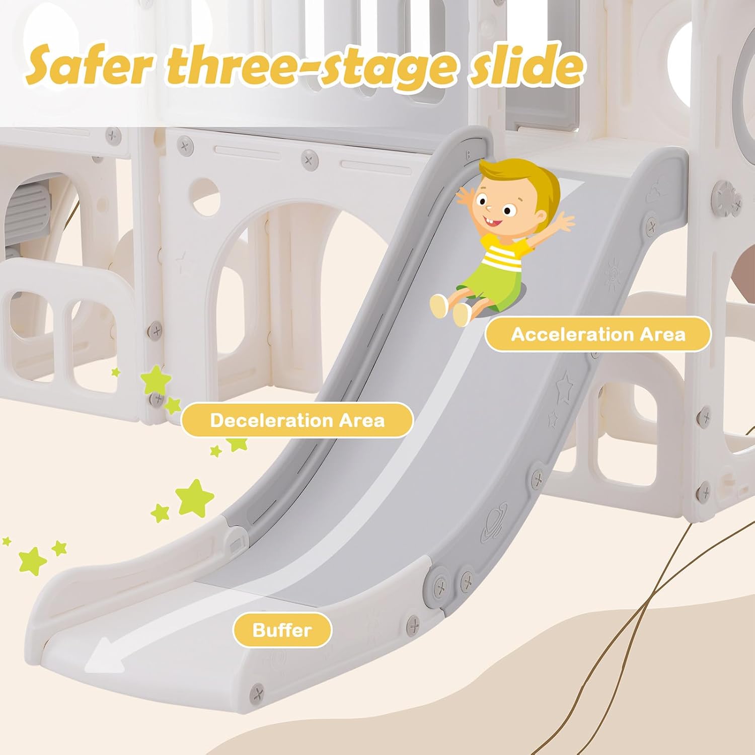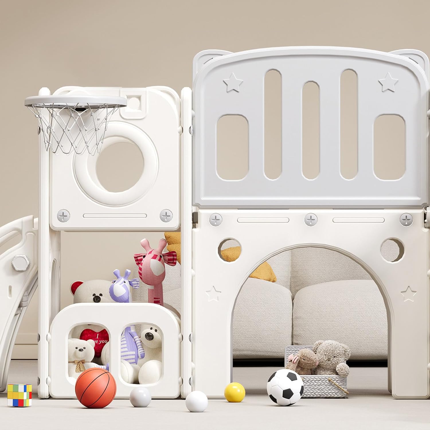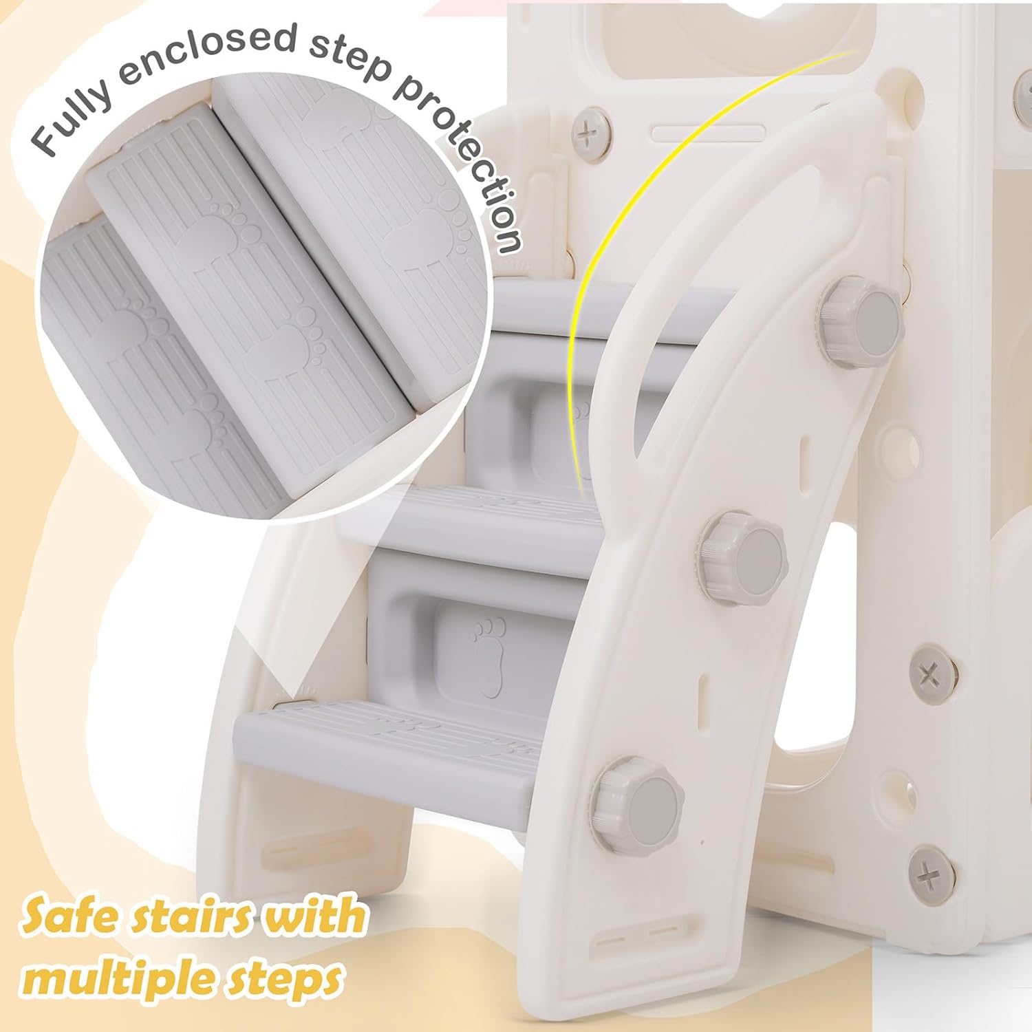 【Divertimento 6 in 1】Il nostro scivolo non offre solo divertimento scivoloso, ma anche un canestro da basket, una scala, due armadietti a pavimento per riporre gli oggetti e due piattaforme di accesso. Il gioco di perforazione integrato offre ulteriore varietà e sviluppo creativo. 【Design accattivante】Con il suo splendido design, il nostro scivolo conquisterà il cuore di tutti i bambini. Il design estetico lo rende il preferito in ogni cameretta. 【Design compatto】Il nostro design curato e compatto garantisce il massimo divertimento garantendo al contempo la sicurezza dei vostri bambini. Un'esperienza spensierata e gioiosa per i più piccoli. 【Struttura sicura】Questo scivolo per bambini è progettato con un'altezza adeguata per una facile salita. Corrimano sicuri e gradini antiscivolo garantiscono una maggiore sicurezza. 【Parco giochi al coperto】Il set di scivoli per bambini è facile da smontare e montare. Facile da spostare e trasportare, ampiamente utilizzato in soggiorni, camerette, sale giochi, asili, parchi giochi, ecc.