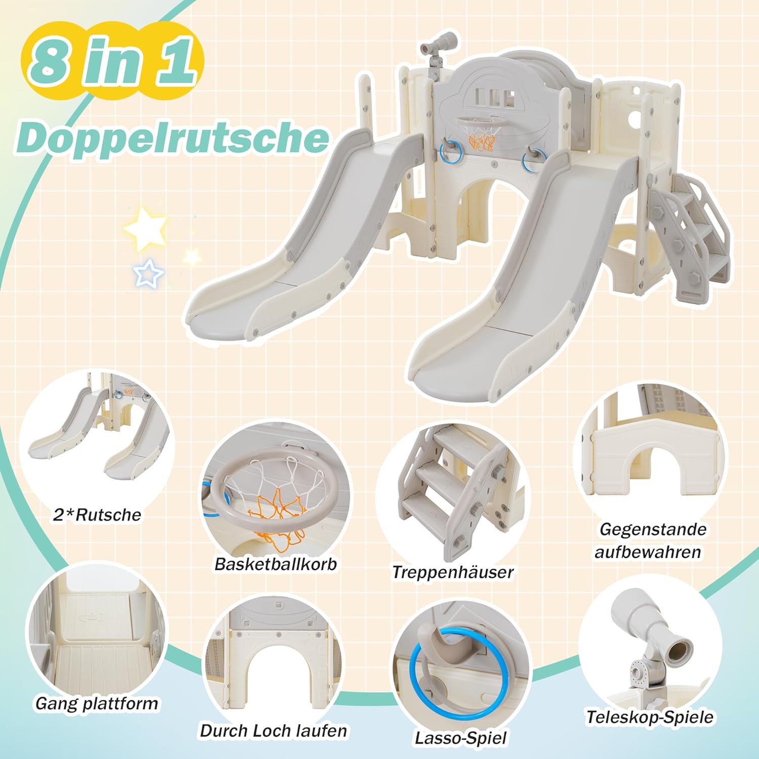 Sistema a doppio scivolo: due scivoli paralleli consentono a più bambini di giocare e divertirsi insieme. La combinazione di superficie antiscivolo e area di scarico sicura offre un'esperienza sicura e fluida per i piccoli avventurieri e garantisce un doppio piacere in giardino o nella cameretta dei bambini. Scala da arrampicata stabile: con la struttura integrata per arrampicata i bambini sviluppano equilibrio, forza e fiducia. L'ampia pedana e la trama antiscivolo offrono sicurezza ad ogni passo e invitano al gioco attivo. Ideale per stimolare lo sviluppo fisico e migliorare le capacità motorie. Piattaforma di gioco generosa: la piattaforma rialzata offre molto spazio per il gioco di ruolo creativo, l'osservazione e l'interazione. I bambini possono godere di una vista qui, scoprire i loro dintorni o prepararsi per gli scivoli. Perfetto per il gioco fantasioso e lo sviluppo sociale in gruppo o da solo. Canestro da basket integrato: favorisce la coordinazione occhio-mano e l'attività sportiva. I bambini possono lanciare la palla nell'anello migliorando le capacità motorie. Ideale per interni ed esterni, questa funzione garantisce ore di divertimento con movimento attivo e spirito di squadra. Telescopio per giochi di ruolo: il telescopio mobile offre divertimento agli esploratori e stimola l'immaginazione. I bambini giocano piccoli avventurieri che guardano in lontananza. Questo elemento supporta un comportamento di gioco fantasioso e incoraggia storie creative e comunicazioni durante il gioco insieme. Gioco di lancio giocoso al lazo: l'anello montato lateralmente favorisce la precisione della mira, la concentrazione e la destrezza. I bambini allenano giocosamente la loro coordinazione e allo stesso tempo si divertono in piccole gare di lancio. Una variegata aggiunta ai classici dispositivi di gioco. Apertura passante con carattere a tunnel: l'apertura al centro offre un'ulteriore possibilità di gioco: strisciare, nascondere o correre. Ideale per i bambini che amano esplorare. Stimola le capacità motorie, l'agilità e stimola idee di gioco creative e movimento.
