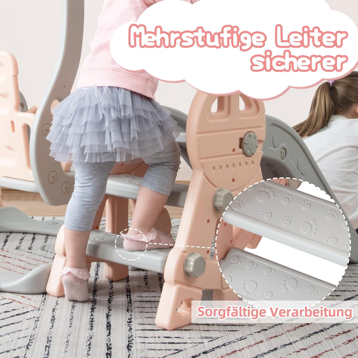 Set da gioco 4 in 1: dotato di altalena, scivolo per bambini, struttura da arrampicata e canestro da basket, questo versatile set per bambini rende ogni stanza un parco giochi emozionante destinato alle famiglie e agli spazi esterni domestici Sicuro e durevole per i bambini: questo scivolo per bambini è realizzato in materiale HDPE resistente. Il parco giochi per bambini può sostenere un peso di 100 libbre, in modo che i bambini possano scivolare in sicurezza. È sicuro e accompagna il tuo bambino fino a quando non è adulto. Design del pedale anti-skid: il pedale ha una struttura antiscivolo che aumenta l'attrito, esteticamente piacevole e può garantire la sicurezza dei bambini. L'estremità dello scivolo presenta una pendenza scivolosa extra lunga con un buffer che garantisce un'esperienza di scorrimento sicura e controllata Altalena sicura: funzione di regolazione dell'altezza dell'altalena per soddisfare le esigenze dei diversi bambini. Il sedile a dondolo include ringhiere di sicurezza, uno schienale di supporto e una base allargata che può essere riempita con acqua e sabbia per garantire un divertimento stabile Installazione semplice: tutte le parti sono collegate da dadi di plastica, gli utenti possono facilmente completare l'installazione senza attrezzi, il che aumenta la comodità d'uso. Adatto per uso interno ed esterno, scivolo in grado di soddisfare le esigenze delle diverse occasioni del gioco, e facile da pulire, basta pulire con un panno umido
