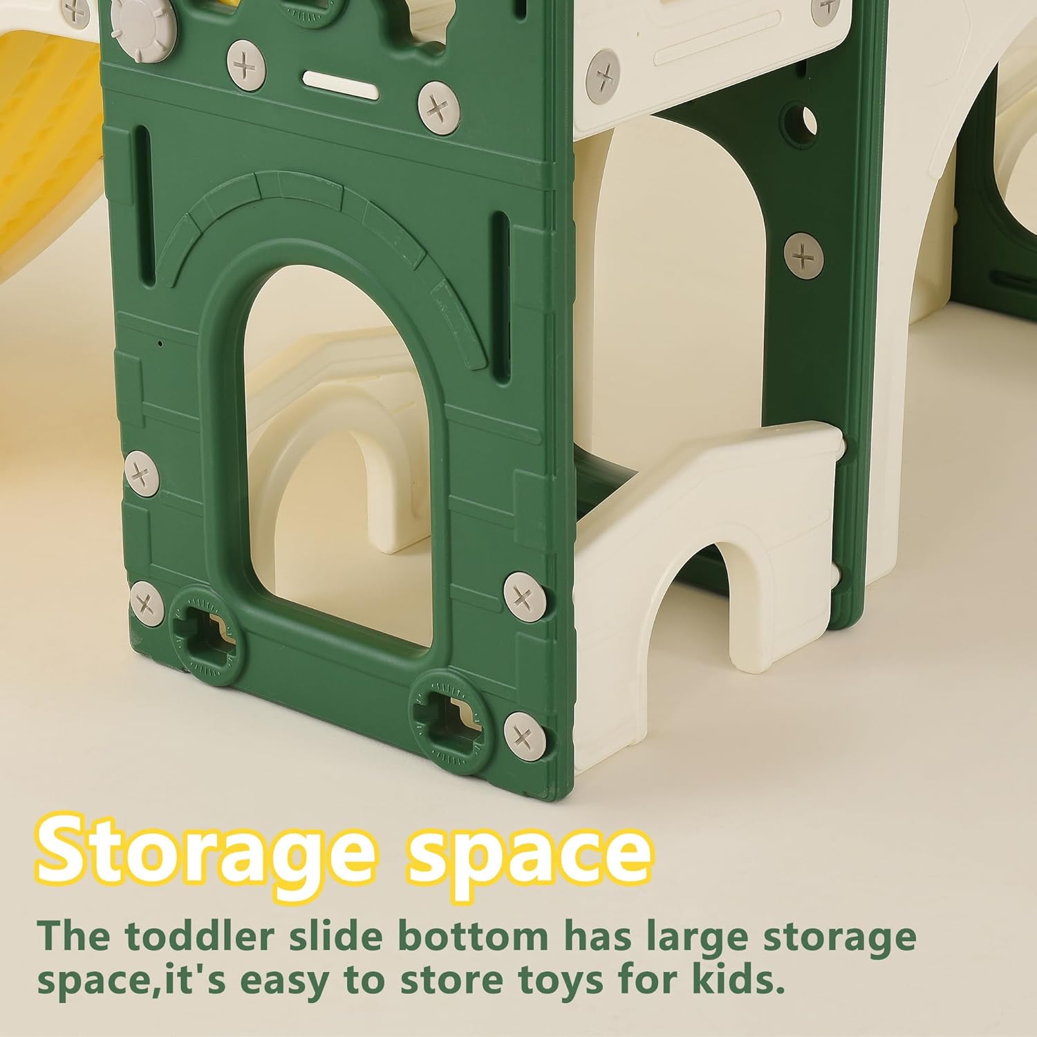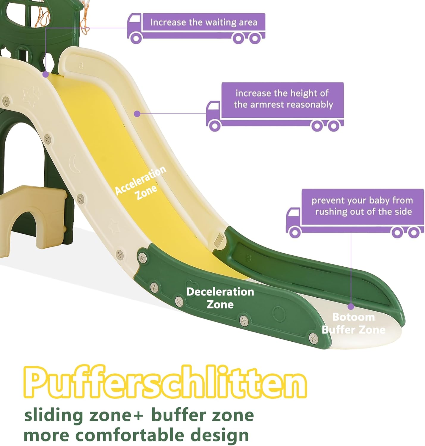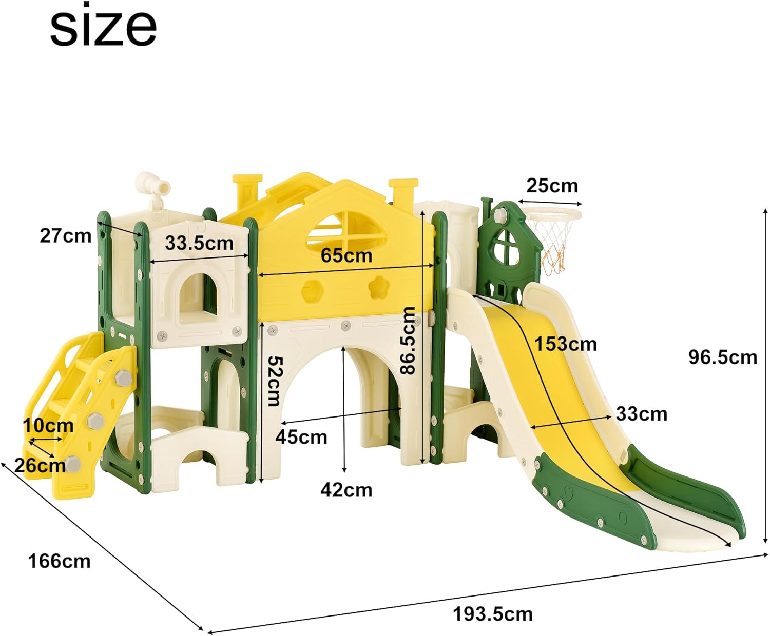 Parco giochi multifunzionale 7 in 1: questo scivolo esterno per bambini 7 in 1 è molto più di un semplice scivolo per bambini. Parco giochi all'aperto per bambini comprende un lungo scivolo sicuro, un cesto da basket, una cornice da arrampicata, un tunnel giocoso, una volta di gattonare, un comodo spazio di archiviazione e un telescopio giocattolo. Materiali durevoli ed ecologici: struttura giochi all'aperto per bambini Progettato in plastica di alta qualità ed ecologica, questo scivolo è stato costruito per durare nel tempo. La sua superficie liscia e resistente garantisce uno scivolamento sicuro e piacevole, pur essendo facile da pulire, per un divertimento di gioco duraturo per i bambini. Scivolo Allungato e Sicuro: il nostro scivolo ha una zona cuscinetto allungata nella parte inferiore, migliorando la sicurezza durante lo scivolamento. Le barre laterali rialzate su entrambi i lati assicurano che i bambini possano sperimentare la velocità e l'eccitazione in modo sicuro. Conservazione integrata e design compatto: oltre alle sue numerose funzioni giocose, questo scivolo per bambini è dotato di uno spazio di archiviazione integrato, perfetto per scivolare giocattoli o piccoli accessori. Il suo design compatto e modulabile si adatta facilmente a qualsiasi tipo di spazio. Una soluzione ideale per i genitori che desiderano combinare intrattenimento, praticità e sicurezza in un unico prodotto. Aria da gioco per bambini all'aperto e al coperto: facile da montare e da spostare, questo parco giochi per bambini è adatto sia per una camera da letto che per un giardino. Perfetto per una capanna scivolo per bambini all'aperto o una casetta per bambini all'aperto, è una soluzione ideale per creare un mini parco giochi nel vostro salotto o sul prato.