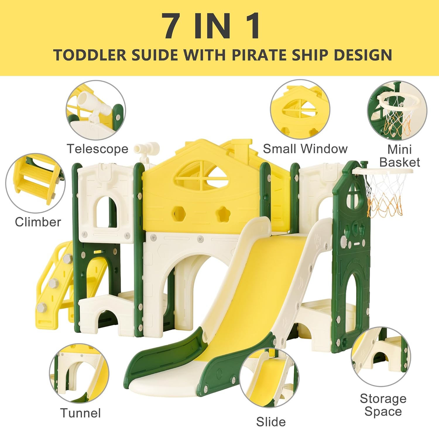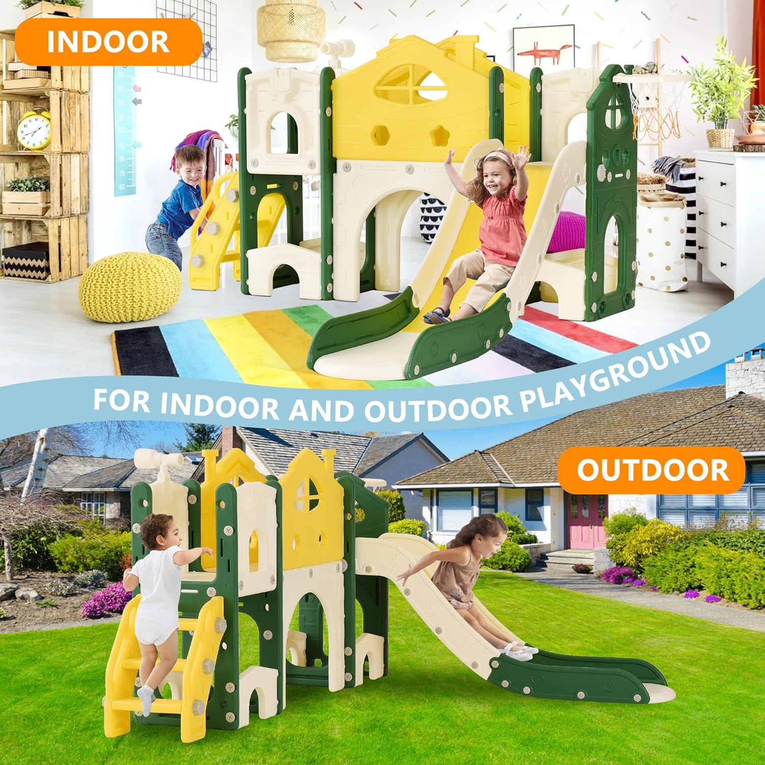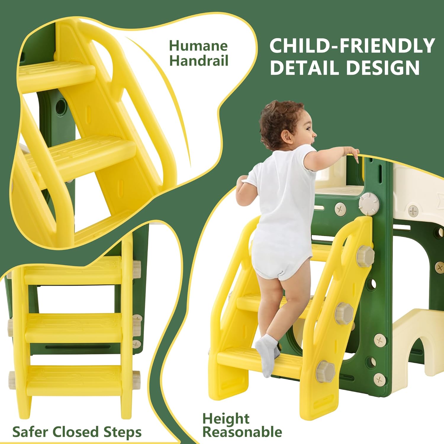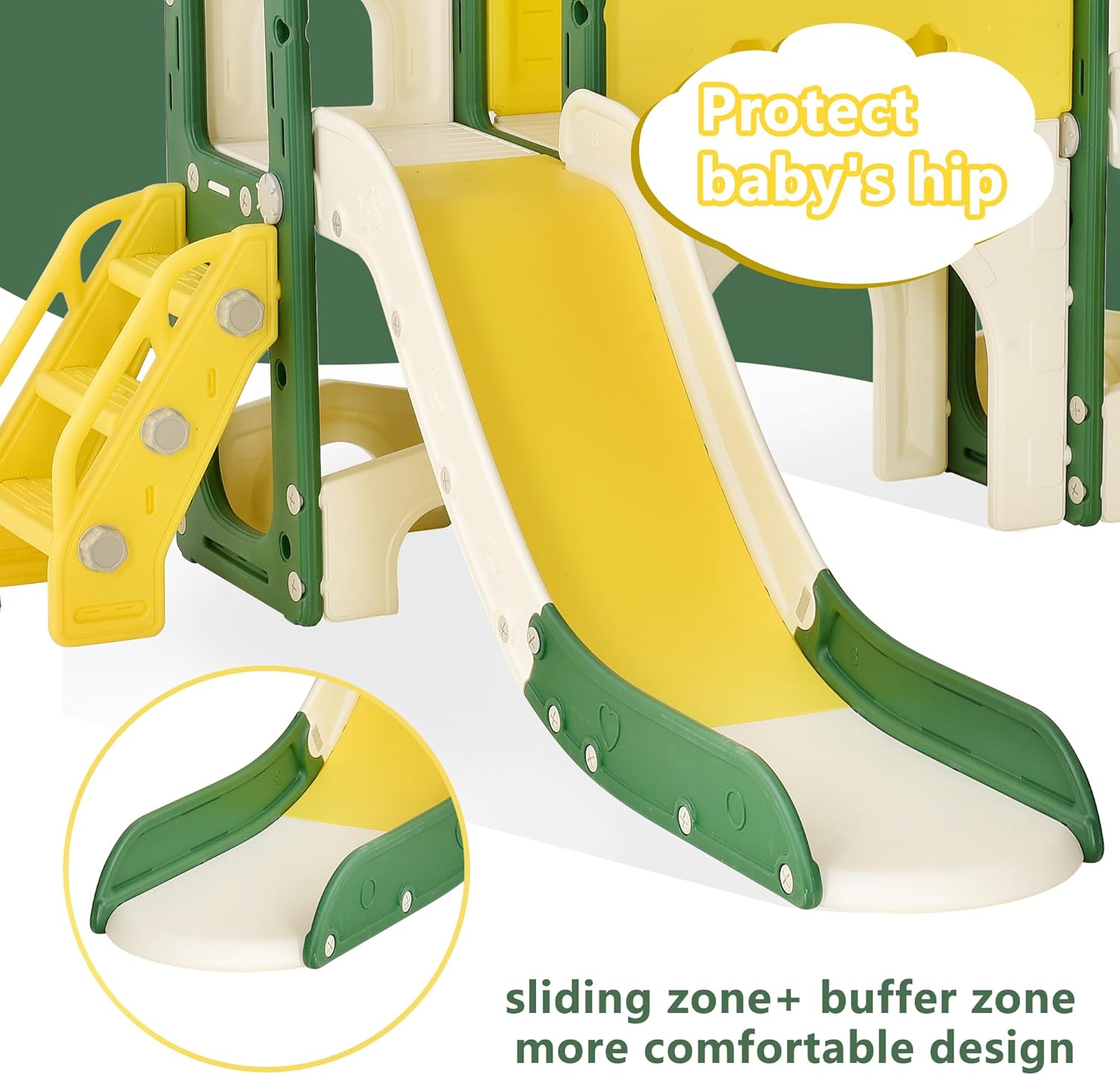 Parco giochi multifunzionale 7 in 1: questo scivolo esterno per bambini 7 in 1 è molto più di un semplice scivolo per bambini. Parco giochi all'aperto per bambini comprende un lungo scivolo sicuro, un cesto da basket, una cornice da arrampicata, un tunnel giocoso, una volta di gattonare, un comodo spazio di archiviazione e un telescopio giocattolo. Materiali durevoli ed ecologici: struttura giochi all'aperto per bambini Progettato in plastica di alta qualità ed ecologica, questo scivolo è stato costruito per durare nel tempo. La sua superficie liscia e resistente garantisce uno scivolamento sicuro e piacevole, pur essendo facile da pulire, per un divertimento di gioco duraturo per i bambini. Scivolo Allungato e Sicuro: il nostro scivolo ha una zona cuscinetto allungata nella parte inferiore, migliorando la sicurezza durante lo scivolamento. Le barre laterali rialzate su entrambi i lati assicurano che i bambini possano sperimentare la velocità e l'eccitazione in modo sicuro. Conservazione integrata e design compatto: oltre alle sue numerose funzioni giocose, questo scivolo per bambini è dotato di uno spazio di archiviazione integrato, perfetto per scivolare giocattoli o piccoli accessori. Il suo design compatto e modulabile si adatta facilmente a qualsiasi tipo di spazio. Una soluzione ideale per i genitori che desiderano combinare intrattenimento, praticità e sicurezza in un unico prodotto. Aria da gioco per bambini all'aperto e al coperto: facile da montare e da spostare, questo parco giochi per bambini è adatto sia per una camera da letto che per un giardino. Perfetto per una capanna scivolo per bambini all'aperto o una casetta per bambini all'aperto, è una soluzione ideale per creare un mini parco giochi nel vostro salotto o sul prato.