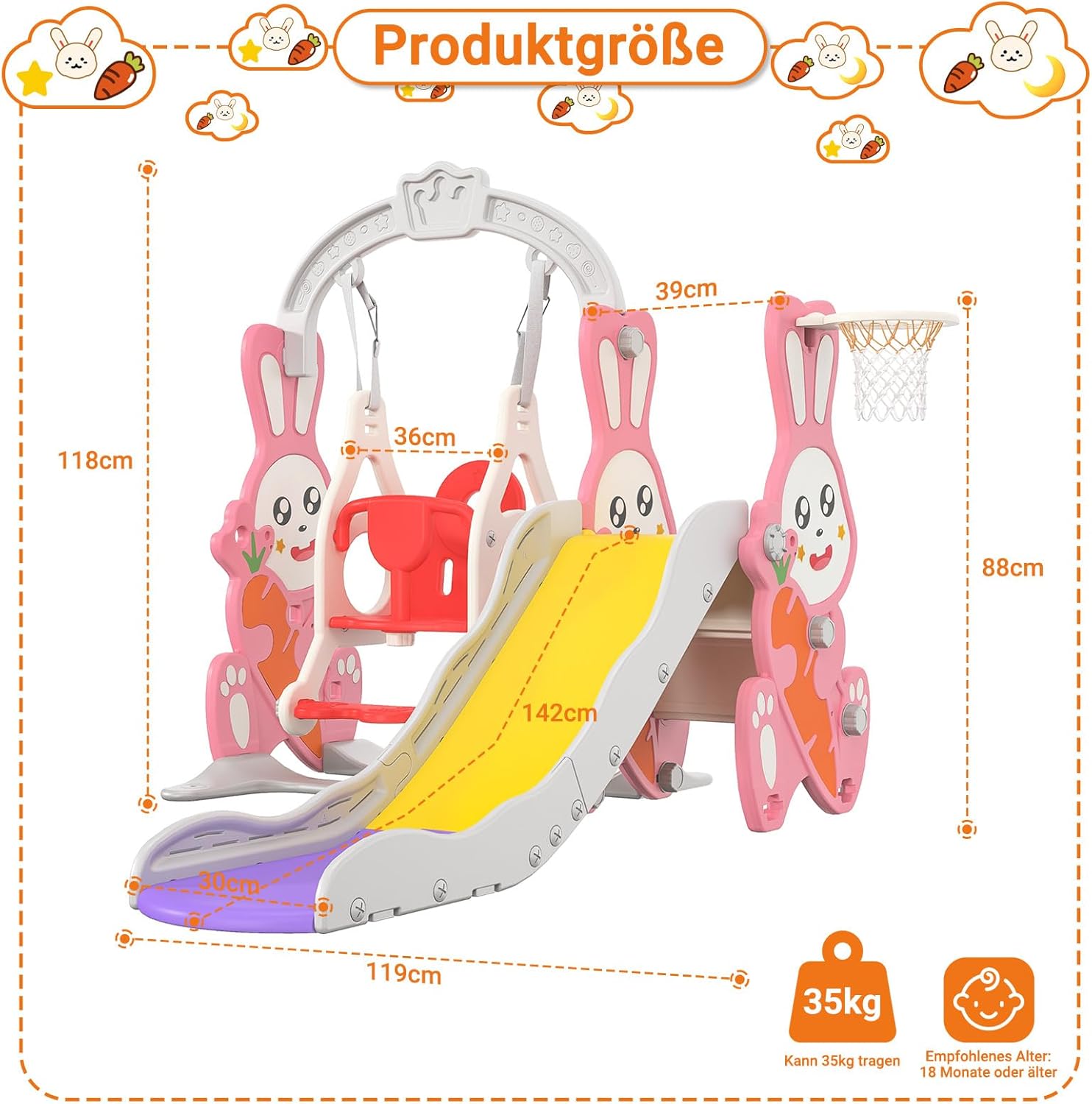 Materiale di alta qualità: realizzato in plastica spessa, ha una struttura stabile e una grande capacità di carico. Offri un'esperienza di gioco sicura per i tuoi bambini Giochi multifunzionali: il set 4 in 1 include una scala per arrampicarsi, un'altalena, uno scivolo e un cestino da basket. È perfetto per promuovere lo sviluppo fisico, cognitivo e sociale dei bambini in un ambiente divertente Scivolo e scala sicuri: la zona di ammortizzazione estesa e le ringhiere laterali rialzate assicurano che i piccoli avventurieri possano scivolare in sicurezza. La scala è progettata con texture antiscivolo, che facilita l'arrampicata e impedisce ai bambini di scivolare, garantendo così la sicurezza Design bello e pratico: questo scivolo per bambini ha un aspetto infantile e colori vivaci che lo rendono attraente. Può anche fornire un'esperienza di gioco sicura e divertente. È un regalo ideale per i bambini per giocare con tranquillità Facile da montare: tutte le parti di questo parco giochi multifunzionale possono essere collegate con dadi di plastica. La confezione contiene strumenti completi e istruzioni di montaggio dettagliate per facilitare il montaggio e lo smontaggio