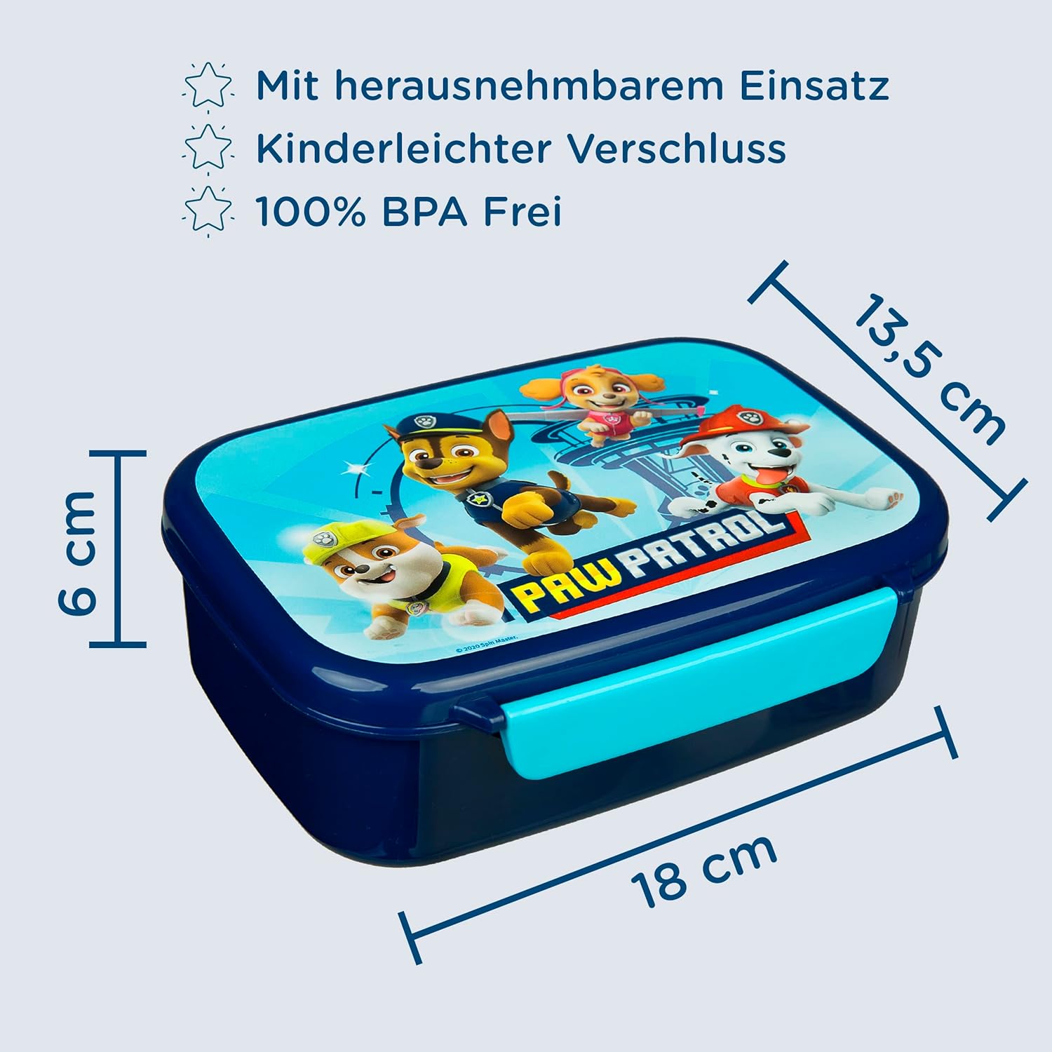 Paw Patrol Contenitore per il pranzo per bambini – sul contenitore per il pranzo si trovano gli aiutanti su quattro zampe di Paw Patrol. I bambini usano la scatola come contenitore per il pane al burro, contenitore per il pranzo, contenitore per il pranzo per l'asilo, contenitore per il pranzo o per la scuola. Ideale per diversi componenti: grazie alla suddivisione rimovibile è possibile imballare facilmente diversi componenti e trasportarli facilmente. Dimensioni: circa 18 x 13,5 x 6 cm Semplice chiusura a scatto – Il coperchio del contenitore Paw Patrol è facilmente rimovibile grazie alla chiusura a scatto su entrambi i lati. Attenzione: non adatto al microonde e alla lavastoviglie Ottima idea regalo per ragazzi e ragazze. Il contenitore per il pranzo Scooli per bambini è perfetto come regalo per compleanno, Pasqua, Natale, per la scuola o come piccolo regalo. Qualità top Scooli – ci affidiamo a materiali resistenti e testati in modo indipendente e caratteristiche studiate per la durata e la sicurezza dei nostri prodotti nella vita colorata della famiglia. Si prega di conservare questo indirizzo per un uso futuro. Si prega di pulire accuratamente con acqua tiepida e detersivo prima del primo utilizzo. Non adatto al forno a microonde e alla lavastoviglie.
