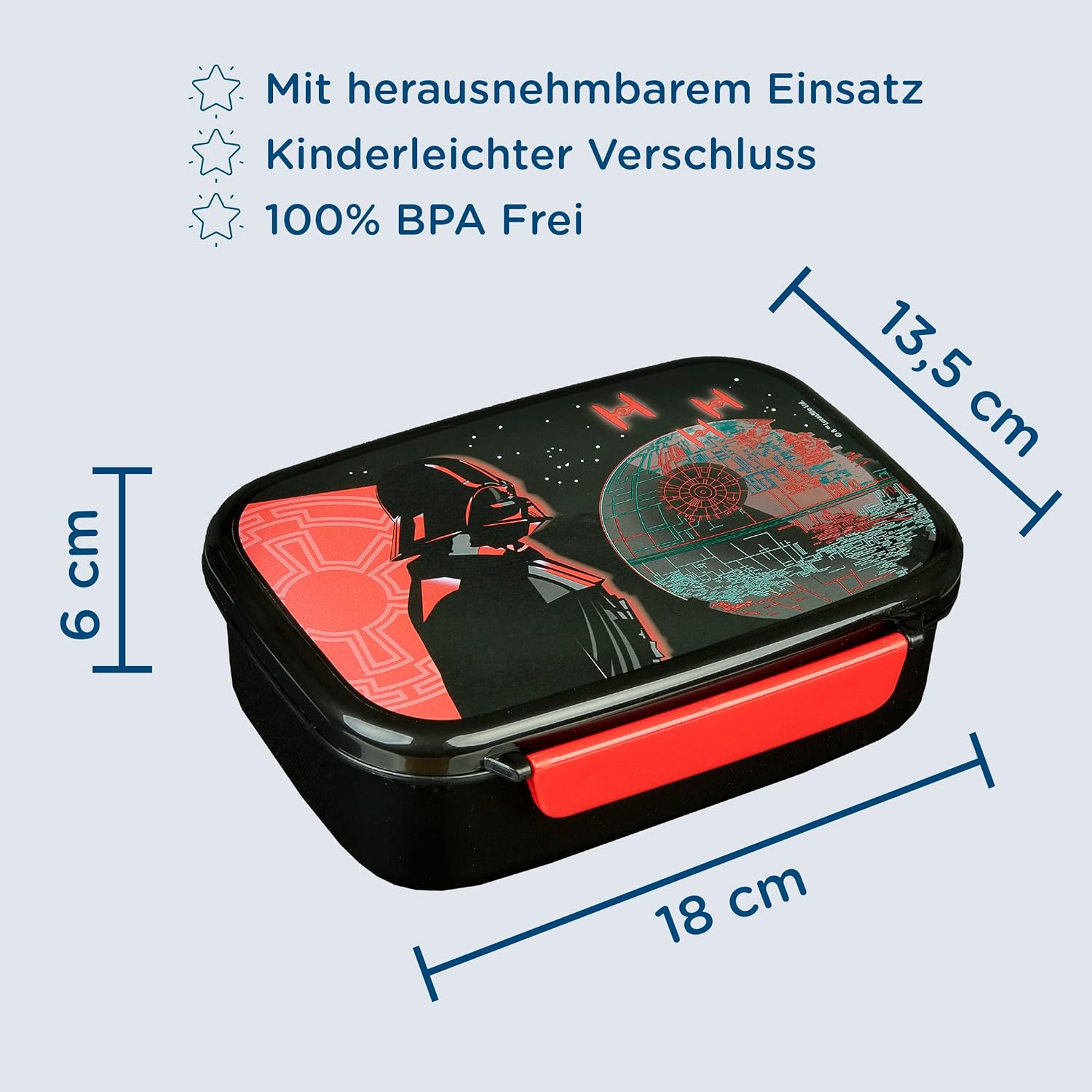 Star Wars Contenitore per il pranzo per bambini – Prodotto originale con licenza della saga spaziale "Guerra delle stelle" con motivo Darth Vader. I bambini usano la scatola come contenitore per il pane al burro, contenitore per il pranzo, contenitore per il pranzo per l'asilo, contenitore per il pranzo o per la scuola. Ideale per diversi componenti: grazie alla suddivisione rimovibile è possibile imballare facilmente diversi componenti e trasportarli facilmente. Dimensioni: circa 18 x 13,5 x 6 cm Semplice chiusura a scatto – Il coperchio del contenitore per il pranzo Star Wars è facilmente rimovibile grazie alla chiusura a scatto su entrambi i lati. Attenzione: non adatto al microonde e alla lavastoviglie Ottima idea regalo per ragazzi e ragazze. Il contenitore per il pranzo Scooli per bambini è perfetto come regalo per compleanno, Pasqua, Natale, per la scuola o come piccolo regalo. Qualità top Scooli – ci affidiamo a materiali resistenti e testati in modo indipendente e caratteristiche studiate per la durata e la sicurezza dei nostri prodotti nella vita colorata della famiglia.