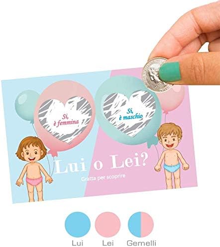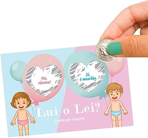 10 scratch card per rivelare il sesso del futuro nascituro Gratta il cuore e scopri se sarà un maschietto o una femminuccia Simpatico gioco che tutti i tuoi invitati adoreranno Realizzati in cartoncino spesso da 200g/m2 pretagliato Modello: Balloon - Dimensioni: 8 x 12 cm