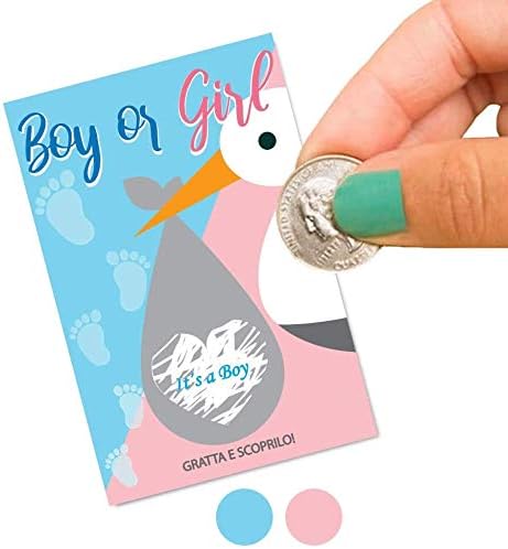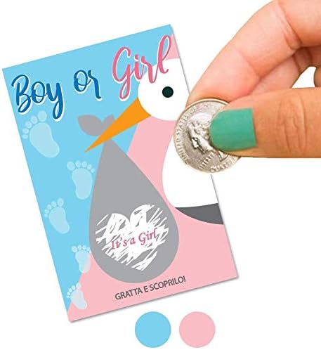 10 scratch card per rivelare il sesso del futuro nascituro Gratta il cuore e scopri se sarà un maschietto o una femminuccia Simpatico gioco che tutti i tuoi invitati adoreranno Realizzati in cartoncino spesso da 200g/m2 pretagliato Modello: Cicogna - Dimensioni: 8 x 12 cm