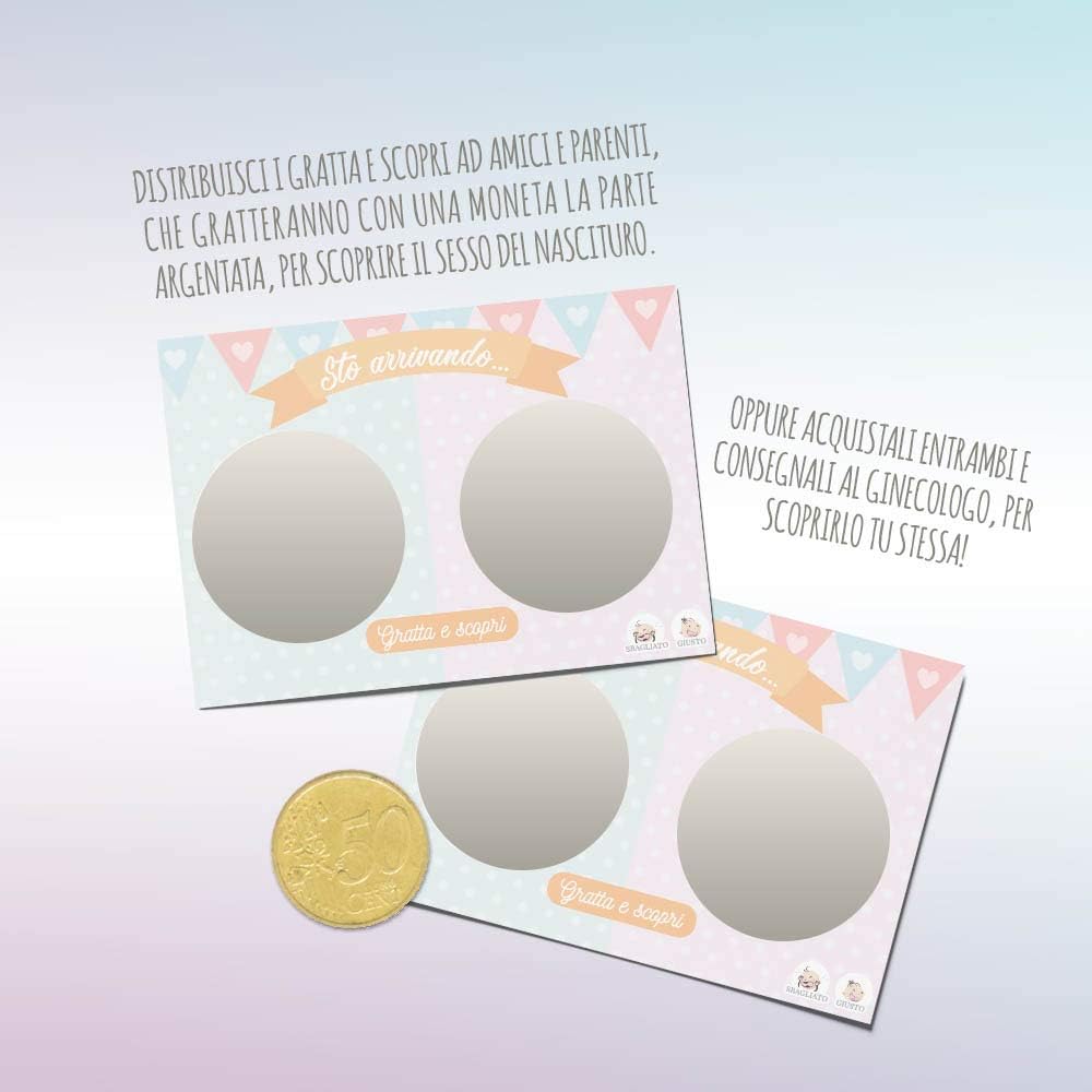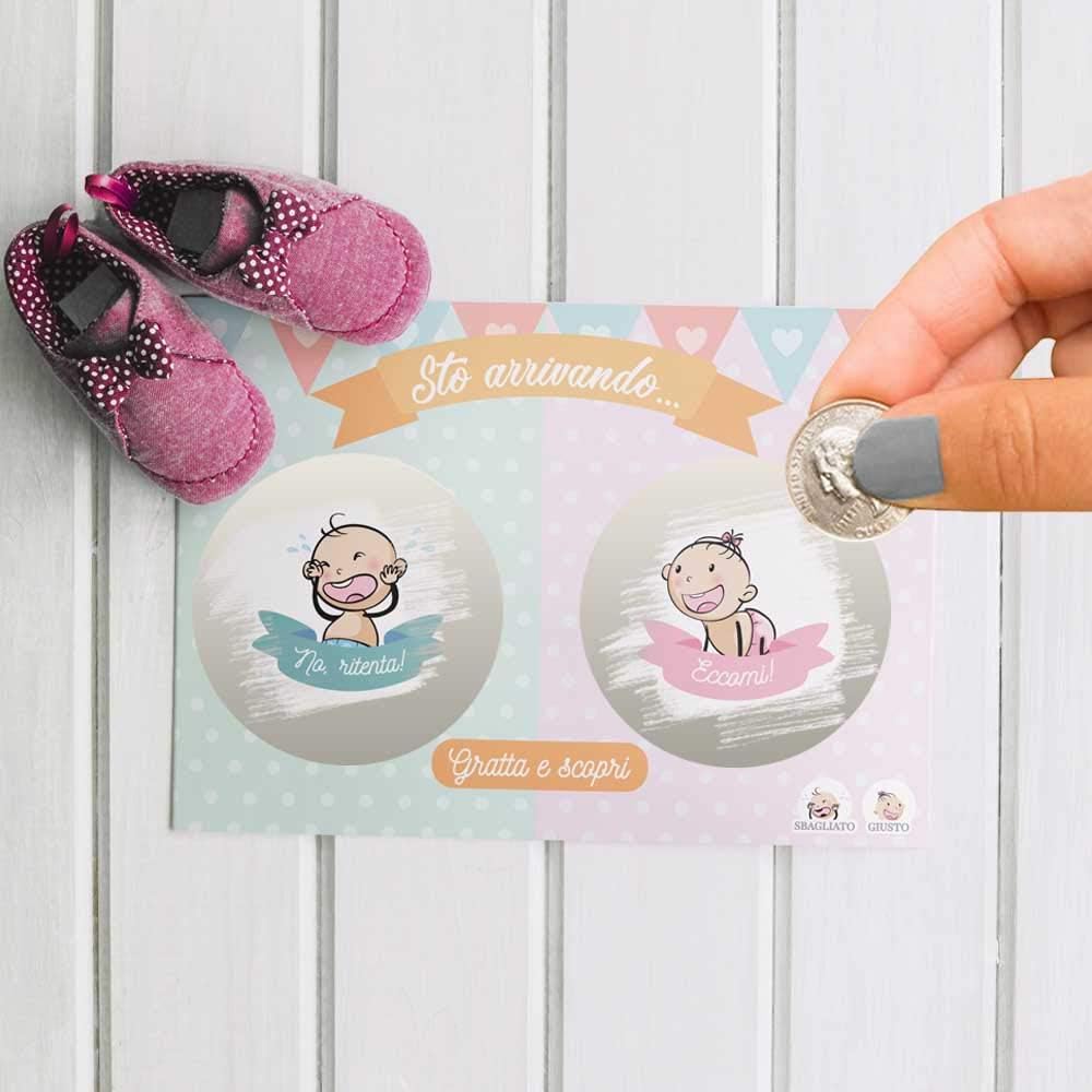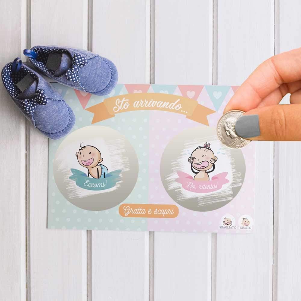 10 scratch card per rivelare il sesso del futuro nascituro Gratta il cerchio e scopri se sarà un maschietto o una femminuccia Disponibili in set da 10 pz per lui o per lei, oppure un set da 20pz per entrambi(10 x lui e 10 x lei) Realizzati in cartoncino spesso da 200g/m2 pretagliato Modello: My Baby Love - Dimensioni: 8 x 12 cm
