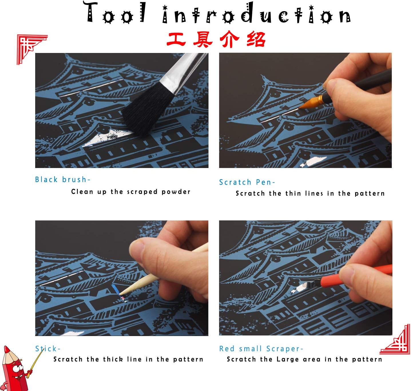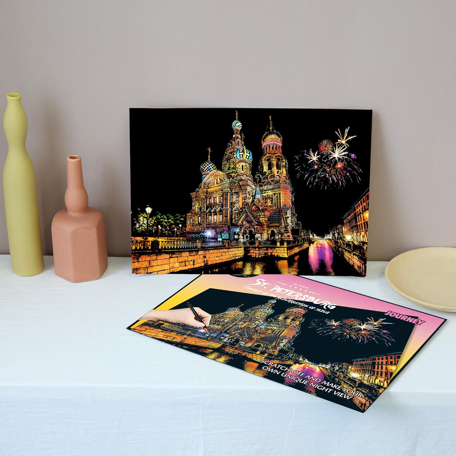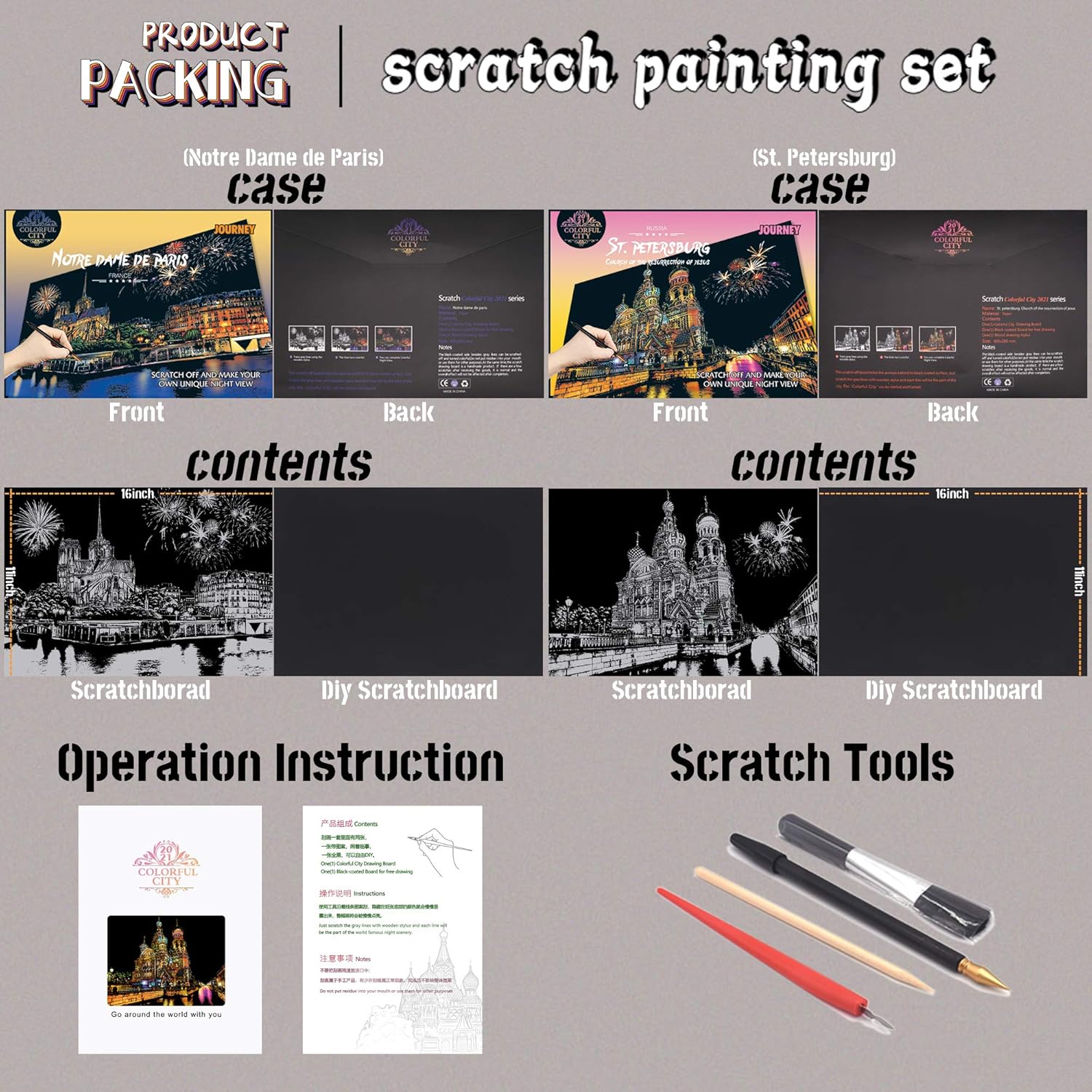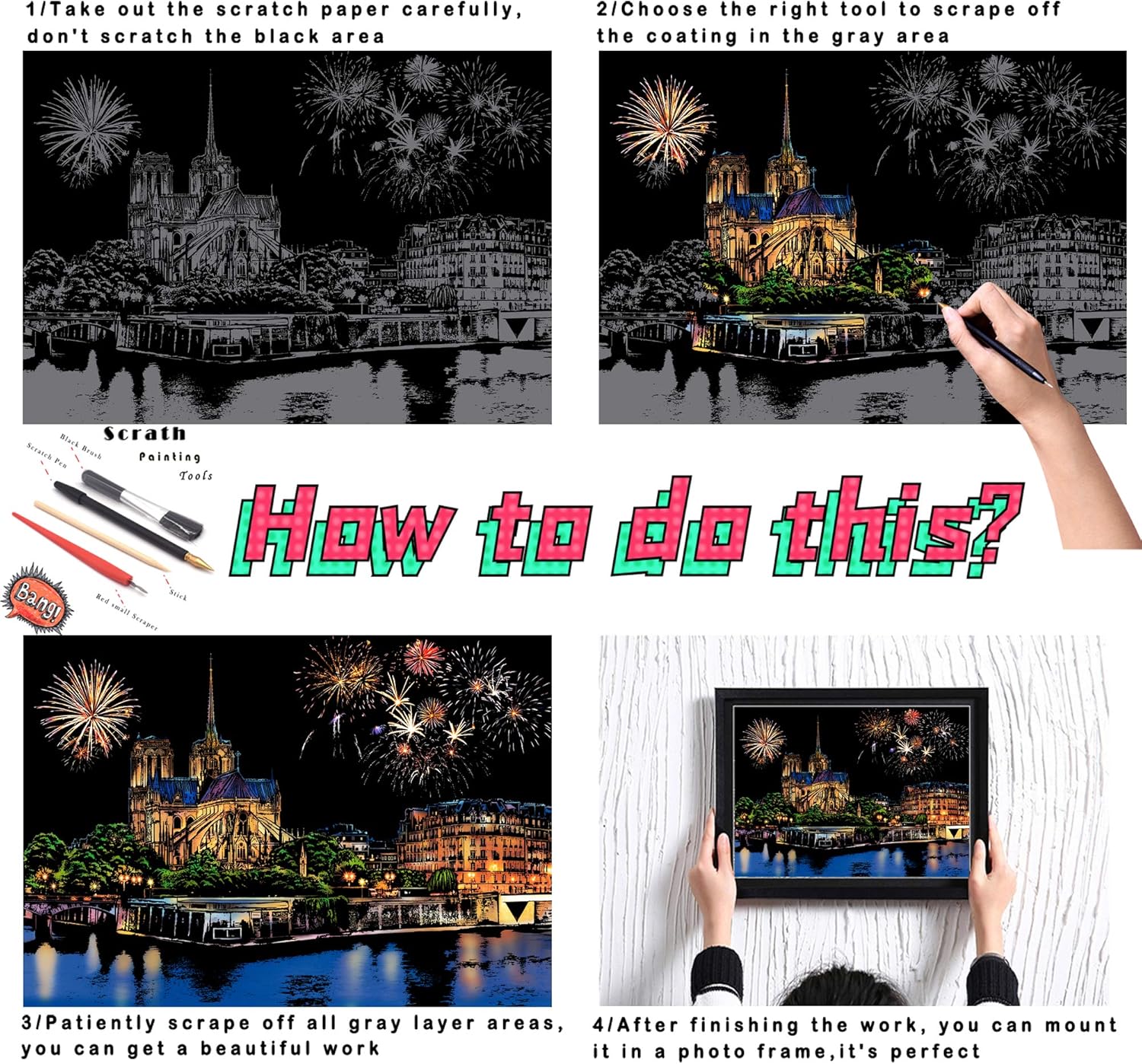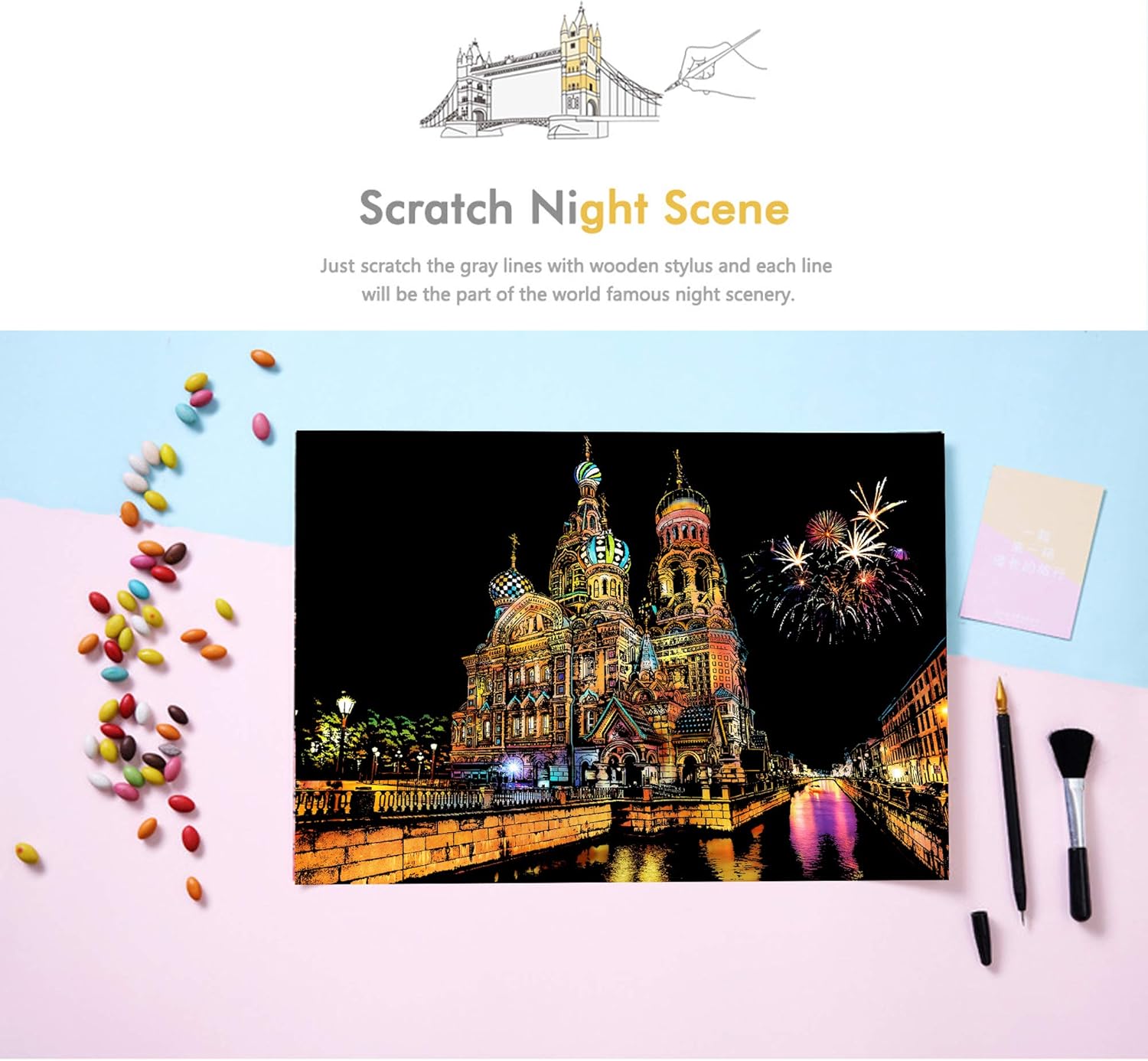 1. Artigianato per pittura antigraffio per adulti e bambini: la nostra carta artistica arcobaleno antigraffio è realizzata in carta patinata di alta qualità, polvere inodore e atossica e ha superato la certificazione CE-ROHS. È stato progettato secondo le immagini della scena notturna della città reale con alta riproduzione. Il nostro set di carta artistica arcobaleno è perfetto per adulti o bambini di età superiore ai 4 anni. Può essere utilizzato per vari regali di festa o bomboniere e regali di compleanno (Chiesa della Resurrezione di Gesù e Notre Dame de Paris). 【2. City Night Scene Scratch Rainbow Art Paper vs Set artistico tradizionale di carta da grattare nera: utilizza lo strumento gratta per grattare lo schizzo grigio sulla carta artistica arcobaleno per rivelare un vero e bellissimo motivo di scena notturna della città. Una volta finito, diventerà una bella decorazione. È più collezionabile rispetto al tradizionale set artistico di carta da grattare nera. 【3. Artigianato da grattare per adulti e bambini per ammazzare il tempo: se vuoi ammazzare il tempo tranquillamente, queste dimensioni e peso sono molto portatili e puoi crearli in qualsiasi momento. Questo è un progetto molto pulito e divertente, non preoccuparti che rovini il tuo spazio. 【4. Il set di carta artistica Scratch Rainbow include: 2 lavagne da pittura/2 tavole vuote per pittura fai da te, 1 pennino in legno, 1 raschietto rosso piccolo, 1 penna per grattare, 1 pennello nero. 【5. Garanzia di servizio al 100%: rilasceremo nuovi modelli di volta in volta. Il servizio clienti è la nostra prima priorità. Se avete domande. Pls non esitate a contattarci, risolveremo il vostro problema la prima volta per garantire la vostra migliore esperienza di acquisto.