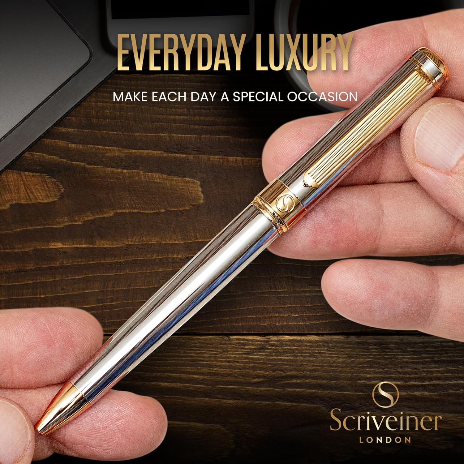 Godi la sensazione di scrivere con una penna di lusso - Splendida penna a sfera di lusso di Scriveiner. Ottone cromato silver con finitura placcato in vero oro. Qualità premium e lusso raffinato da una marca britannica da boutique. Riporta su carta I pensieri senza fatica - Utilizziamo le ricariche tedesche che consentono alla penna di scorrere facilmente su qualsiasi tipo di carta. Con un peso perfetto e bilanciato per una scrittura confortevole è la penna elegante progettata per chi ama scrivere e deve farlo ogni giorno. Attira l'attenzione dei colleghi e delle persone che ami - La penna è proposta in un bellissimo cofanetto che la rende l'idea regalo perfetta per uomo o donna. Sia per uso casual o in circostanze particolari, per lavoro, ufficio o esigenze specifiche, la Scriveiner Luxury Pen è la penna a sfera importante e professionale che non passa inosservata. Manifesta eleganza, ricercatezza e sfarzo contenuto - Le penne Scriveiner sono progettate a Londra, in Inghilterra e condividono gli attributi senza tempo del classico design britannico. Acquista con totale fiducia - Servizio clienti incredibile e garanzia di rimborso. I nostri clienti sono il cuore pulsante di tutto ciò che facciamo. Se non sei soddisfatto, cercheremo di venire incontro alle tue esigenze o di rimborsarti, secondo le tue preferenze. Siamo consapevoli della qualità dei nostri prodotti e vogliamo che il cliente abbia il meglio possibile.