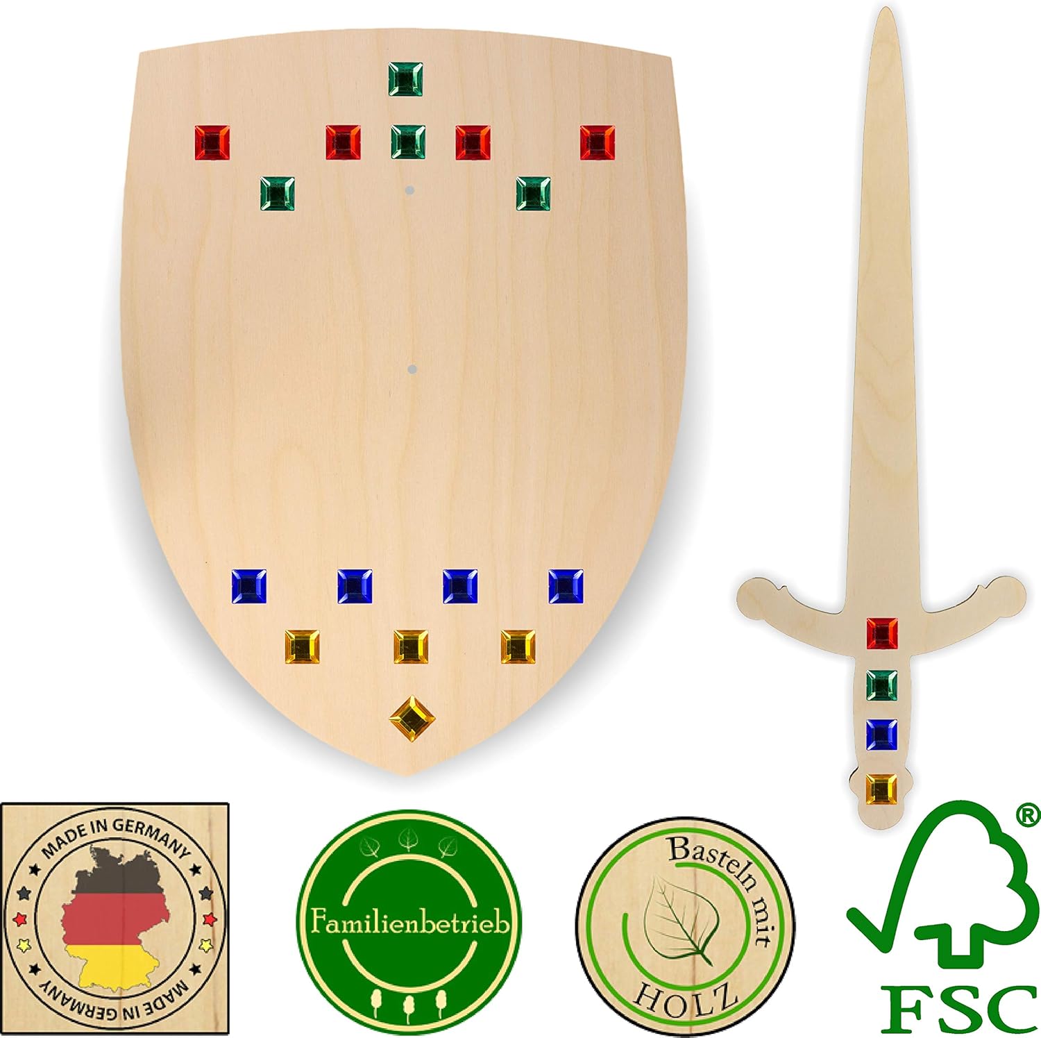Compensato di betulla da 3 mm - super leggero e molto stabile, liberamente personalizzabile con colori e pennarelli glitterati incluse 20 grandi pietre glitter autoadesive (15x15x4 mm) in 4 colori materiale non trattato, superfici finemente levigate, bordi levigati, certificato secondo E1 Made in Germany - produzione propria Dimensioni della targa ca. 32 x 24 x 0,3 cm, dimensione della spada ca. 40 x 8,5 x 0,3 cm Non adatto a bambini di età inferiore a 3 anni, non senza la supervisione di un adulto, questo prodotto non offre alcuna protezione, conforme CE