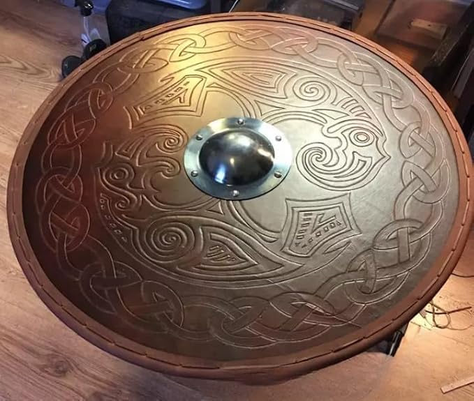 Misura 61 cm di diametro, questo scudo presenta un robusto nucleo in legno, sapientemente rivestito in pelle di alta qualità Design autentico: realizzato in legno e metallo, questo scudo presenta una forma rotonda con intricati disegni ispirati alle armature vichinghe medievali Versatile: non solo lo scudo è perfetto per cosplay, ma può anche essere utilizzato come pezzo decorativo per la casa o l'ufficio Regalo ideale: questo scudo è un ottimo regalo per gli appassionati di storia medievale, cosplay o giochi di ruolo, ed è sicuro di impressionare con il suo design intricato e la lavorazione di alta qualità Costruzione: lo scudo è sapientemente realizzato con attenzione ai dettagli, garantendo durata e longevità. Piccole variazioni possono variare a contrasto, i colori rispetto all'immagine del prodotto a causa dei processi di compilazione della fotografia. Il prodotto è puramente uguale a quello mostrato nelle immagini