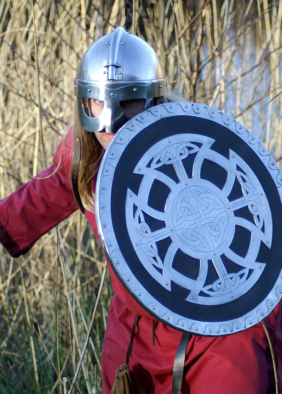 Ricostruzione autentica di uno scudo rotondo vichingo in legno con robusti raccordi in acciaio e un motivo artistico di nodi nella piastra centrale - ideale per collezionisti medievali e appassionati di rievocazioni, diametro ca. 54,5 cm Adatto per battaglie da spettacolo con imbottitura in pelle sul retro e due cinghie in pelle, una regolabile per il trasporto sul braccio o sulla schiena - perfetto come accessorio impressionante per rappresentazioni storiche in gruppi di rievocazione Costruzione robusta in legno, acciaio e pelle per Presenza duratura, peso ca. 3,7 kg - un must per gli appassionati della guerra dell'epoca germanica e vichinga in occasione di festival ed eventi medievali Design funzionale con imbottitura rivettata per una presa sicura, ispirato a reperti archeologici - versatile come pezzo decorativo o elemento pratico nell'attrezzatura per la rievocazione storica Qualità artigianale con una finitura rustica per un autentico look vintage - immergiti in epoche passate con questo storico scudo rotondo per rievocazioni e collezioni medievali