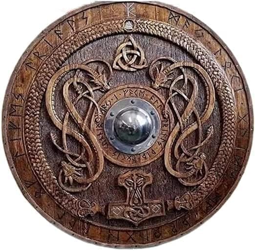 Realizzato con materiali e finiture di altissima qualità. Dimensioni: 61 x 61 cm circa. Peso: 4 kg (circa) Perfetto per decorare casa, ufficio, barca o ristorante Scudo decorativo in legno fatto a mano in stile vichingo medievale Scudo vichingo: rifinito in aspetto invecchiato naturale. Scudo nuovo e mai usato.