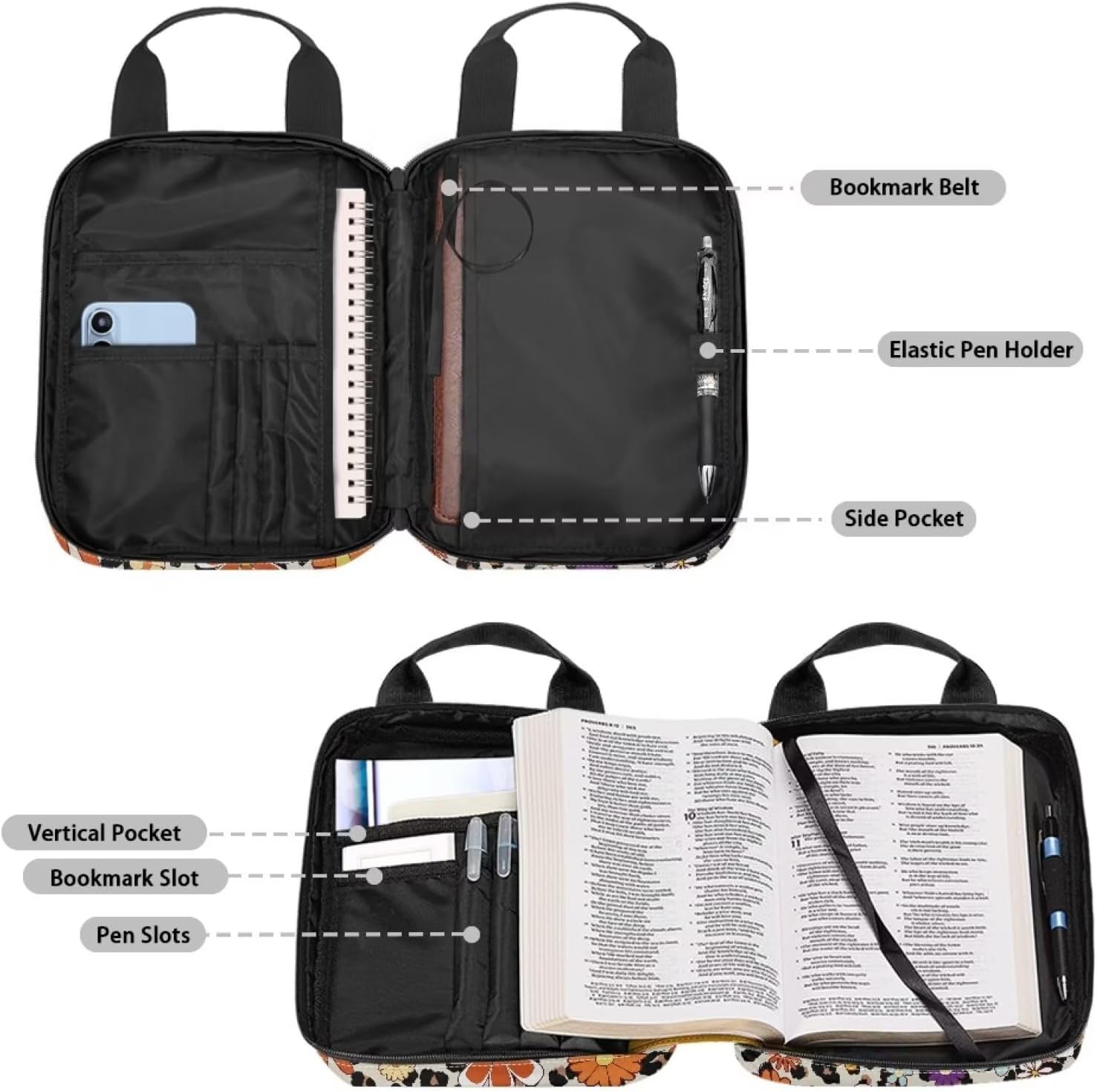 Materiale durevole: le coperture della Bibbia sono realizzate in poliestere di alta qualità e cerniera in metallo resistente. La cinghia da polso sulla borsa della Bibbia lo rende facile da trasportare, questa copertura per bibbia può proteggere la Bibbia dai graffi. Ampio spazio di archiviazione: 27,4 x 21,3 x 6,9 cm. La custodia per la Bibbia presenta una tasca frontale con cerniera e diverse organizzazioni interne per contenere penne, segnalibri, biglietti di preghiera, quaderni, ecc. Avere i tuoi oggetti di studio sempre in un comodo bagaglio a mano, tutto per casa, chiesa o scuola. Portatile e leggero: questa Bibbia copre per donne e uomini, bambini. Puoi portarlo in chiese, scuole, biblioteche e sale studio in qualsiasi momento per il tuo studio biblico, culto o pellegrinaggio. Multifunzione: questa custodia per il trasporto della Bibbia può essere utilizzata come borsa, custodia per tablet, valigetta, borsa per il trucco, copertina per libri, libreria per studio biblico, ecc. Regalo perfetto: il motivo unico aggiunge un tocco di un elegante regalo divertente per compleanno, festa della mamma, Pasqua, Natale o qualsiasi altra occasione speciale per bambini, madre e sorelle, amici, amanti della famiglia e te stesso.