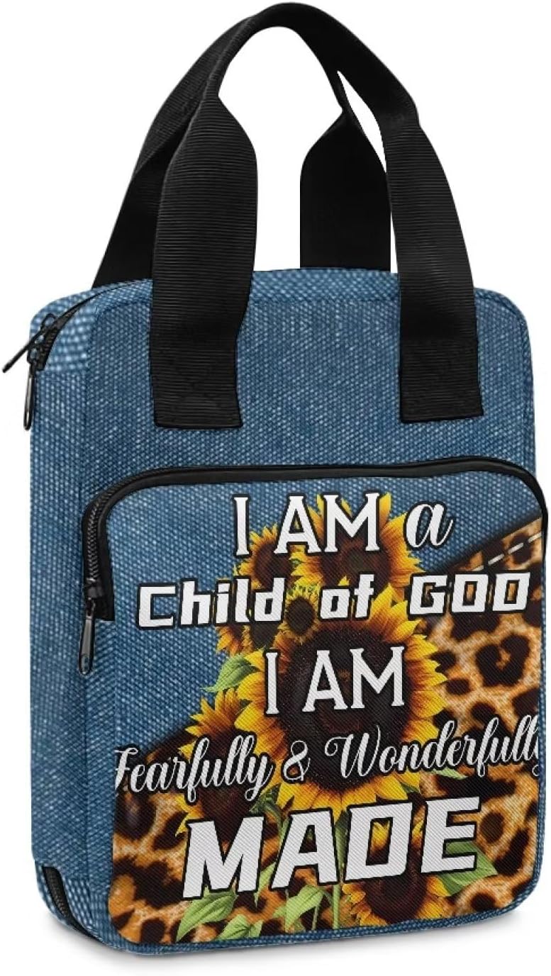 Materiale durevole: le coperture della Bibbia sono realizzate in poliestere di alta qualità e cerniera in metallo resistente. La tracolla sulla borsa della Bibbia lo rende facile da trasportare, questa copertura della Bibbia può proteggere la tua Bibbia da graffi. Un sacco di stoccaggio: 27,4 x 21,3 x 6,9 cm. La custodia della borsa della Bibbia presenta una tasca frontale con cerniera e più organizzazioni interne per contenere penne, segnalibri, biglietti di preghiera e quaderni, ecc. Avere i tuoi oggetti di studio sempre in un comodo bagaglio a mano per casa, chiesa o scuola. Portatile e leggero: questa Bibbia copre per donne e uomini, bambini. Puoi portarlo in chiese, scuole, biblioteche e sale studio in qualsiasi momento per il tuo studio biblico, culto o pellegrinaggio. Multifunzione: questa custodia per il trasporto della Bibbia può essere utilizzata come borsa, custodia per tablet, valigetta, borsa per la Bibbia, borsa per il trucco, copertina per libri, libreria per studio biblico, ecc. Regalo perfetto: il motivo unico aggiunge un tocco di un regalo elegante e divertente per compleanno, festa della mamma, Pasqua, Natale o qualsiasi altra occasione speciale per i tuoi figli, madre e sorelle, amici, amanti della famiglia e te stesso.