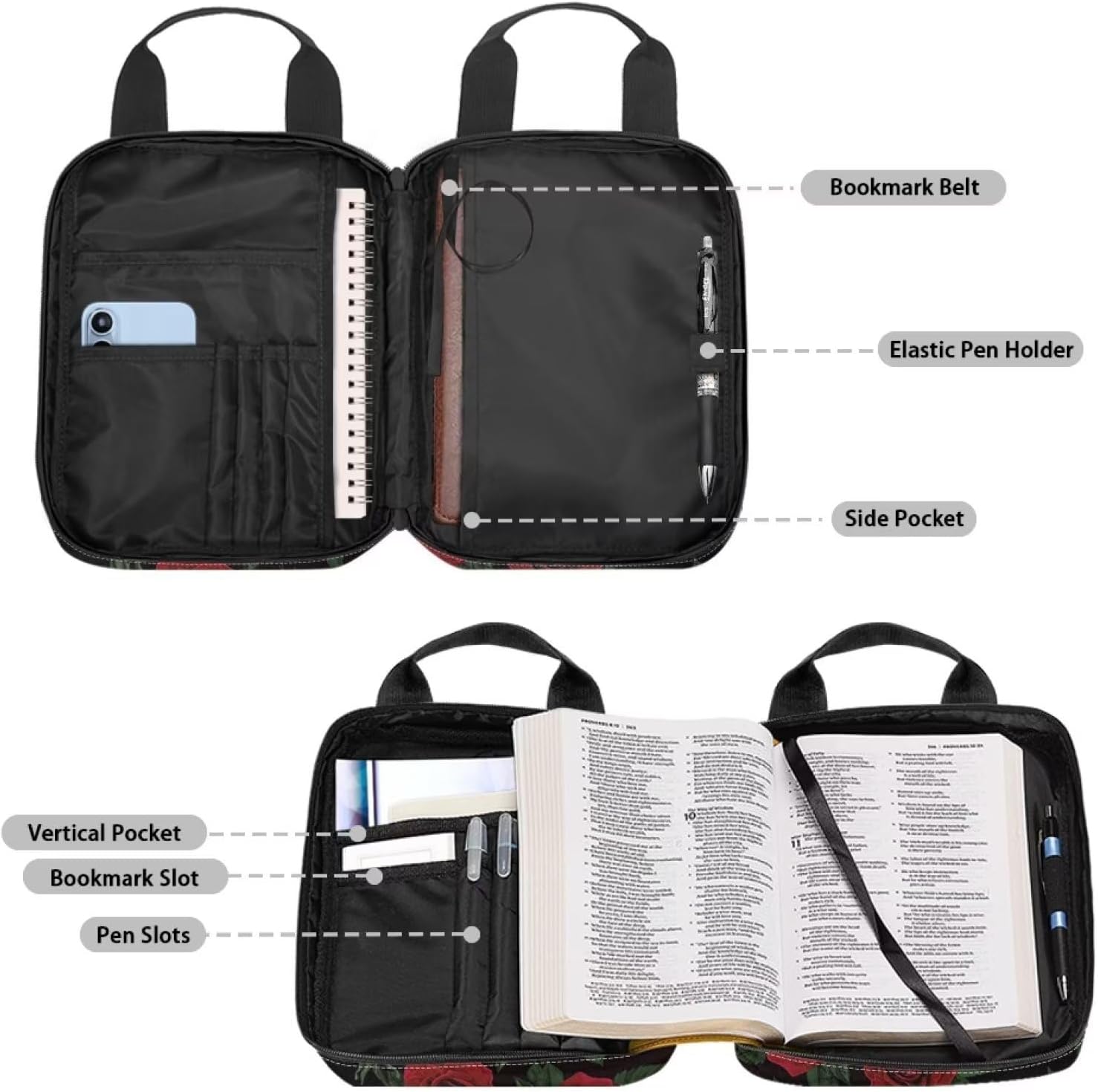 Materiale durevole: le coperture della Bibbia sono realizzate in poliestere di alta qualità e cerniera in metallo resistente. La tracolla sulla borsa della Bibbia lo rende facile da trasportare, questa copertura della Bibbia può proteggere la tua Bibbia da graffi. Un sacco di stoccaggio: 27,4 x 21,3 x 6,9 cm. La custodia della borsa della Bibbia presenta una tasca frontale con cerniera e più organizzazioni interne per contenere penne, segnalibri, biglietti di preghiera e quaderni, ecc. Avere i tuoi oggetti di studio sempre in un comodo bagaglio a mano per casa, chiesa o scuola. Portatile e leggero: questa Bibbia copre per donne e uomini, bambini. Puoi portarlo in chiese, scuole, biblioteche e sale studio in qualsiasi momento per il tuo studio biblico, culto o pellegrinaggio. Multifunzione: questa custodia per il trasporto della Bibbia può essere utilizzata come borsa, custodia per tablet, valigetta, borsa per la Bibbia, borsa per il trucco, copertina per libri, libreria per studio biblico, ecc. Regalo perfetto: il motivo unico aggiunge un tocco di un regalo elegante e divertente per compleanno, festa della mamma, Pasqua, Natale o qualsiasi altra occasione speciale per i tuoi figli, madre e sorelle, amici, amanti della famiglia e te stesso.