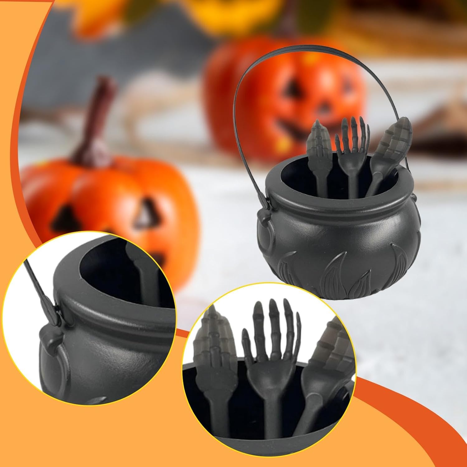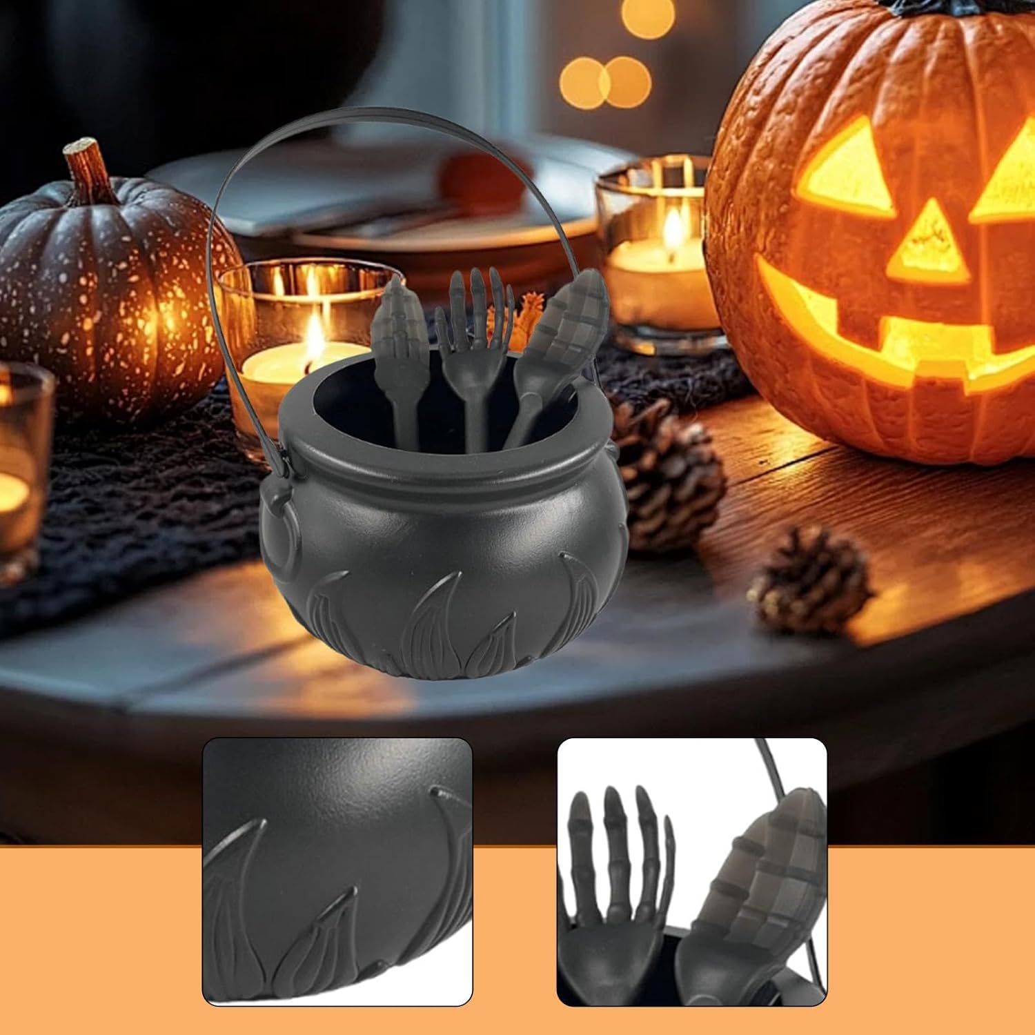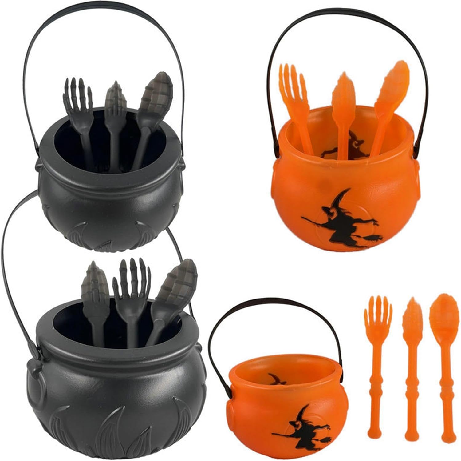 【Set di stoviglie per Halloween spettrale】: Include un secchio e un set di utensili da 3 pezzi, ideali per aggiungere un tocco spettrale alla tua festa di Halloween 【Materiale plastico】: La struttura leggera ma robusta del mini calderone di Halloween sospeso garantisce una manipolazione sicura e un divertimento riutilizzabile per più stagioni di Halloween piatto di caramelle funzionale e una decorazione giocosa, un divertente regalo di Natale per amici o familiari,Design compatto e portatile: mini porta caramelle di Halloween con una comoda maniglia per un facile trasporto a feste o eventi all'aperto