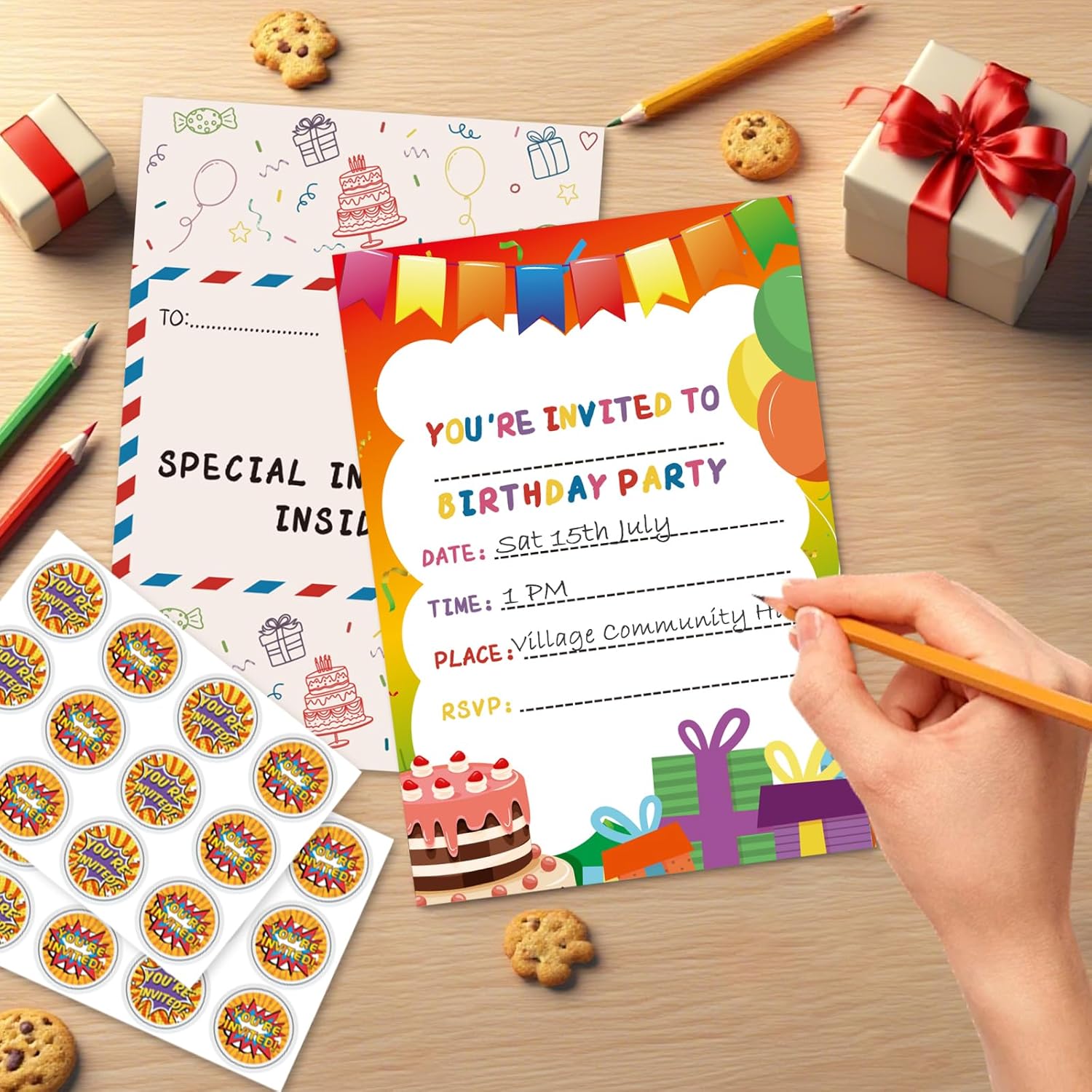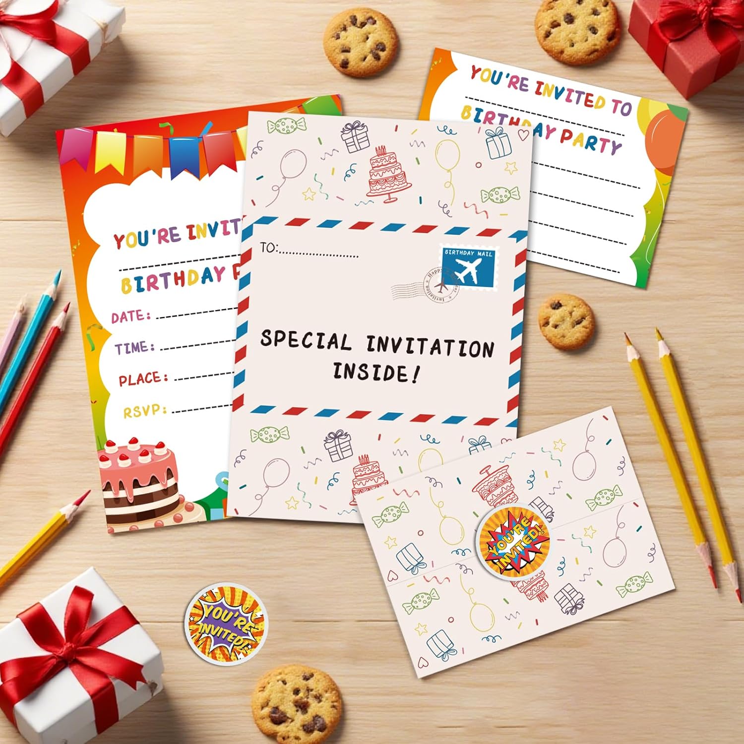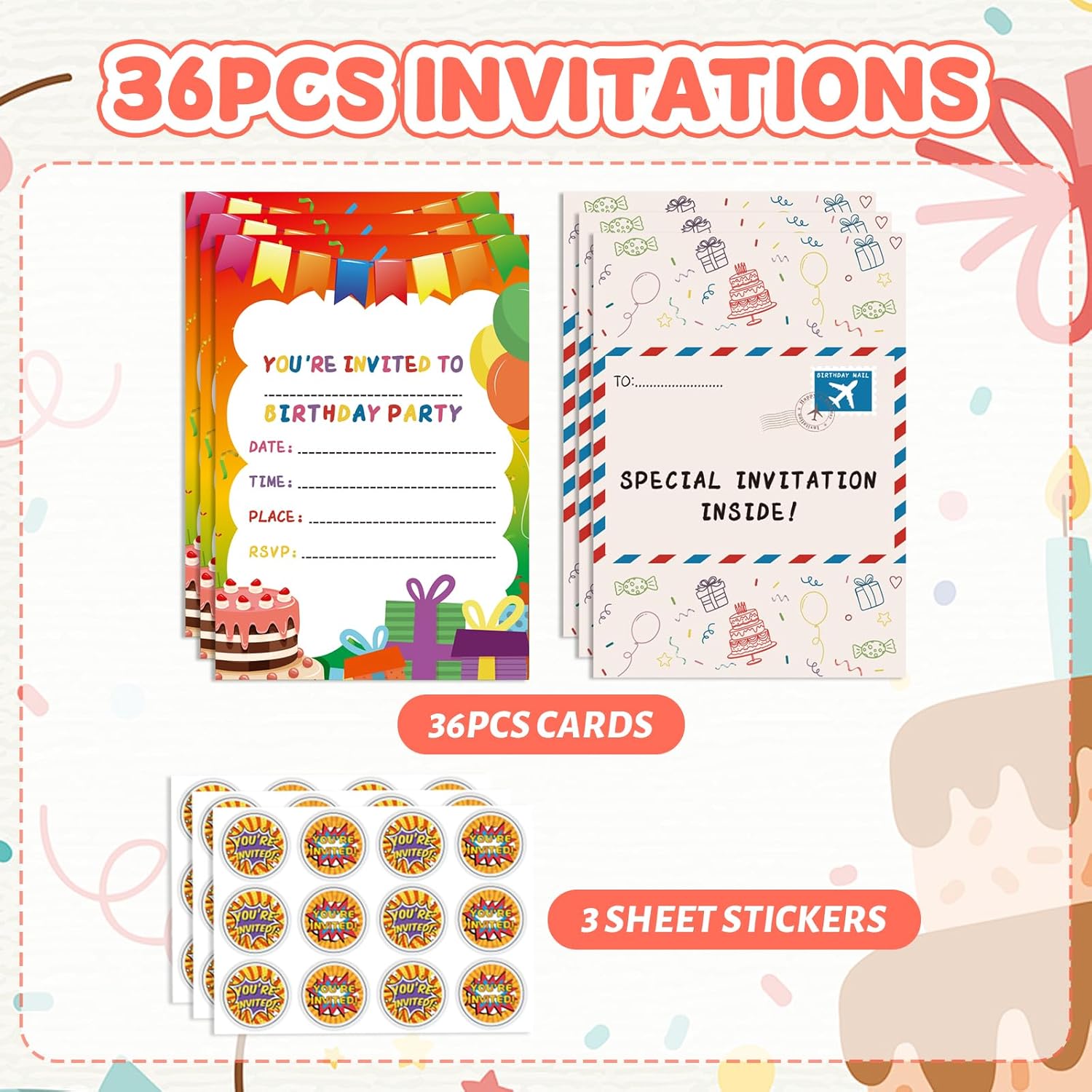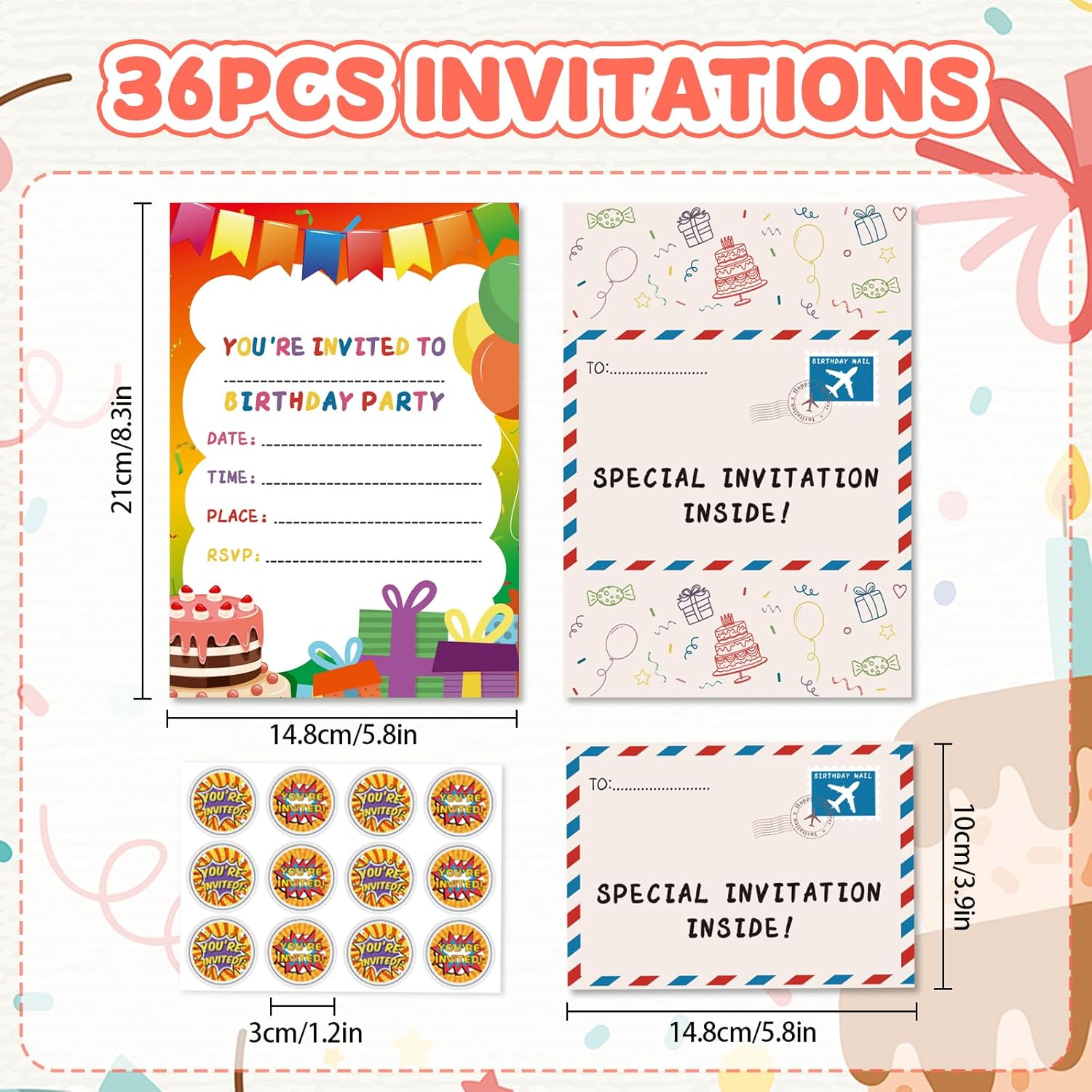 Contenuto della confezione: riceverai 24-36 biglietti di invito di compleanno e adesivi, sufficienti per soddisfare le tue esigenze di festa di compleanno. Invita amici, famiglie, compagni di classe con questi bellissimi biglietti di invito e fai una festa indimenticabile! Design a busta pieghevole: questi inviti sono progettati con una stampa su entrambi i lati, puoi piegarli e sembreranno una busta. La busta stampata con una "posta aerea", che rende gli inviti come una posta. Biglietto di alta qualità: i nostri inviti sono stampati su cartoncino da 250 g/m². Facili da scrivere e facili da piegare, sono il modo perfetto per invitare amici e familiari alla tua festa di compleanno speciale. Dimensioni adeguate: i nostri inviti in formato 14,7 x 20,8 cm (carta A5), con spazio sufficiente per riempire i dettagli del tuo evento, i nostri inviti per feste di compleanno per ragazzi e ragazze. Ampia applicazione: i biglietti di invito di compleanno sono squisite aggiunte alle feste di compleanno dei bambini, feste di baby shower, feste festive e altre feste a tema, lasciando un'impressione indimenticabile per i tuoi ospiti.