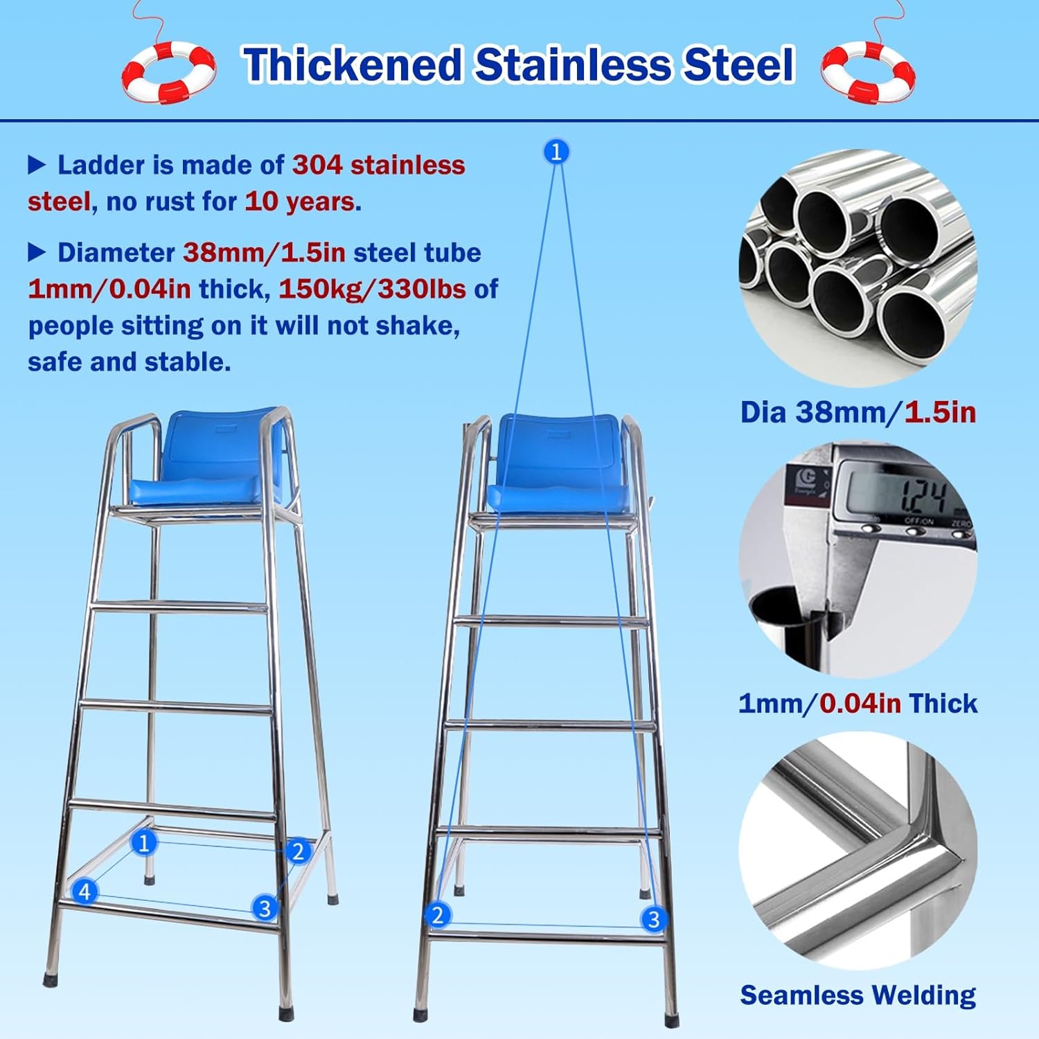 Migliora la sicurezza con le nostre protezioni per i piedi delle sedie da bagnino, progettate per prevenire scivolamenti e graffi sul pavimento. Dotato di un tubo di supporto posteriore aggiuntivo per una maggiore stabilità Facile da montare: questa sedia da bagnino presenta un design intuitivo che consente una rapida installazione. Con gli accessori inclusi e le istruzioni chiare, un adulto può assemblarlo in soli 20 minuti. Realizzata in acciaio inossidabile 304, la nostra scala presenta una robusta parete spessa 1,0 mm e un tubo rinforzato di 38 mm di diametro. Questo design aiuta a resistere alla corrosione del cloro della piscina Servizio:Attribuiamo grande importanza all'esperienza di acquisto dei nostri clienti. Se hai domande, non esitare a contattarci, ti risponderemo il prima possibile entro 24 ore Migliora la tua esperienza in piscina con le nostre sedie da bagnino dotate di gancio per salvagente e foro parasole integrato. Progettato per una facile installazione