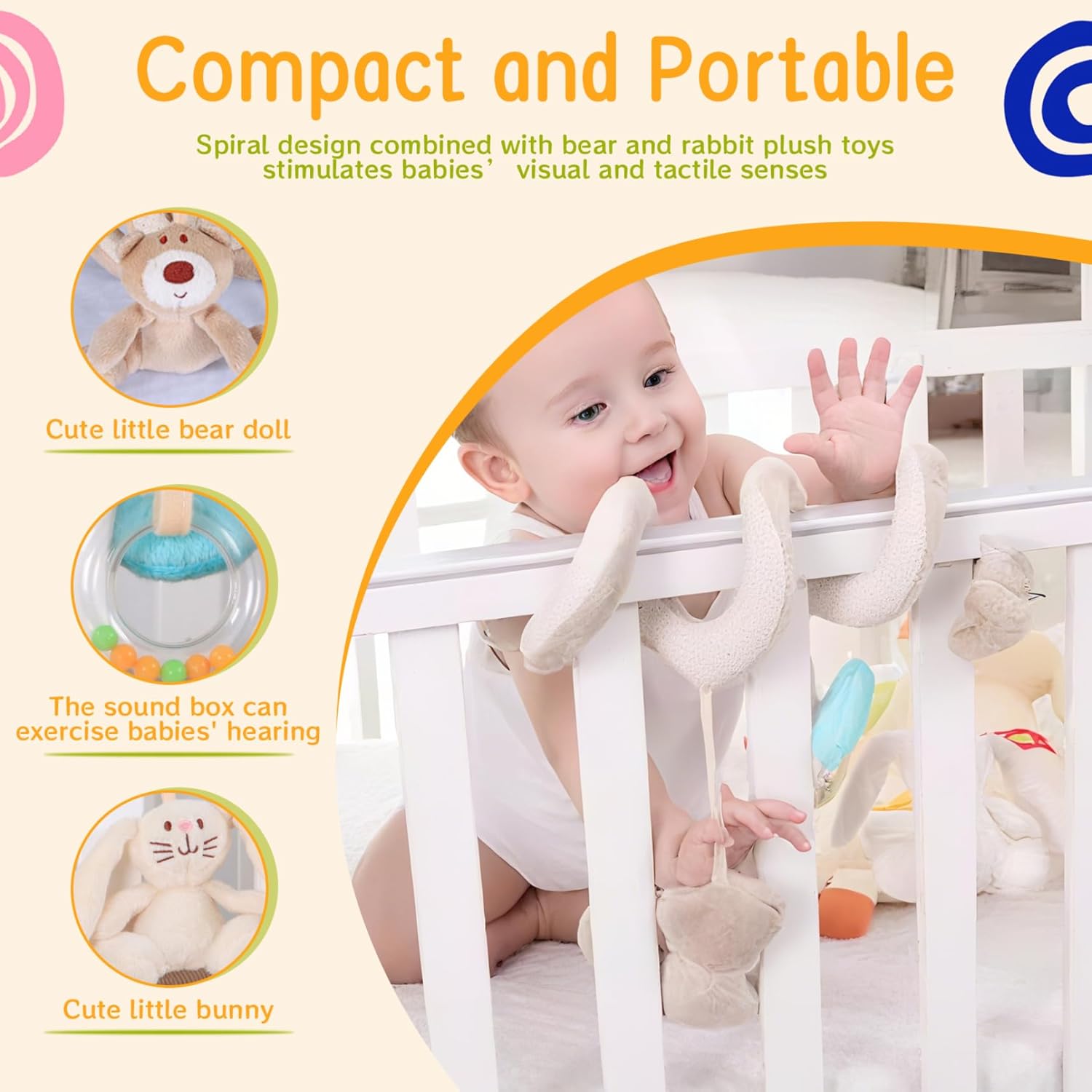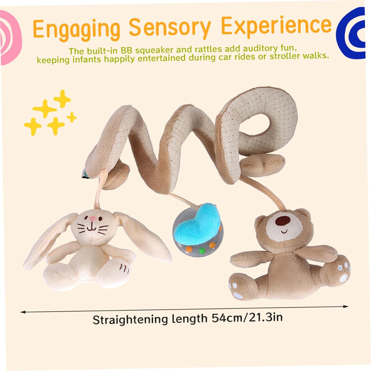 Lavabile: realizzato con materiali di qualità, questo seggiolino per auto a spirale resiste a un uso frequente e può essere pulito facilmente, mantenendo i suoi colori brillanti e la consistenza morbida nel tempo per un divertimento duraturo. Esperienza sensoriale coinvolgente: il design a spirale combinato con i peluche di orsetti e conigli stimola i sensi visivi e tattili dei bambini, incoraggiando la coordinazione occhio-mano e lo sviluppo delle abilità motorie..Il cigolio BB e i sonagli integrati aggiungono divertimento uditivo, intrattenendo felicemente i bambini durante i viaggi in macchina o le passeggiate con il passeggino. Compatto e portatile: questo giocattolo ripiega ordinatamente, rendendolo perfetto per i viaggi o per riporlo rapidamente nelle borse per pannolini..È una scelta comoda e salvaspazio che tiene impegnato il tuo bambino ovunque tu vada. Sicuro e adatto ai bambini: realizzato con materiali morbidi e non tossici, questo giocattolo per seggiolino auto è delicato sulla pelle delicata e pienamente conforme agli standard di sicurezza, garantendo un tempo di gioco senza preoccupazioni per il tuo piccolo..Il peluche leggero lo rende facile da afferrare per i bambini senza sforzo. Facile da attaccare ovunque: il design flessibile a spirale consente un facile fissaggio a seggiolini auto, carrozzine, culle o passeggini, adattandosi alla maggior parte dei modelli in modo sicuro senza danneggiare tessuti o hardware, offrendo intrattenimento versatile in movimento.