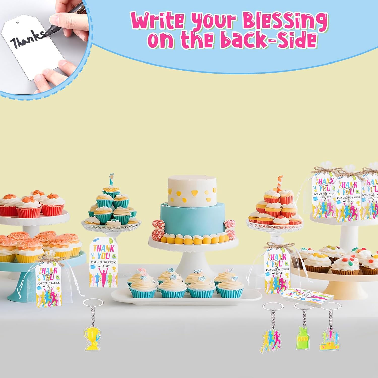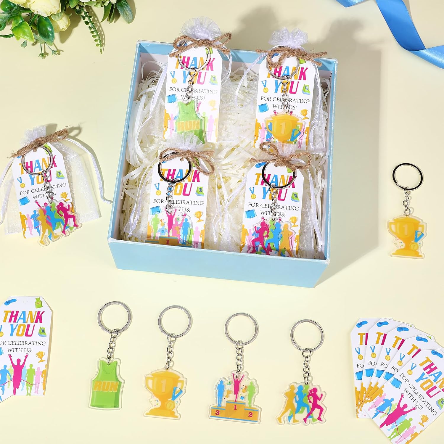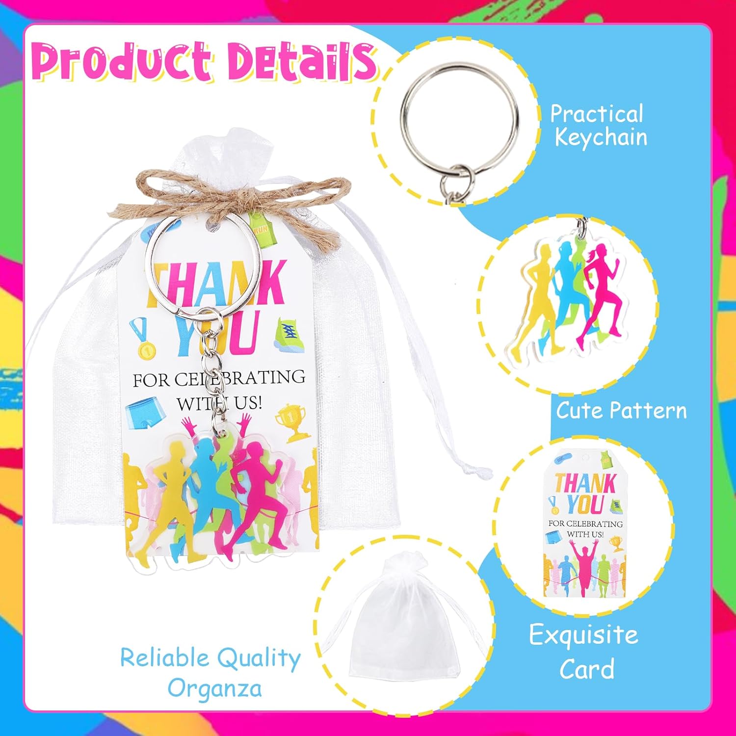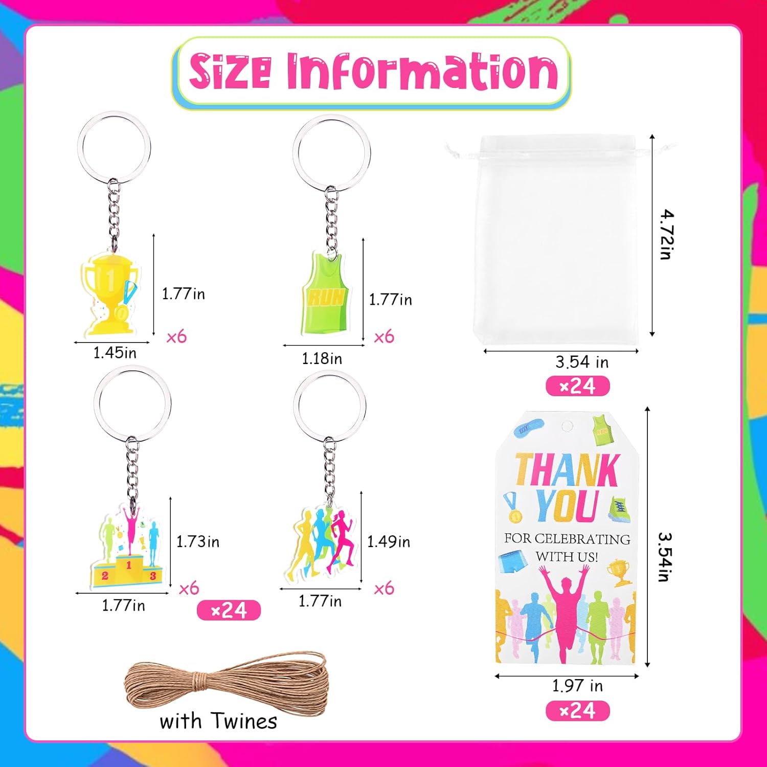 Set completo per feste a tema corsa: questo pacchetto da 3 pezzi include tutto il necessario per un evento memorabile a tema corsa: 24 portachiavi in acrilico (4 disegni unici, 6 ciascuno), 24 biglietti di ringraziamento stampati (12,7 x 22,9 cm) e 24 eleganti sacchetti in organza (22,9 x 30,5 cm). Ideale per maratone, gare 5K, banchetti sportivi o feste di compleanno di atleti, questo set garantisce un look coeso e professionale per i tuoi bomboniere evento Design personalizzati ad alto impatto: ogni portachiavi in acrilico presenta vivaci opere d'arte ispirate alla corsa, dalle scarpe da ginnastica ai motivi della linea finale, aggiungendo un tocco motivazionale. I biglietti di ringraziamento abbinati includono messaggi di ringraziamento, che li rendono ideali per l'apprezzamento dei partecipanti o come ricordo della festa Confezione elegante e funzionale: i sacchetti in organza bianca di alta qualità (22,9 x 30,5 cm) offrono una presentazione lucida mantenendo gli oggetti al sicuro. Leggeri ma riutilizzabili, sono facili da distribuire in occasione di eventi o da utilizzare come sacchetti regalo decorativi Versatile per qualsiasi evento corridore: che tu stia organizzando una gara di beneficenza, una festa di squadra sportiva o un compleanno a tema fitness, questo set si adatta senza sforzo. Include 10 m di spago di iuta per raggruppare bomboniere o creare espositori a tema rustico Stile per feste senza sforzo: include 10 m di spago di iuta per legare etichette, decorare bomboniere o creare display personalizzati. Questo set semplifica la pianificazione delle feste con accessori a tema pronti all'uso che impressionano gli ospiti e ti fanno risparmiare tempo