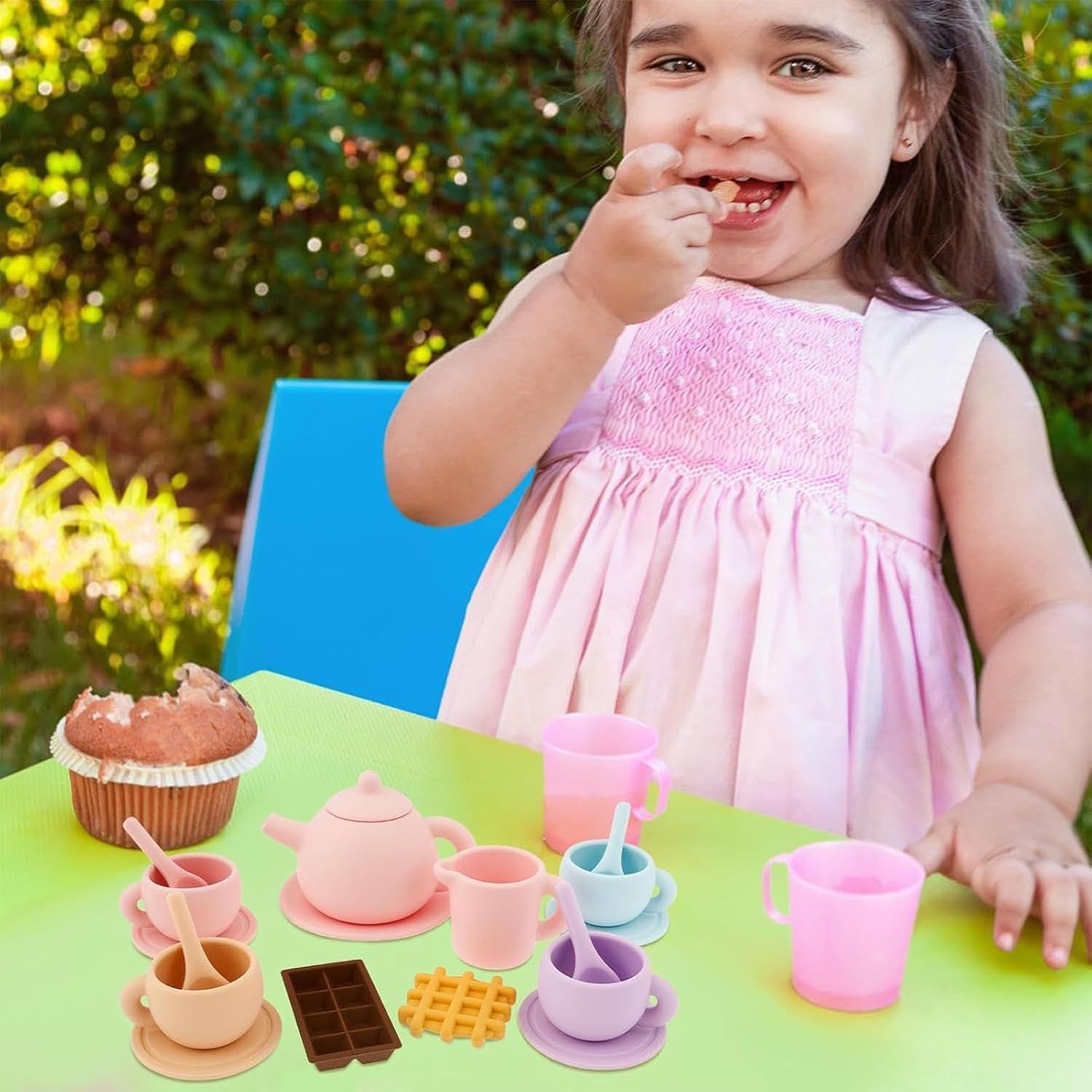 Esperienza di gioco di ruolo coinvolgente: il set da tea party in silicone incoraggia il gioco fantasioso e lo sviluppo di abilità narrative, consentendo ai bambini di ricreare una scena di tea party attraverso un gioco di ruolo coinvolgente che incoraggia la creatività in scenari di gioco di ruolo sociale. Sviluppo delle capacità motorie: il giocattolo del set da tè allena le operazioni manuali attraverso azioni simulate come preparare e servire il tè, migliorando le capacità di coordinazione e promuovendo al tempo stesso le capacità di comunicazione in scenari di gioco interattivi che includono la condivisione e il gioco di ruolo con gli altri. Installazione e conservazione senza sforzo: il simpatico set da tè per i più piccoli offre un trasporto senza problemi e una configurazione rapida, migliorando l'esperienza dell'utente. La sua adattabilità rende le attività familiari divertenti al chiuso facili come tea party, picnic ed eventi di gruppo all'aperto. Ispira l'interazione sociale: il set da tè per bambini è progettato per aiutare i bambini a staccare la spina dagli schermi. Incoraggia il gioco interattivo alle feste del tè, rafforzando i legami con la famiglia e gli amici e simboleggiando i calorosi auguri per la loro crescita, rendendolo un regalo premuroso per compleanni e vacanze. Esperienza di gioco realistica: il set da tè in silicone per i più piccoli consente un gioco di ruolo autentico trattenendo liquidi veri senza perdite. La sua resistente struttura in silicone garantisce resistenza agli urti, rendendolo ideale per vivaci giochi tea party, mentre la sua natura facile da pulire fa risparmiare tempo ai genitori quando il tempo di gioco è finito