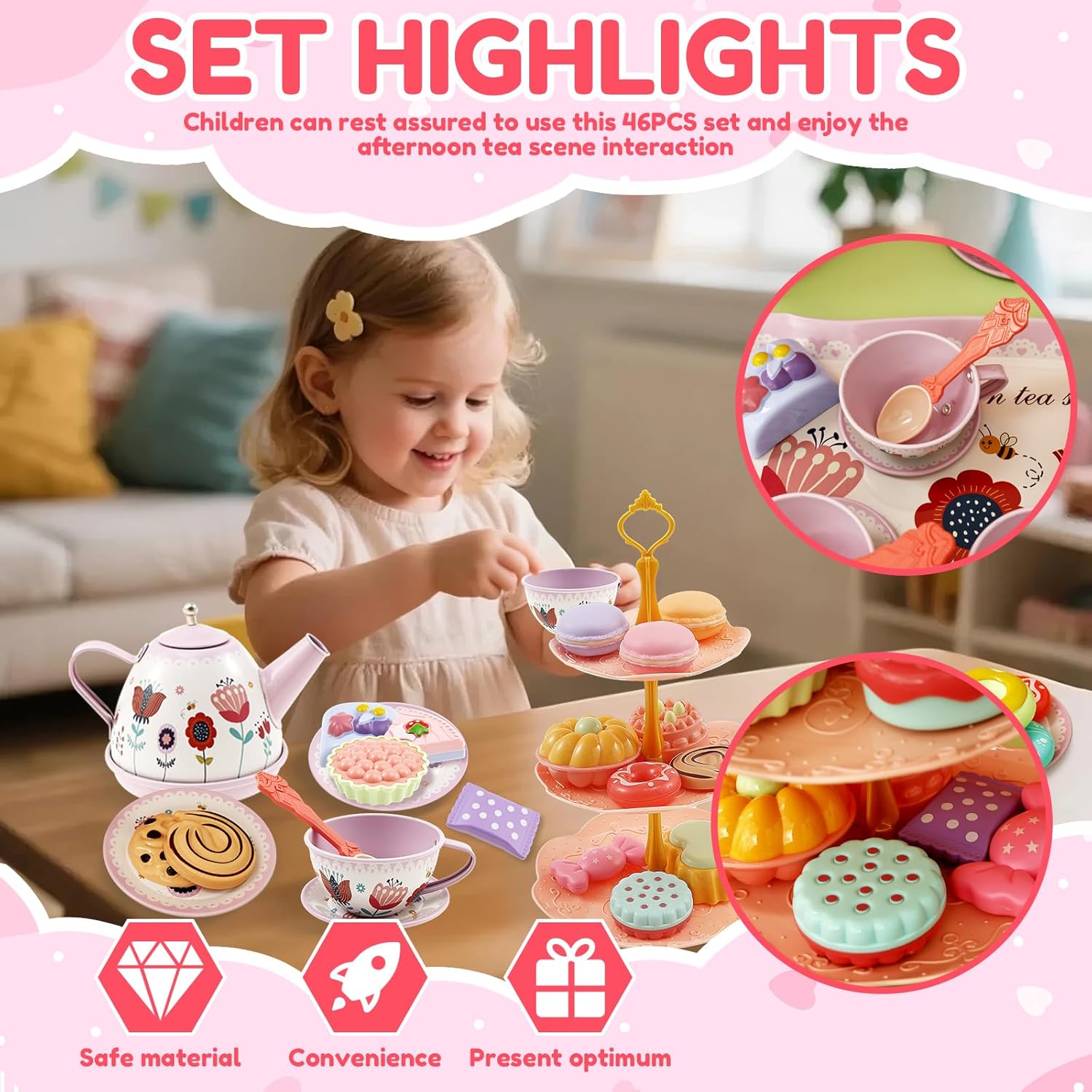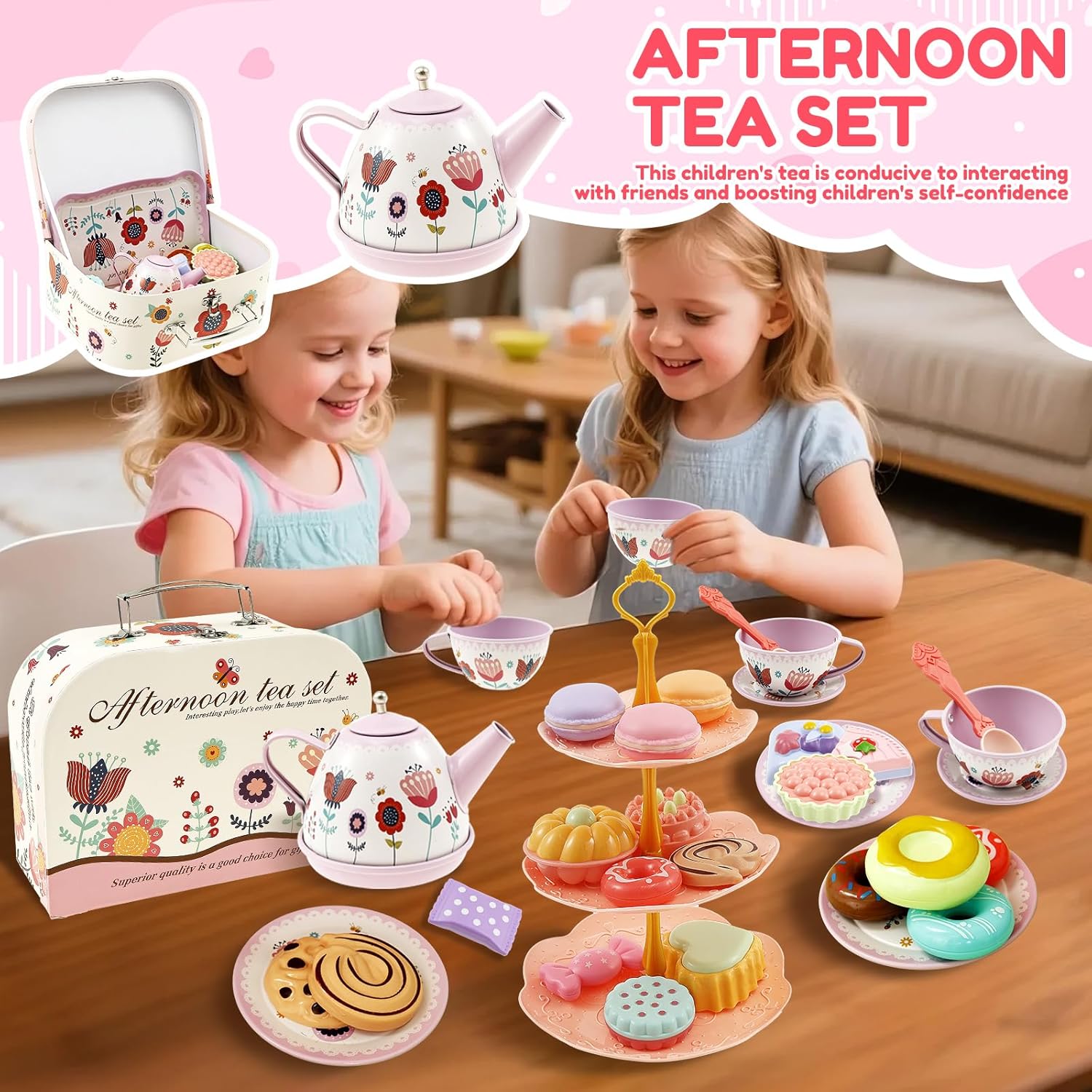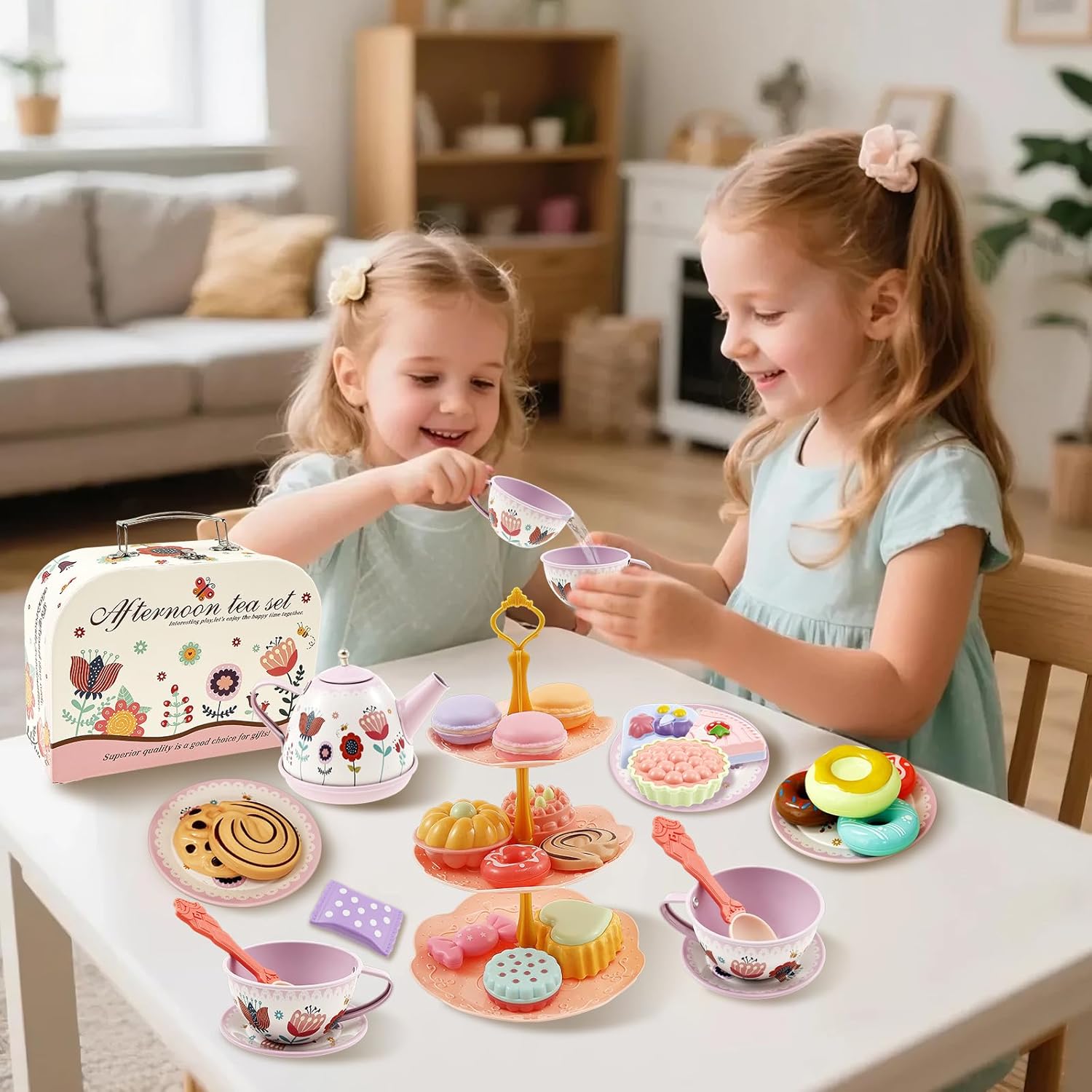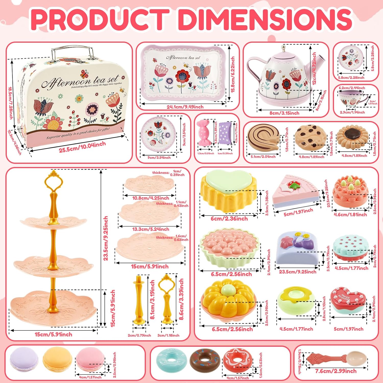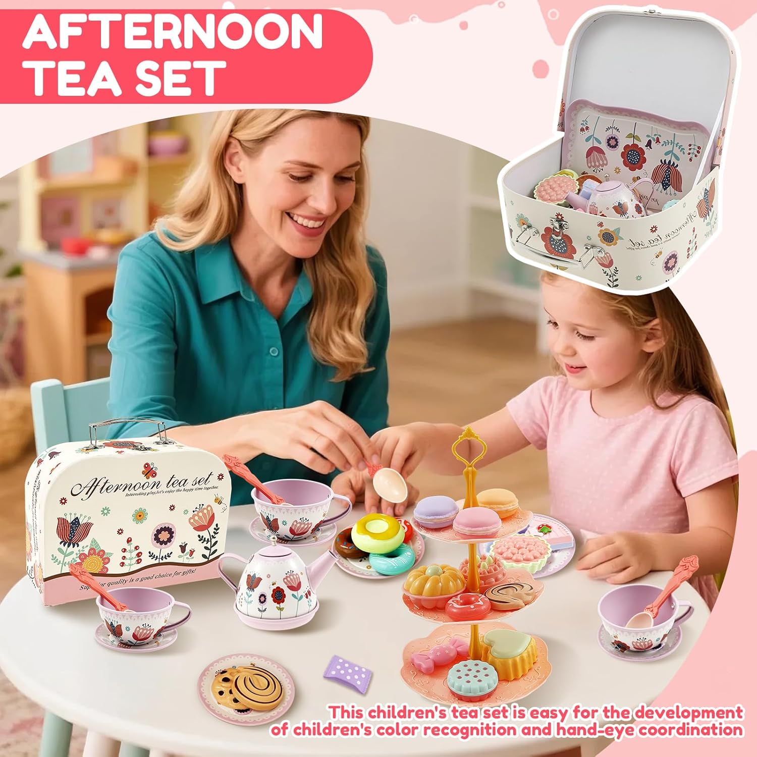 Portatile con valigetta: include una pratica borsa per il trasporto con una maniglia, in modo che i bambini possano portare il set ovunque tu vada. I ricchi accessori da dessert li intrattengono per ore Set completo: 1 teiera, 1 vassoio, 4 tazze, 4 coaster, 4 piatti, 4 cucchiai, 1 supporto per dessert a 3 livelli, 2 caramelle, 3 macarons, 3 ciambelle, 9 torte, 3 biscotti e 1 scatola portaoggetti. Sparks infinita creatività per scenari coinvolgenti del tè Costruzione sicura: il set di lastre di lamiera smussate è sicuro per i bambini.Lasciate che i bambini godano le interazioni di Tea Party senza preoccupazioni Fun Tea Party Gioco di ruolo per bambini: questo set da tè per bambini è progettato per il gioco di ruolo fantasioso e aiuta a sviluppare il riconoscimento dei colori e la coordinazione degli occhi. Perfetto per giochi di gruppo e rafforza la fiducia dei bambini mentre organizzano il "tè del pomeriggio". Regalo ideale per bambini dai 3 ai 9 anni: perfetto per feste da tè o pic-nic, per divertirsi. Doppio come grazioso pezzo decorativo per la stanza, ideale per compleanni, Natale, Halloween o occasioni speciali
