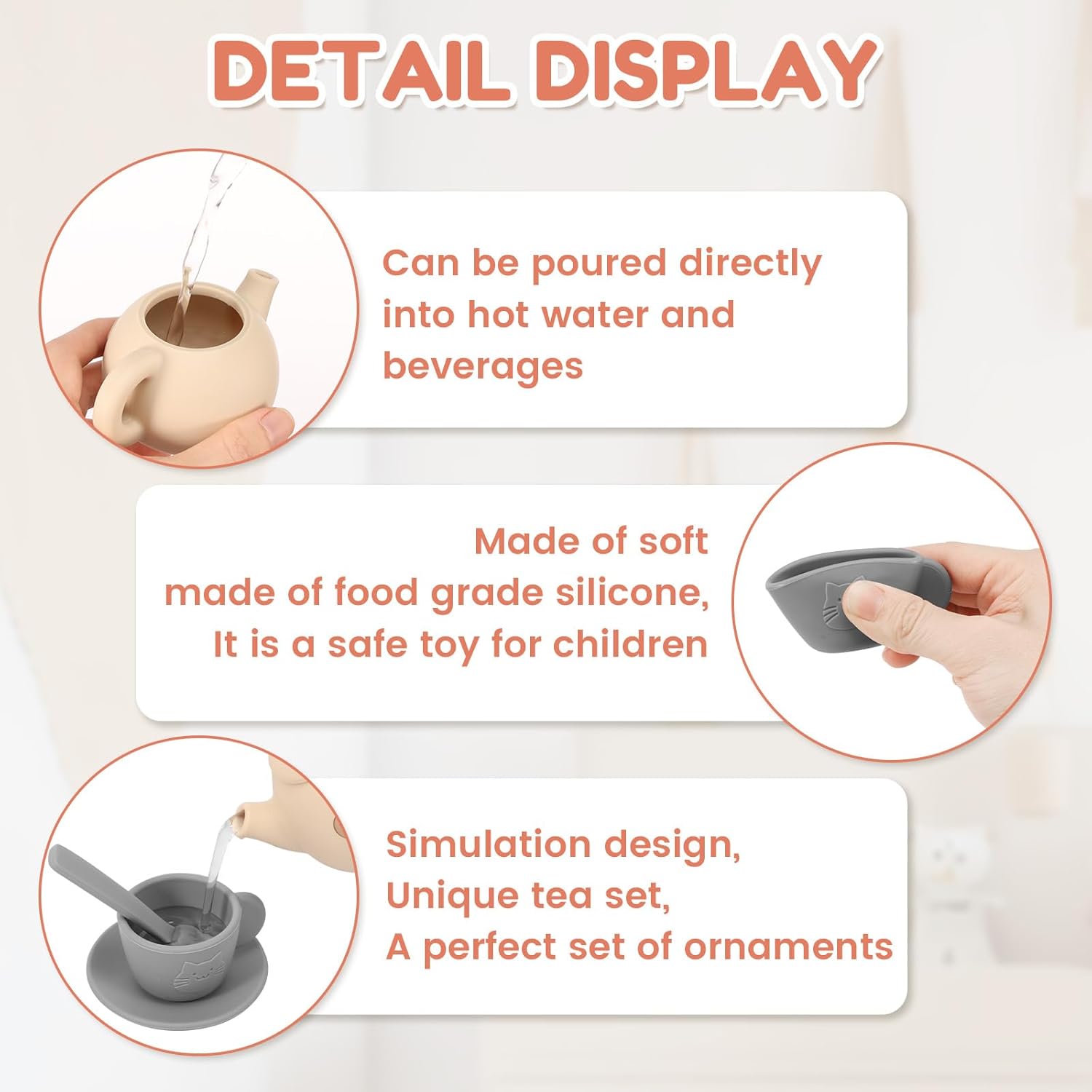 Materiale sicuro e durevole: il servizio da tè per bambini è realizzato in silicone alimentare, resistente al calore, rosicchiabile e sterilizzabile per garantire durata e sicurezza durante il gioco, e può essere versato direttamente in acqua calda e bevande per i bambini. Questo set da tè per bambini è morbido, flessibile, resistente e infrangibile. È un regalo ideale per i bambini da esplorare e interagire durante il gioco e un giocattolo sicuro per i bambini. Adatto al microonde e alla lavastoviglie. Facile da pulire con acqua tiepida e detergente delicato, facile da pulire 14 pezzi servizio da tè per bambini in silicone: set da tè per bambini in silicone 14 pezzi include 1 teiera, 1 coperchio per teiera, 4 tazze, 4 sottobicchieri, 4 cucchiai. Set da tè reale e completo con teiera, tazze da tè, sottobicchieri e cucchiai; sorprendi i tuoi genitori e amici con il tè pomeridiano Skills di sviluppo: figurare come funziona è una delle migliori parti dei giochi afternoon, questo set da tè per la casa ad alta simulazione può essere utilizzato come giocattolo preschool per aiutare i bambini a migliorare le abilità di vita basiche, le abilità sociali, la recognitione dei colori, l'indipendenza e la fiducia personale, promuovere la coordinazione della mano e la creatività degli occhi, Edizione e immaginazione. azione Maggiore interattività: i bambini possono imparare a utilizzare il set da tè con la famiglia/gli amici e organizzare un delizioso tea party giochi di ruolo da cucina, offrendo loro un'esperienza di gioco intensa e piacevole. Perfetto per invitare gli amici a un'immaginaria tazza di tè pomeridiano. Con emozionanti scenari di tea party, i bambini possono liberare la loro creatività, sviluppare la loro immaginazione e impegnarsi in emozionanti avventure di gioco di ruolo Regalo ideale: i vostri bambini godranno ore di intrattenimento fingendo di preparare un tè pomeridiano all'ora del tè. I set da tè in silicone possono essere davvero accattivanti. Possedere un set da tè offre ai bambini un'altra opzione affascinante per il divertimento senza schermo elettronico. Il simpatico set da tè porterà infinite ore di divertimento ai tuoi bambini ed è un ottimo regalo per feste di compleanno, festa dei bambini, Natale, Halloween, Ringraziamento e Capodanno Mini decorazione decorativa: design simulato e set da tè unico non è solo un giocattolo in silicone, ma anche un set perfetto di mini decorazioni per la cameretta dei bambini/bambini